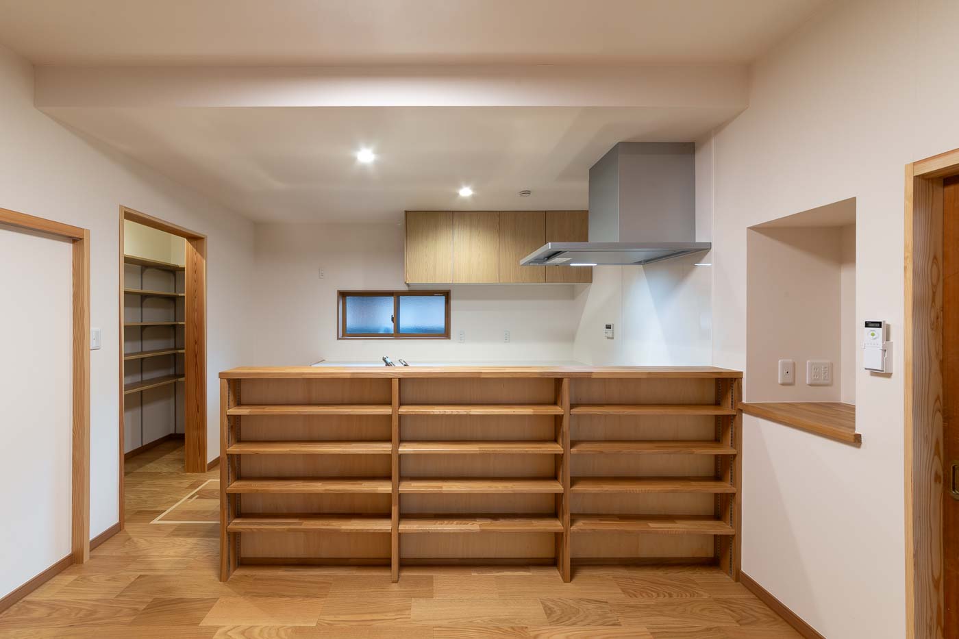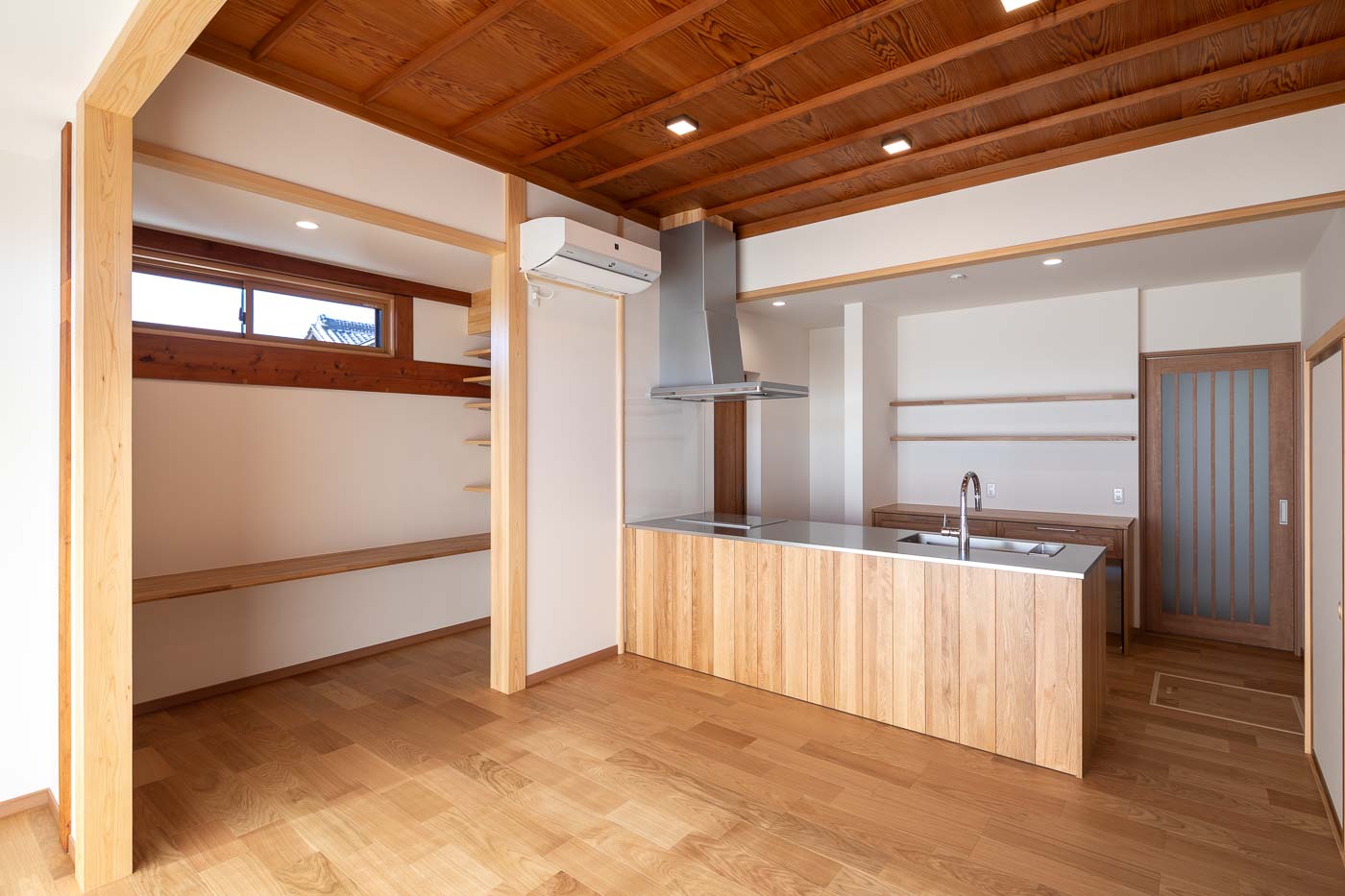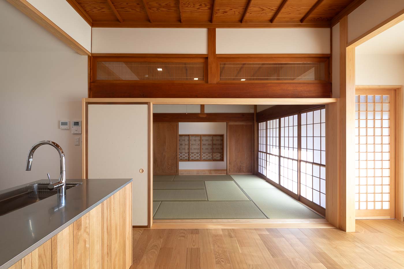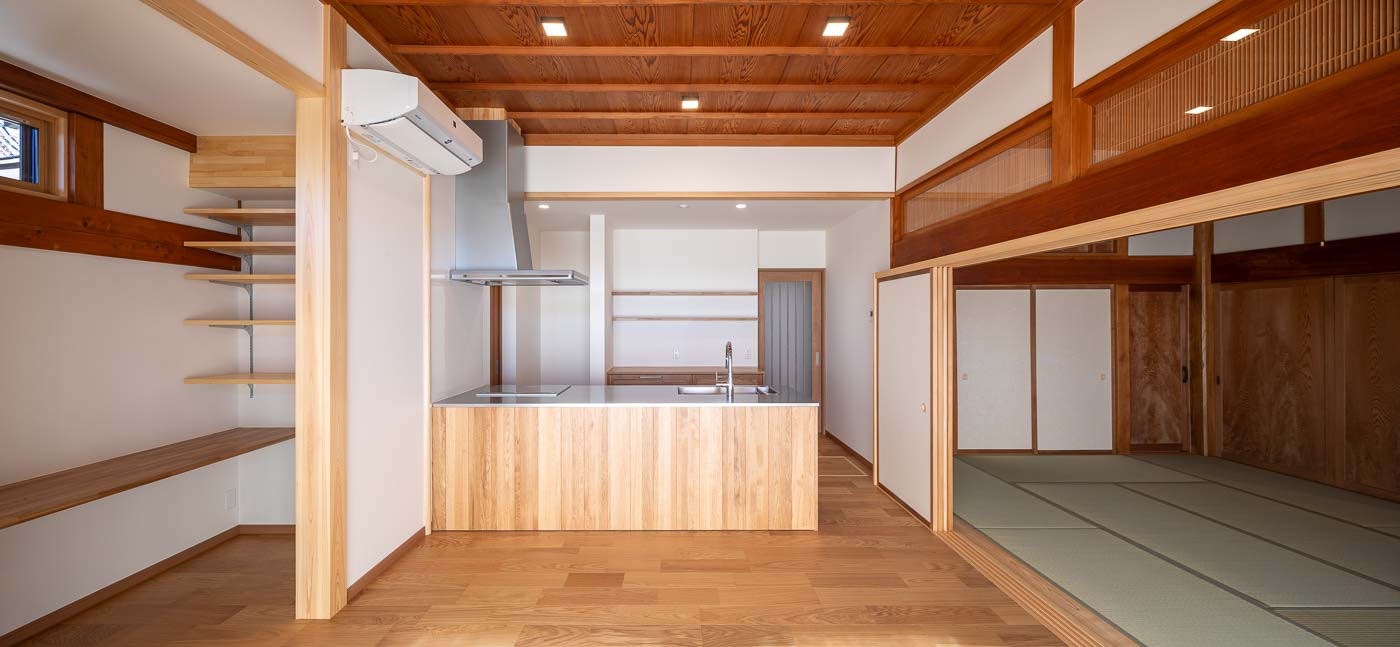 南側の客間空間は、廊下を含めて子世帯の生活の中心となる、27帖ほどの広々としたLDKへ、キッチンはアイランドキッチンとし食品庫も設け、小さなお子さん3人の子育て世帯がゆとりある空間で生活できる設えとしました。浴室・トイレ等の水廻りは寝室に隣接した北側へ集約しました。