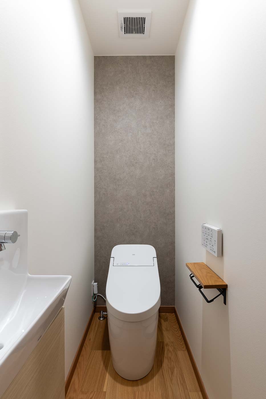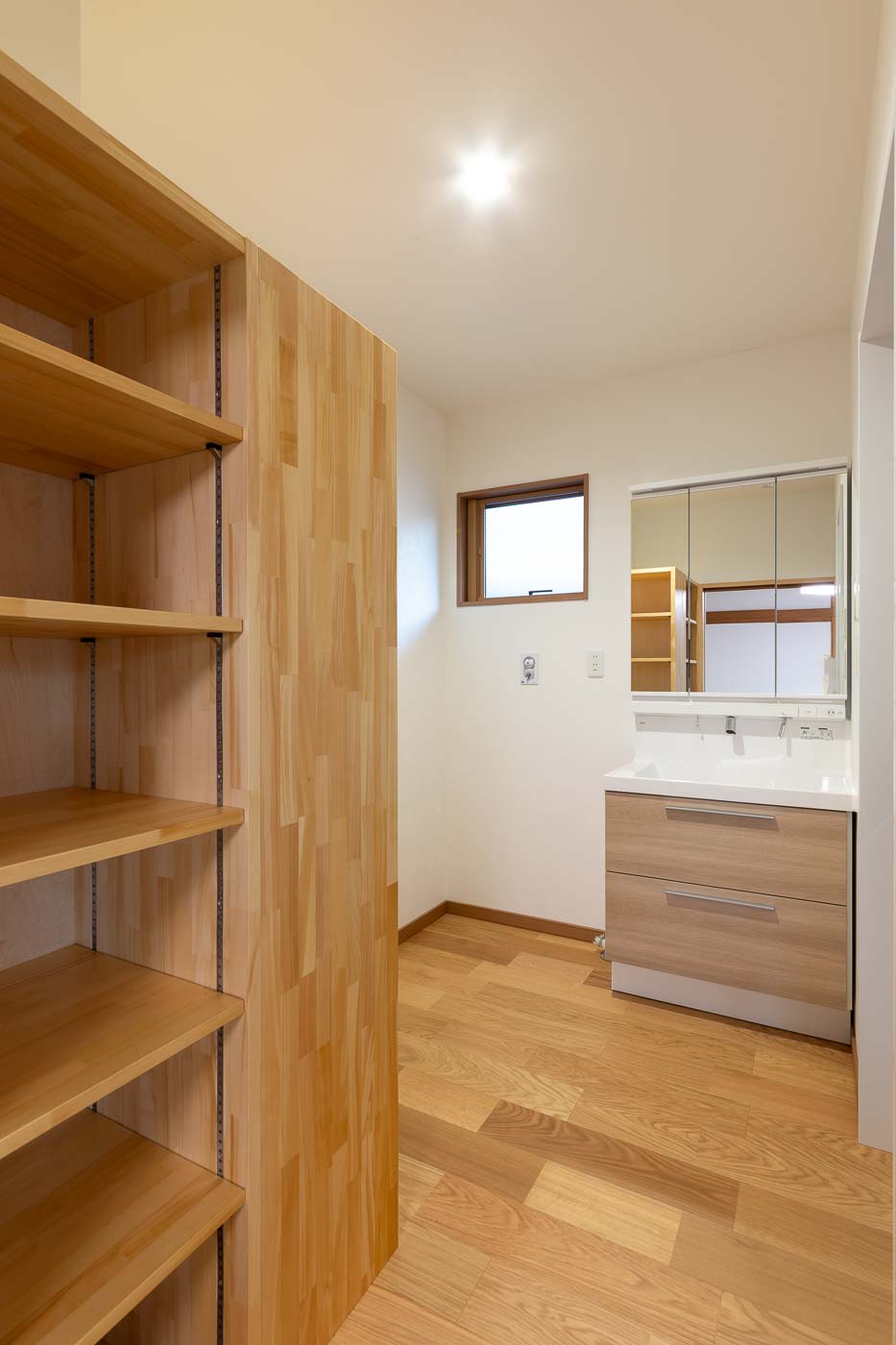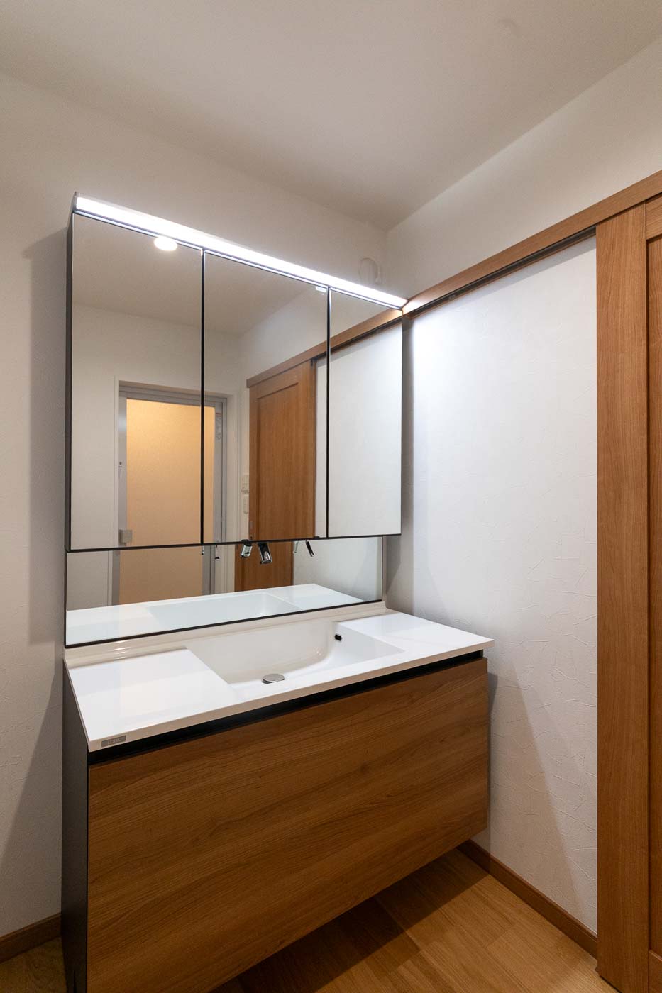 南側の客間空間は、廊下を含めて子世帯の生活の中心となる、27帖ほどの広々としたLDKへ、キッチンはアイランドキッチンとし食品庫も設け、小さなお子さん3人の子育て世帯がゆとりある空間で生活できる設えとしました。浴室・トイレ等の水廻りは寝室に隣接した北側へ集約しました。