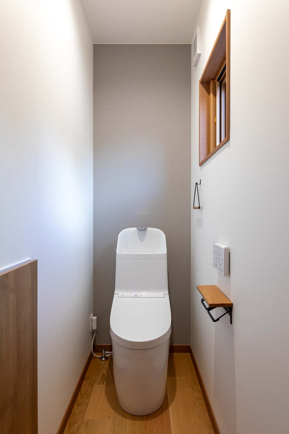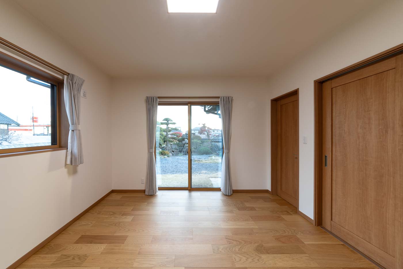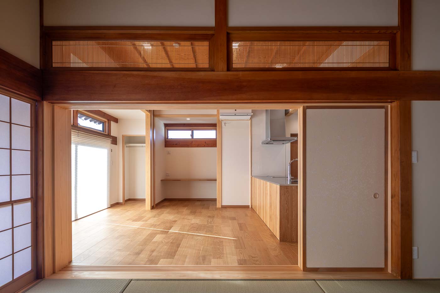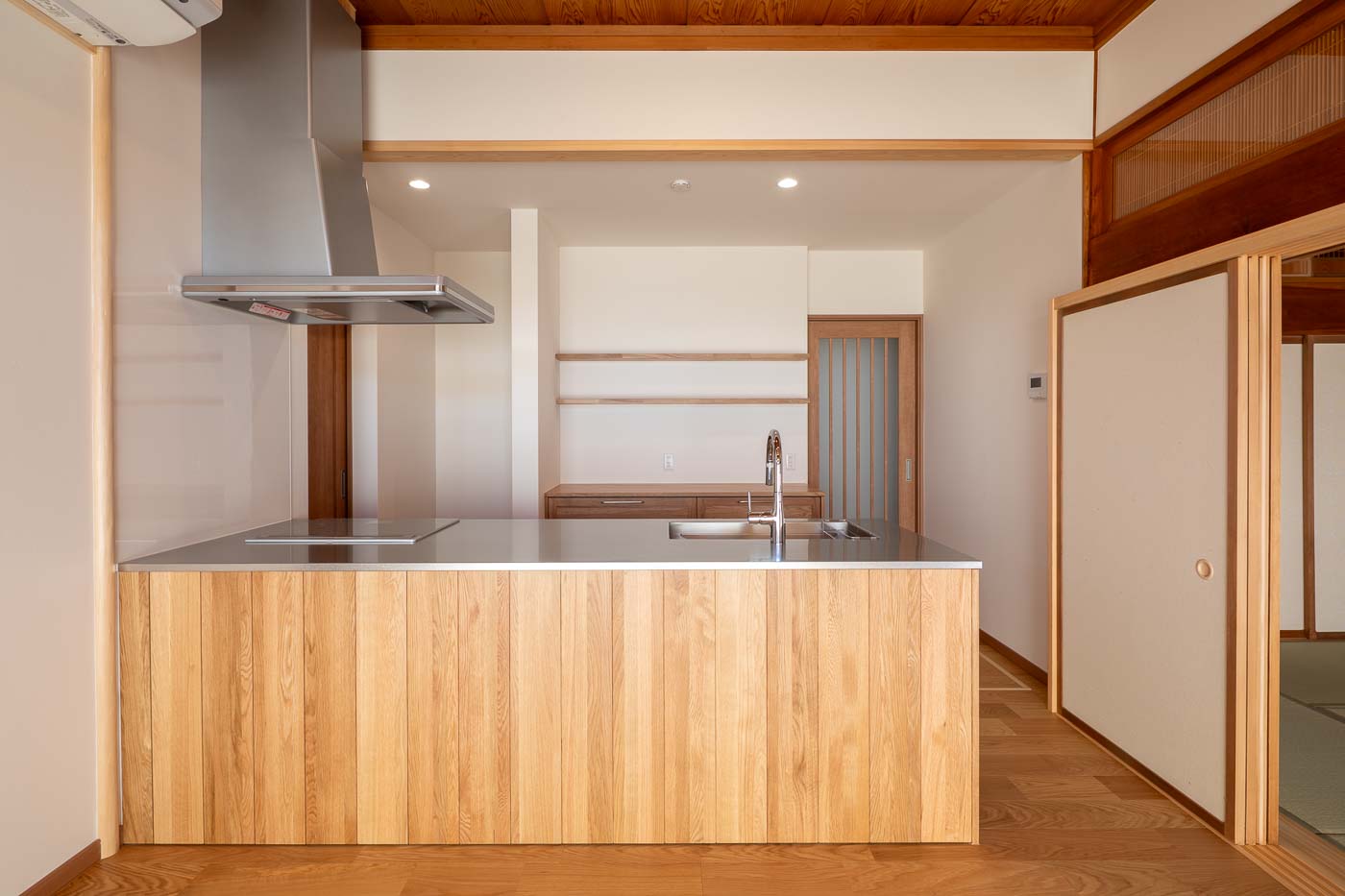 床は桧材、壁は珪藻土塗の自然素材とし、天井の竿縁天井及び、差し鴨居は再利用。かつての客間の書院は玄関ホールへ移設しました。リノベーションにより、和の素材を活かした洋の生活スタイルが可能となり、新旧の木材が混じりあった一体感のある新たな空間へと変化しました。