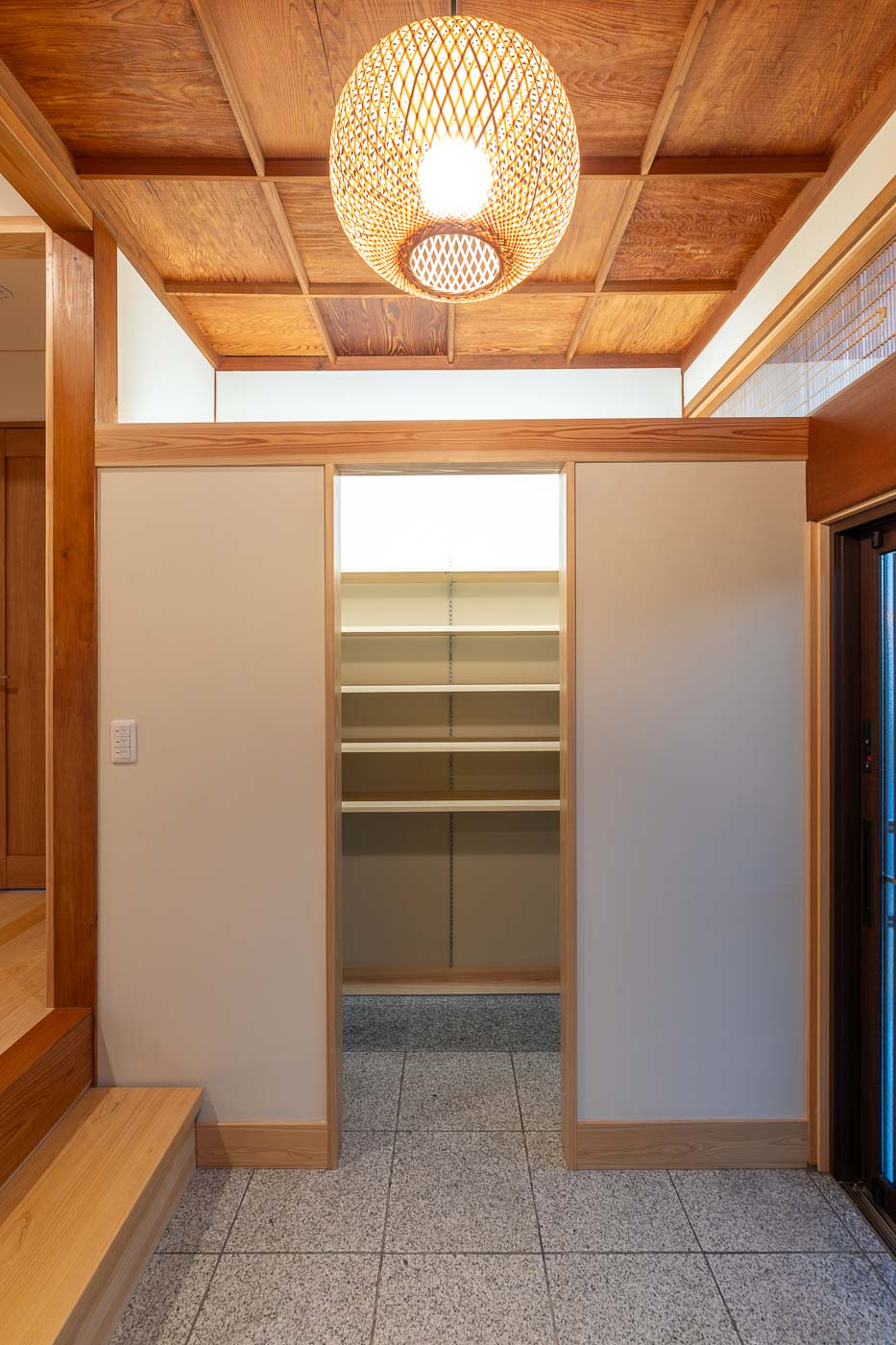 母屋は、昭和56年に施主の祖父(故人)が建てられ、築41年(令和4年時点)をむかえます。木造2階建・入母屋屋根の重厚な日本家屋で、室内は大きな玄関を入ると南側に八帖二間(客間空間)と和室の前面には4尺幅の廊下が鍵の手に廻り、大黒柱や差し鴨居が存在感を示します。そして家族の生活の場は、玄関の北側及び東側にレイアウトされた典型的な日本家屋の間取りです。