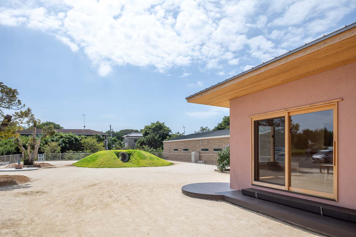園庭は木々を植え、起伏のある丘や砂場、水遊びの水盤など子供たちが日々様々な発見や体験ができる設えとします。野趣に富んだ園庭と自然素材による建物が一体感を感じるような環境づくりを探究しています。