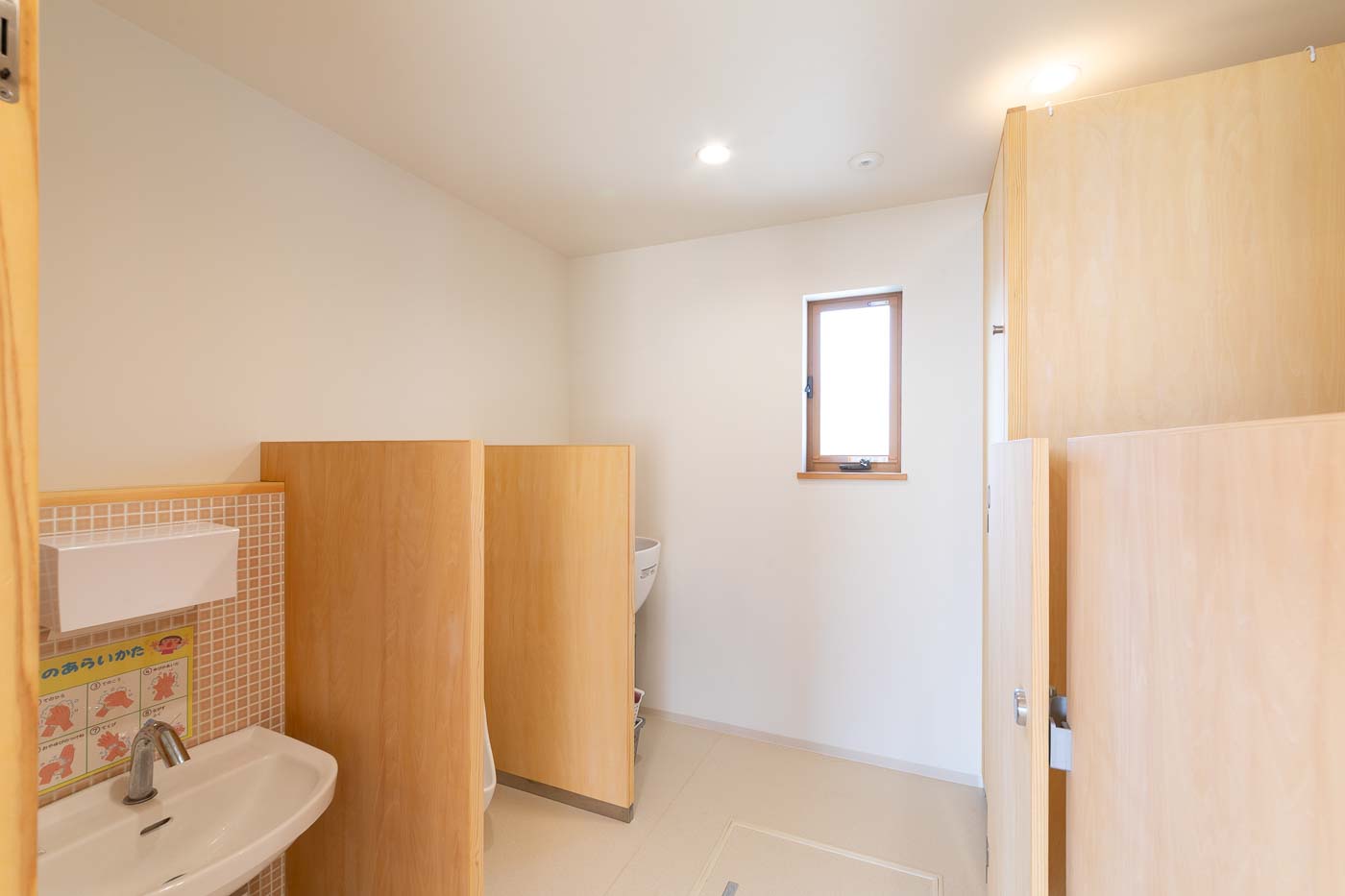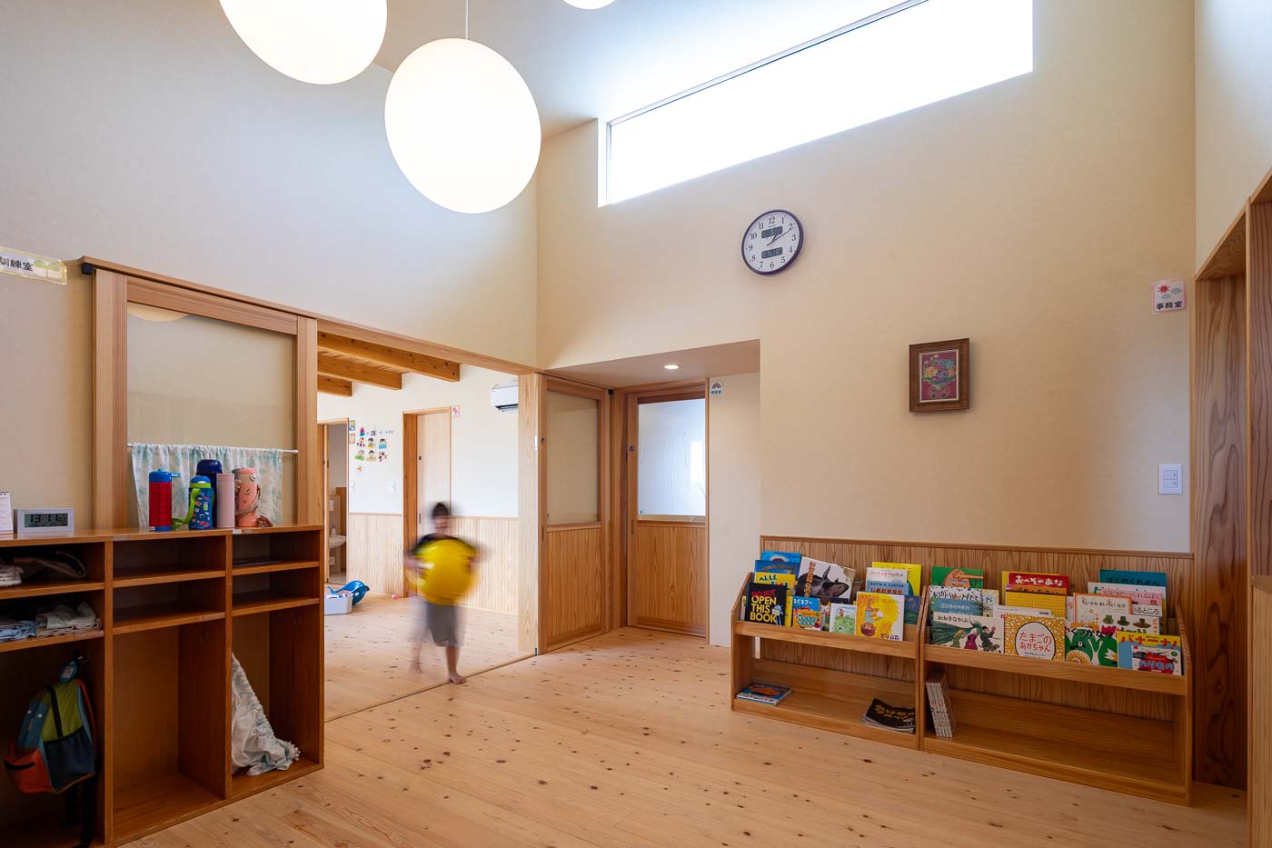 「あおば」の子供たちと萬徳寺保育園の子供たちが、日常的に交流できる環境づくりが設計のおおきなテーマとなりました。幼児期の時期から障がいのある子どもと共に生活することで、お互いに様々な学びや体験・経験することが、インクルーシブな社会の実現へと繋がって行くのではないかと思います。障害を持つ子どもたちの空間と、保育園児たちの空間と、テラスや園庭は交流の場となるようゾーニングしました。