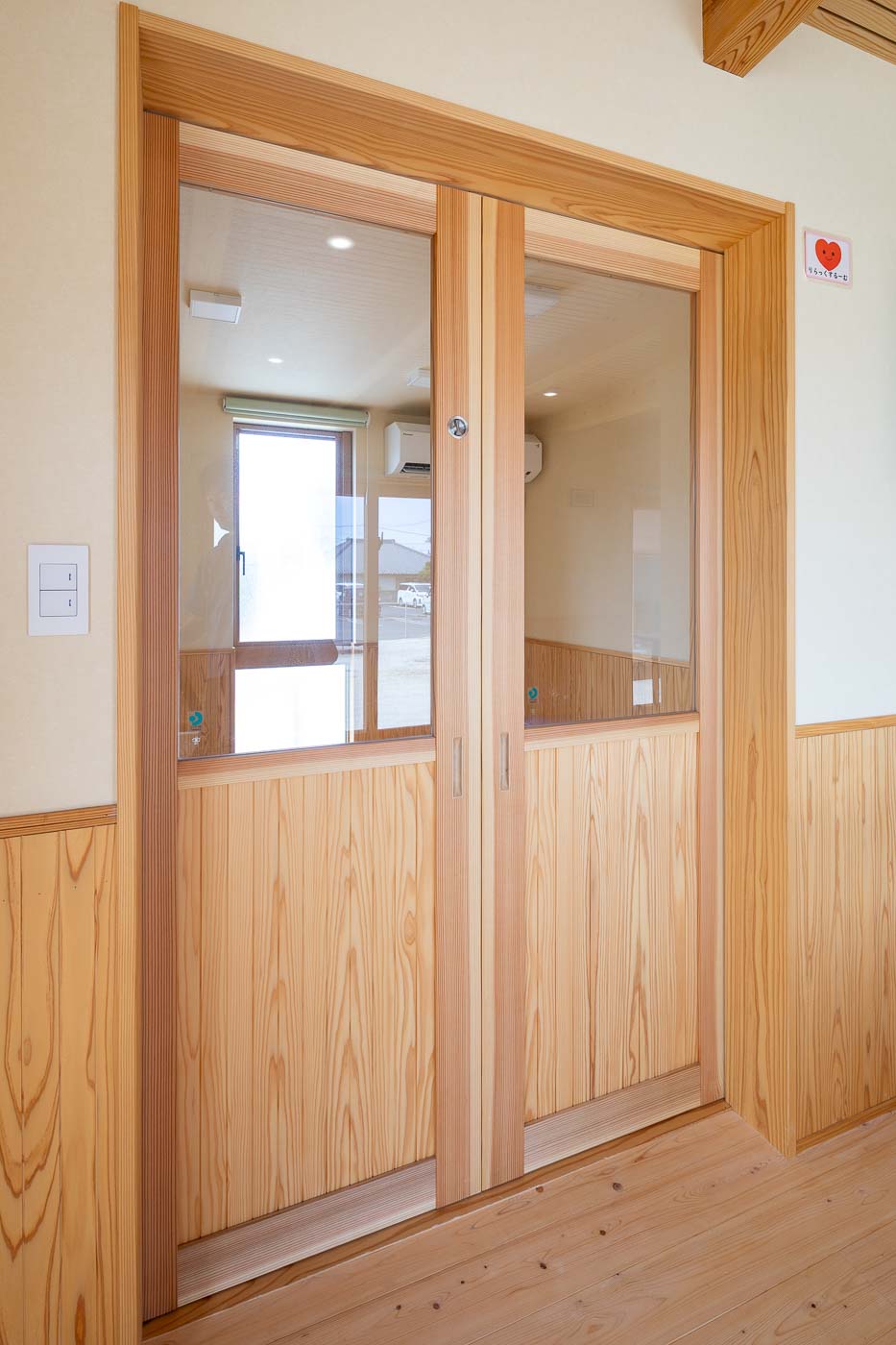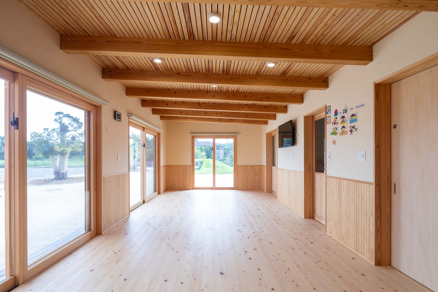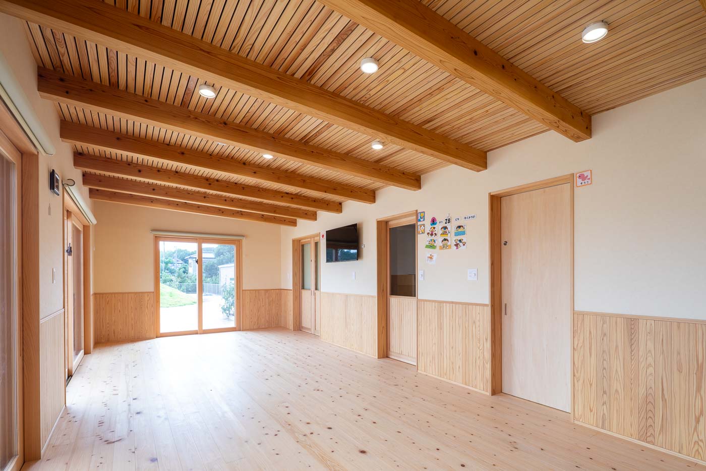 「あおば」は、定員10名の児童発達支援施設です。建物は木造平屋建ての小規模な建物で、茨城県産材の杉・檜を内外装にし、天井が高くのびのびした温かみのある空間です。