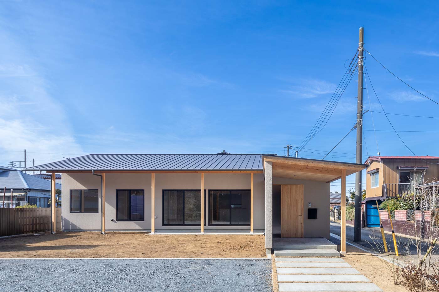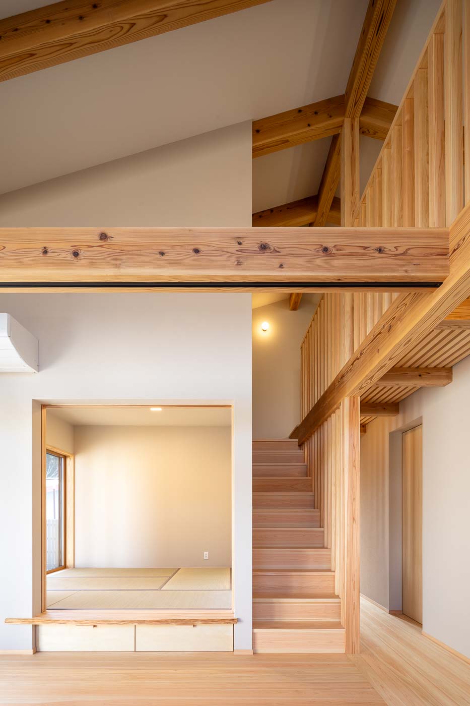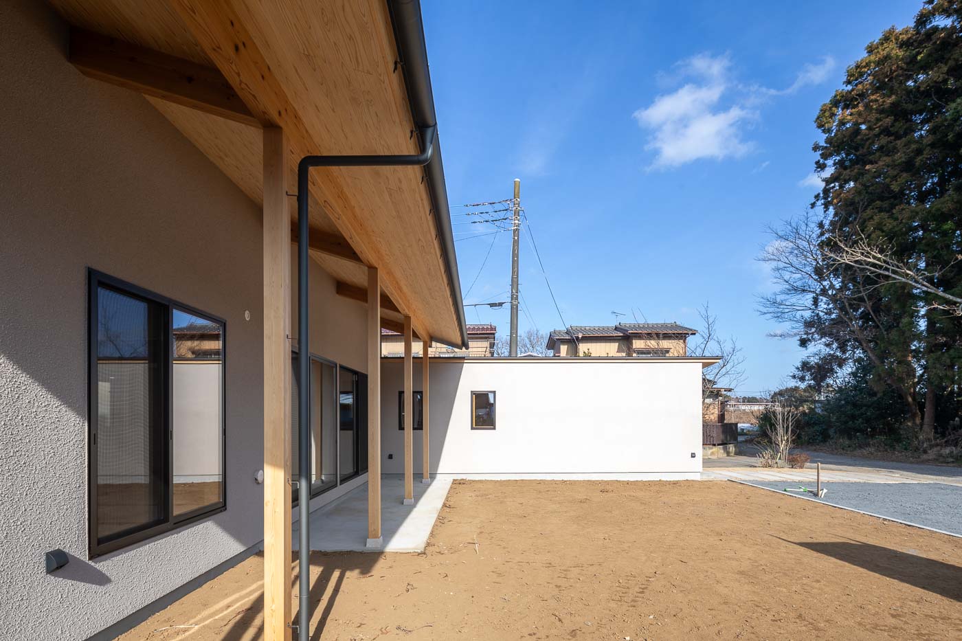立地は鹿島神宮駅に程近く、北浦と鹿島灘の間にある鹿島台地に位置します。敷地は昭和50年代ごろに宅地開発された住宅地の一角で、比較的広い敷地(2区画分の敷地)に計画されました。建物正面となる南側は平地林に面していて陽当りが良く、比較的静かな場所です。プランはL型で、吹抜けのある開放的なLDと、キッチン→洗面室→浴室と繋がる効率的な家事動線が特徴です。インテリアとしては、LDの空間に、無垢の梁や柱を現した自然素材によるシンプルな素材感が、温かみのある和の雰囲気を醸し出しています。外部空間については、軒の出を深くしています。風雨から建物を守り、夏の日射を遮省するエネ効果と共に、自然との一体感を感じる暮らしに繋がります。