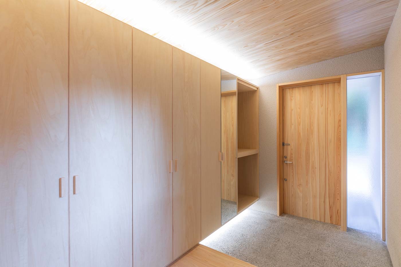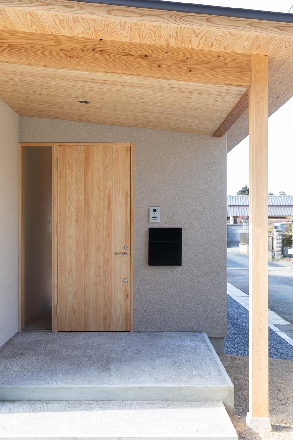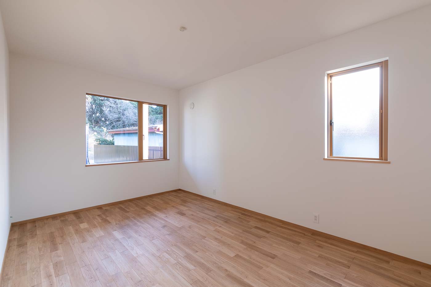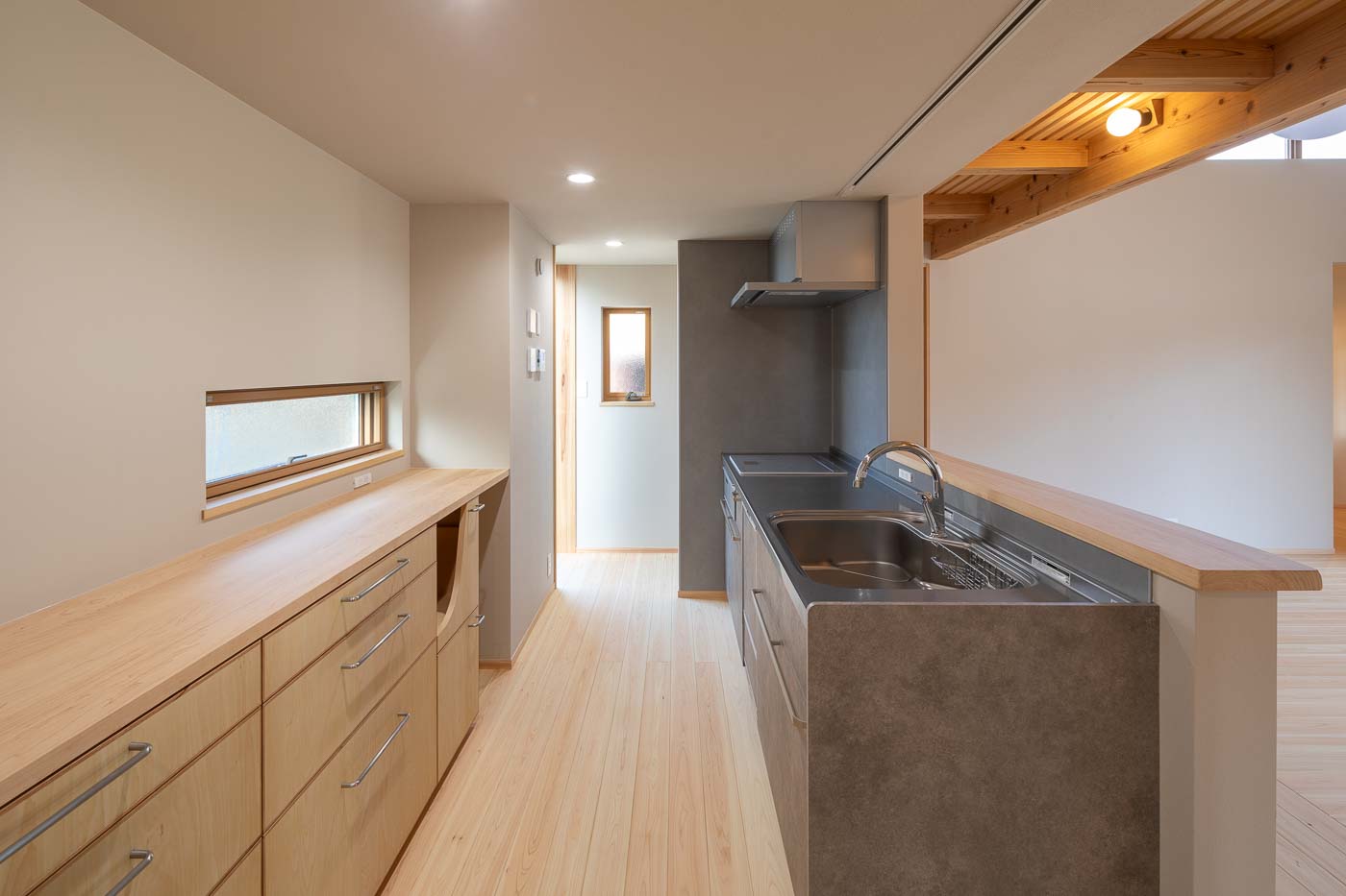 立地は鹿島神宮駅に程近く、北浦と鹿島灘の間にある鹿島台地に位置します。敷地は昭和50年代ごろに宅地開発された住宅地の一角で、比較的広い敷地(2区画分の敷地)に計画されました。建物正面となる南側は平地林に面していて陽当りが良く、比較的静かな場所です。プランはL型で、吹抜けのある開放的なLDと、キッチン→洗面室→浴室と繋がる効率的な家事動線が特徴です。インテリアとしては、LDの空間に、無垢の梁や柱を現した自然素材によるシンプルな素材感が、温かみのある和の雰囲気を醸し出しています。外部空間については、軒の出を深くしています。風雨から建物を守り、夏の日射を遮省するエネ効果と共に、自然との一体感を感じる暮らしに繋がります。