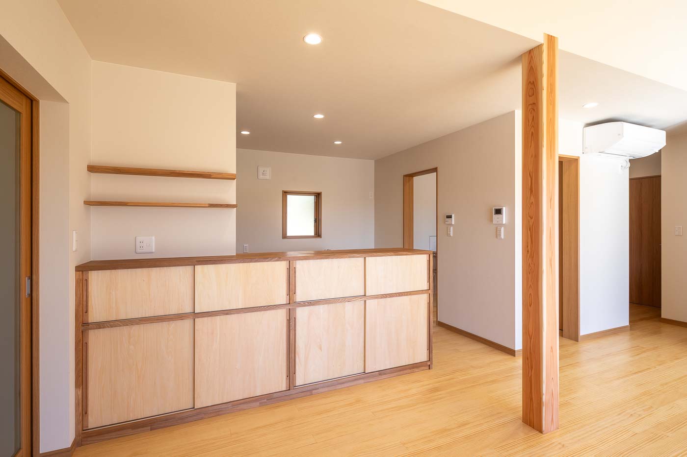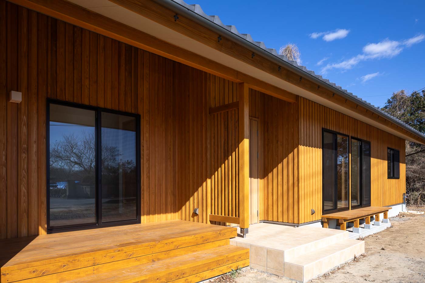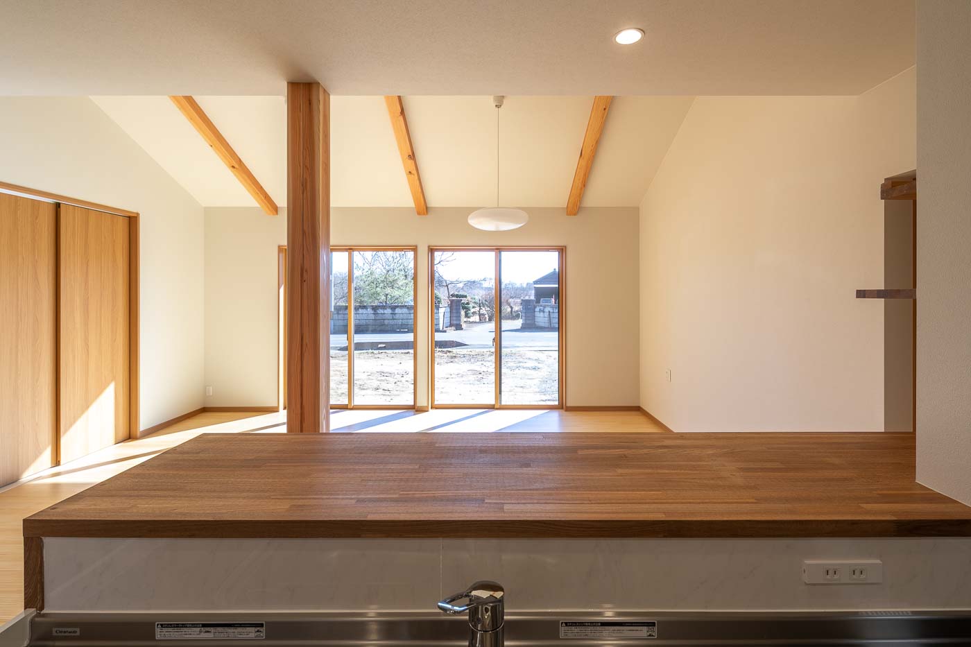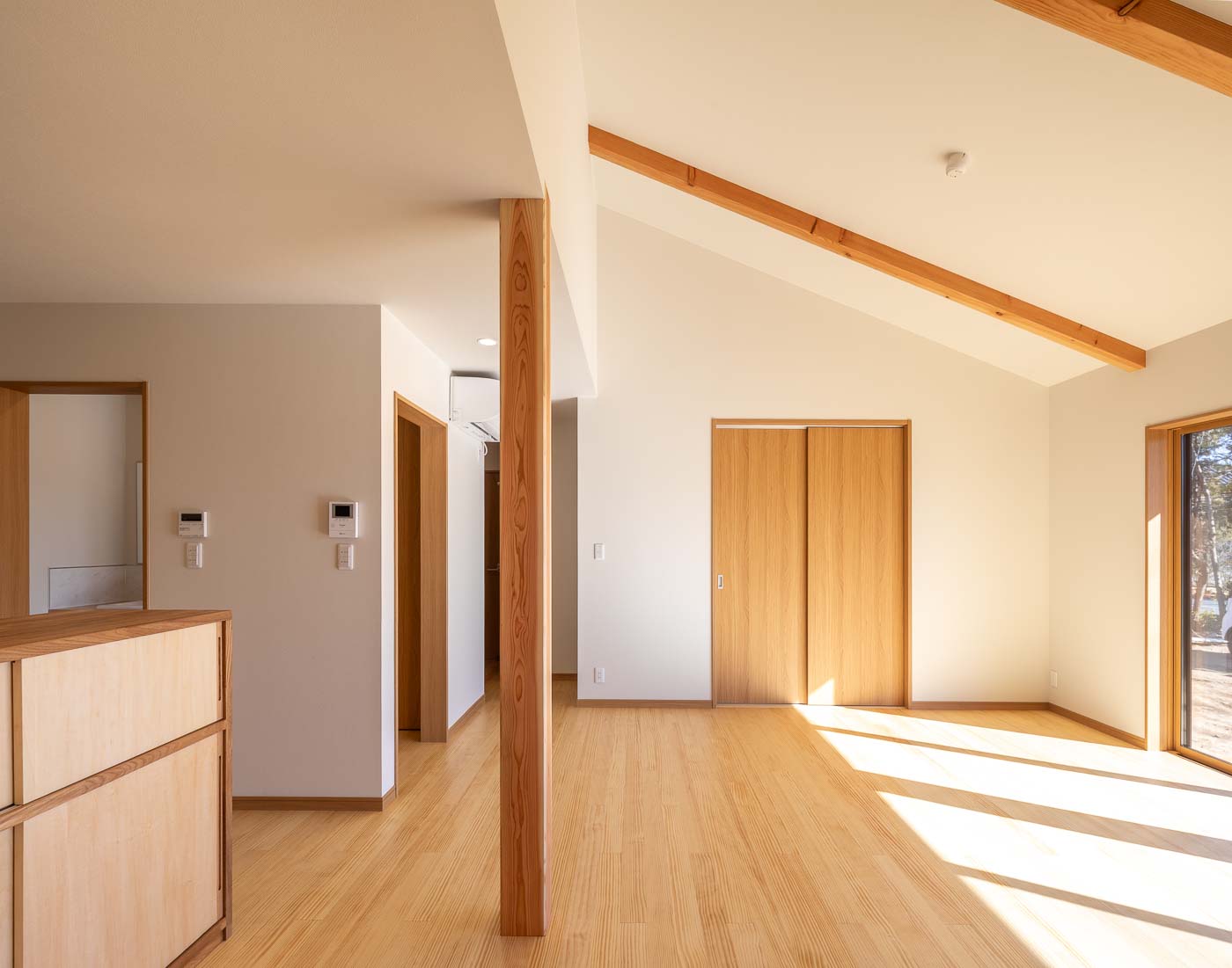 室内は無垢の柱や梁を現しとし、自然の持つ温かみのある雰囲気を創出しています。外部と内部の繋がりをもたせるため、デッキテラスの設置や軒を深くするなど、雨天時や夏の日射にも効果的です。