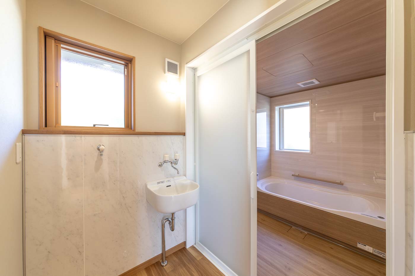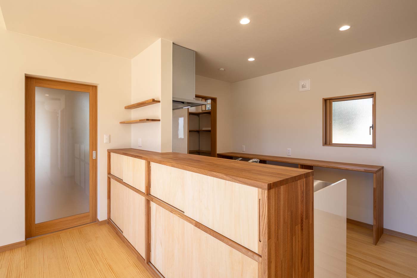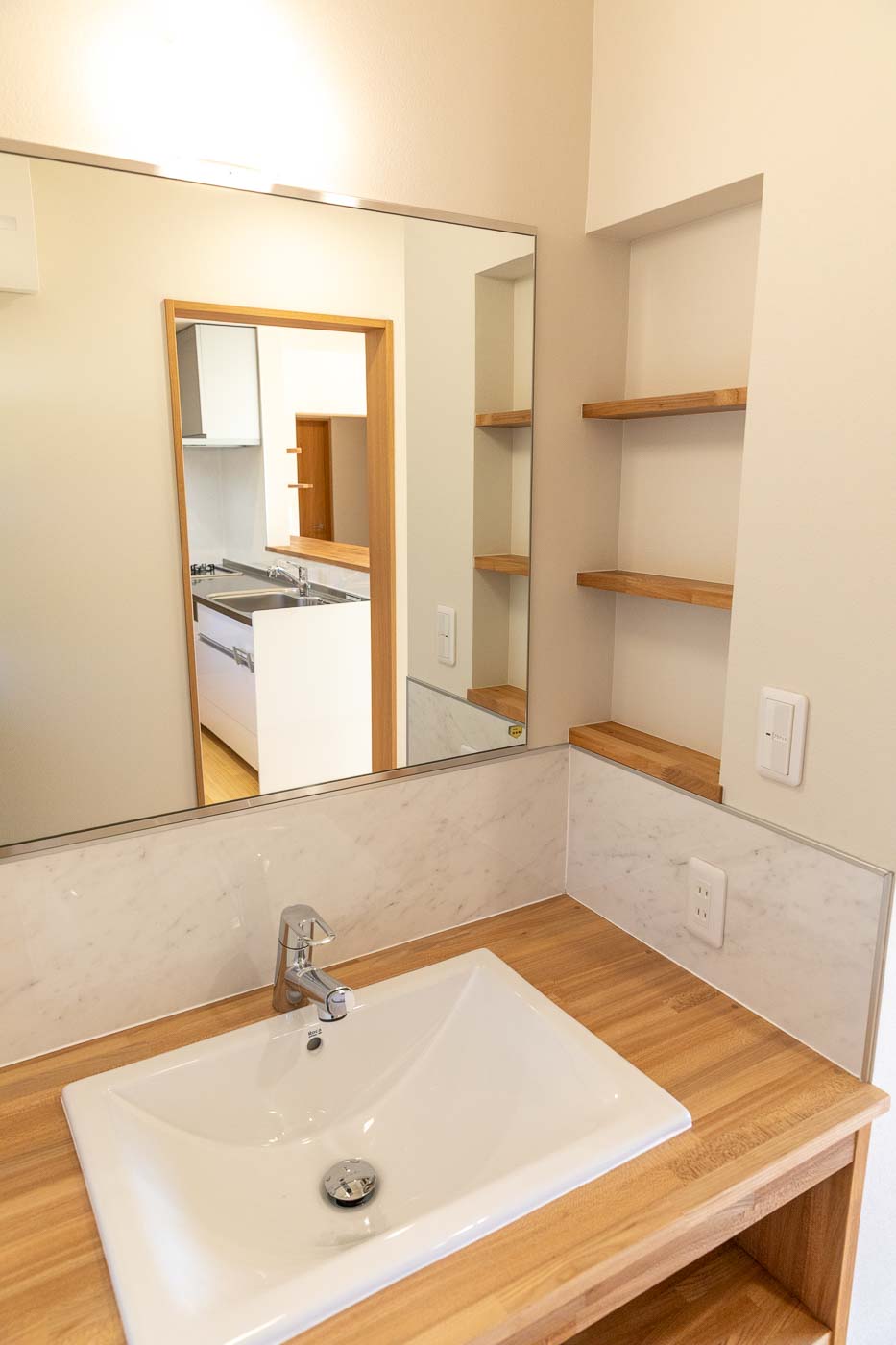 家族構成は30代のご夫婦と保育園に通うお子様の3人家族です。プランは開放的なLDと一体となったキッチン、そこから洗面室→脱衣室→浴室と繋がる効率的な家事動線としており、またお子さんがのびのびと動きまわれるよう、回遊性のある間取りとしています。