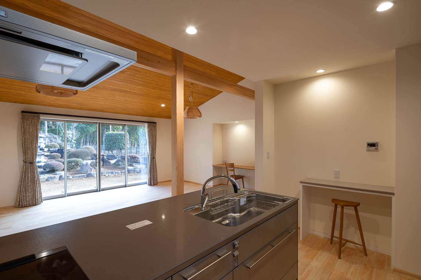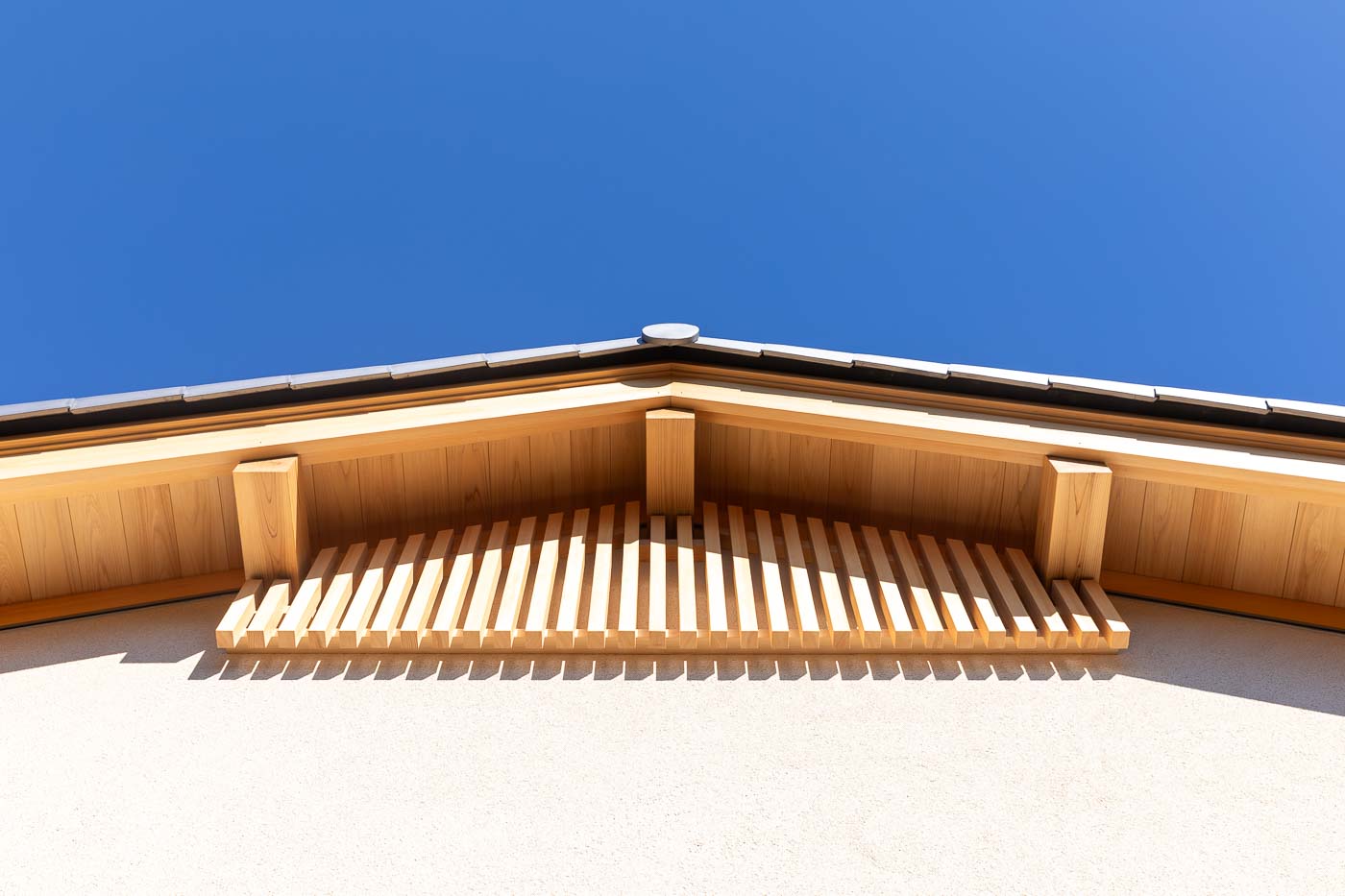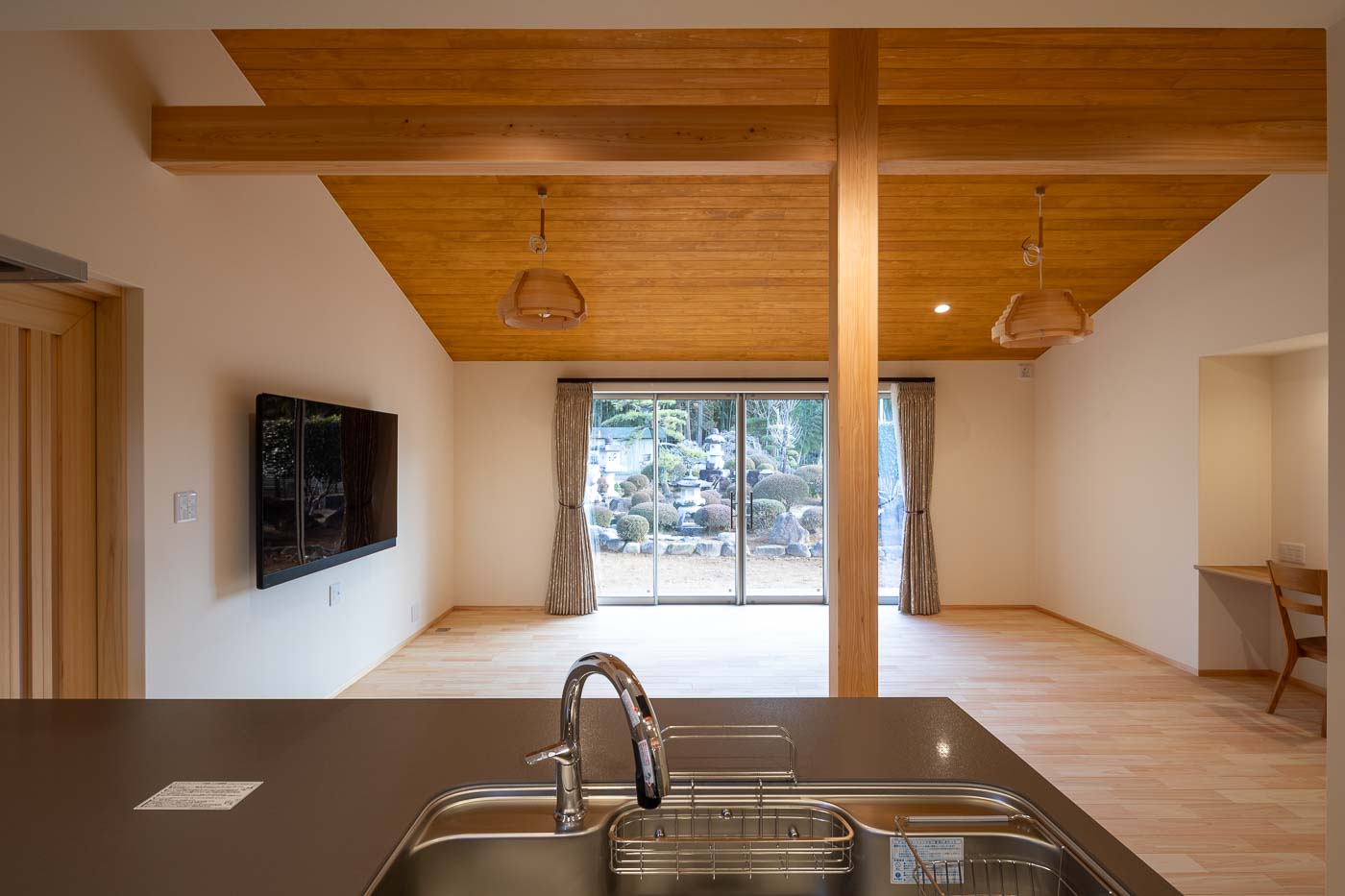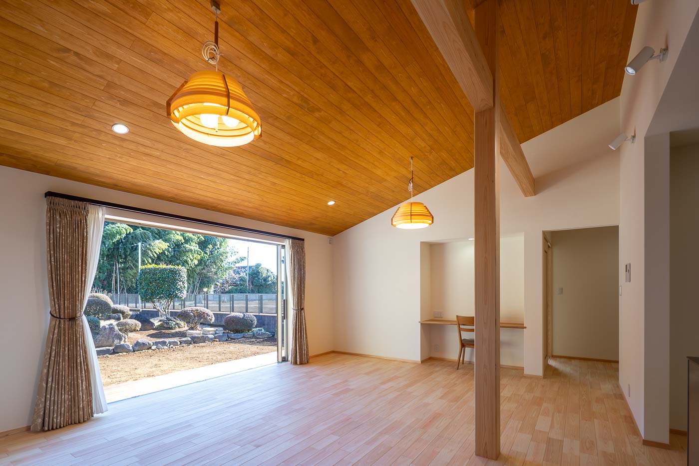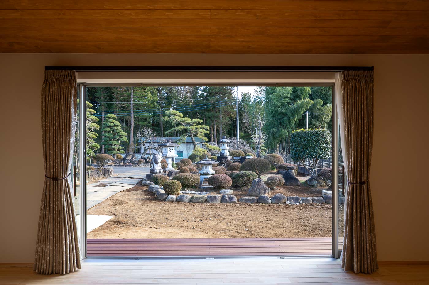無垢の柱・梁を現し、ヒノキの床と漆喰壁で仕上げた室内は、自然素材の調湿性と温もりに包まれます。日本庭園側にはデッキテラスとフルオープンサッシを設け、内外が連続する空間体験を創出。深い軒は夏の日射を遮り、身体にも環境にもやさしい住環境を実現しています。