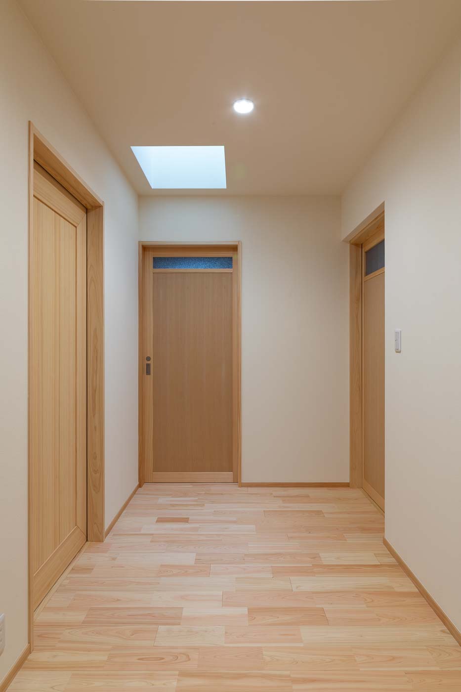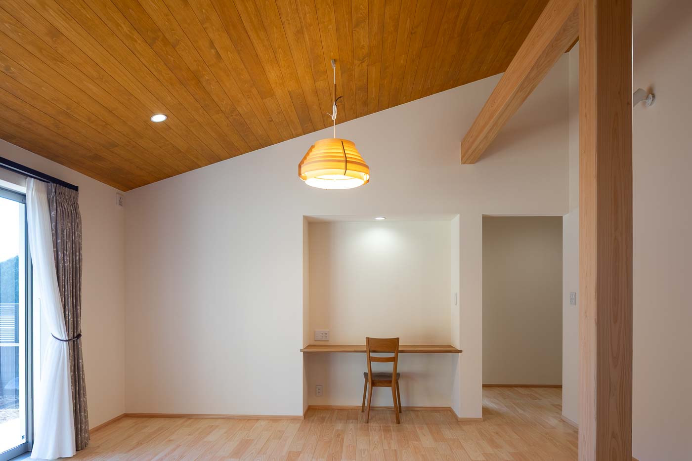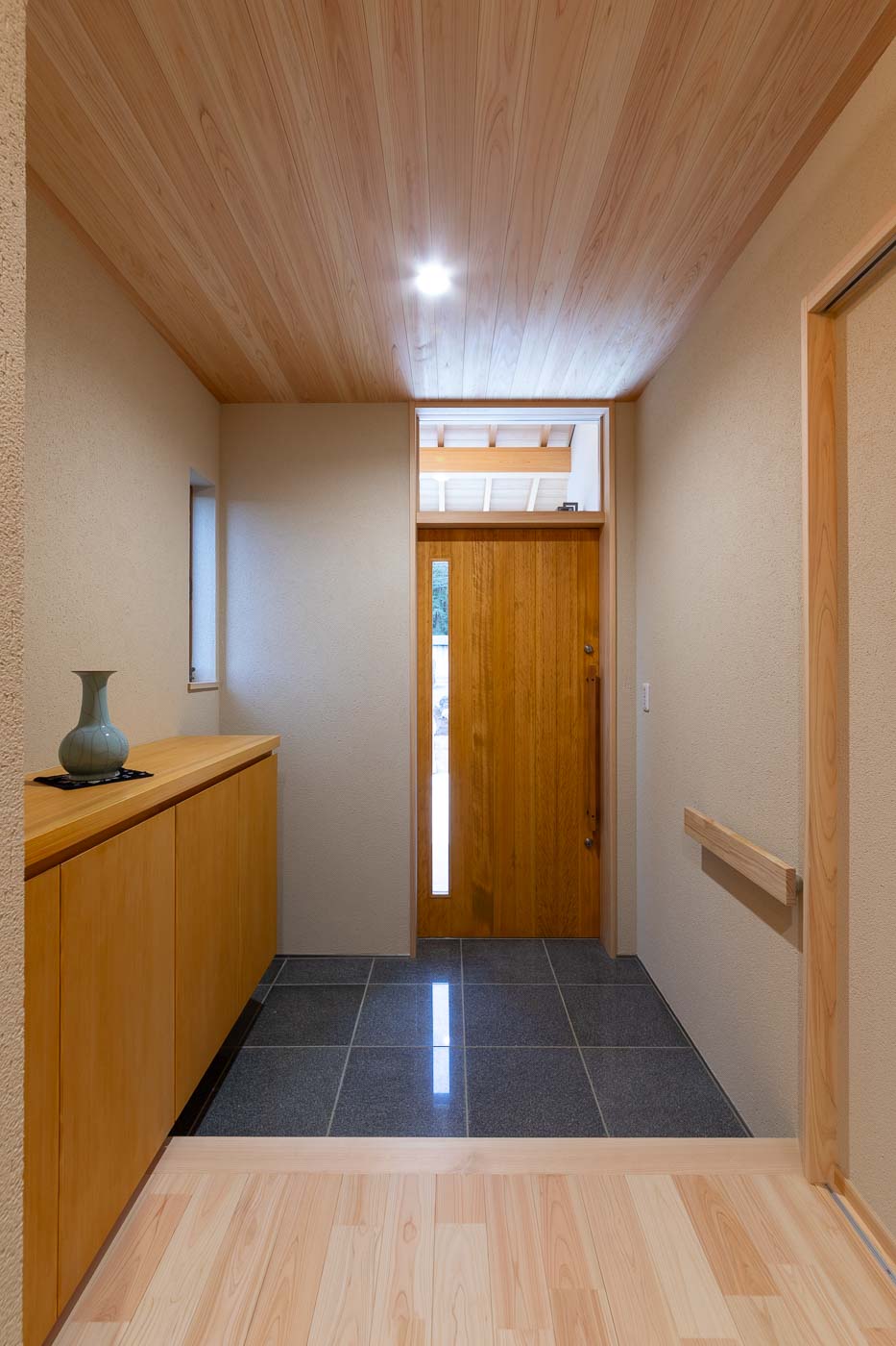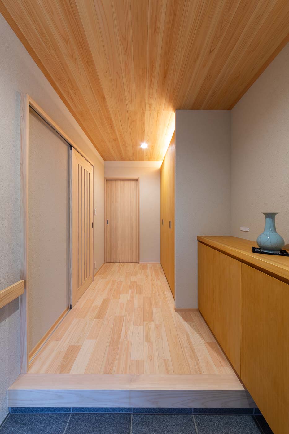 玄関ポーチから室内まで段差を排し、建具はすべて引戸。車椅子での通行幅を確保し、トイレや洗面室も余裕ある寸法としました。大切なのは“介護”のイメージではなく、心地よい住まいでありながら、身体の変化に静かに備える構成です。