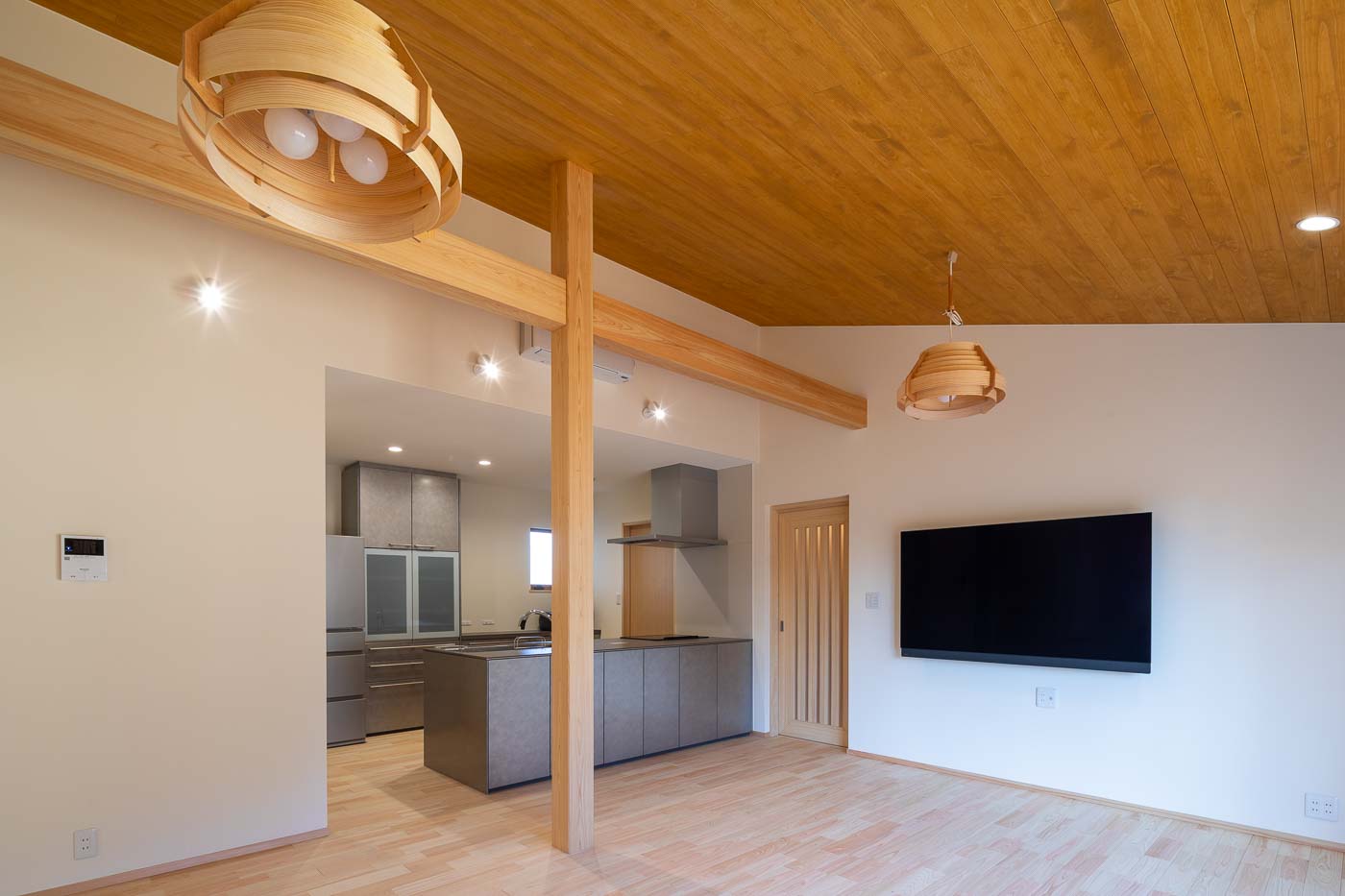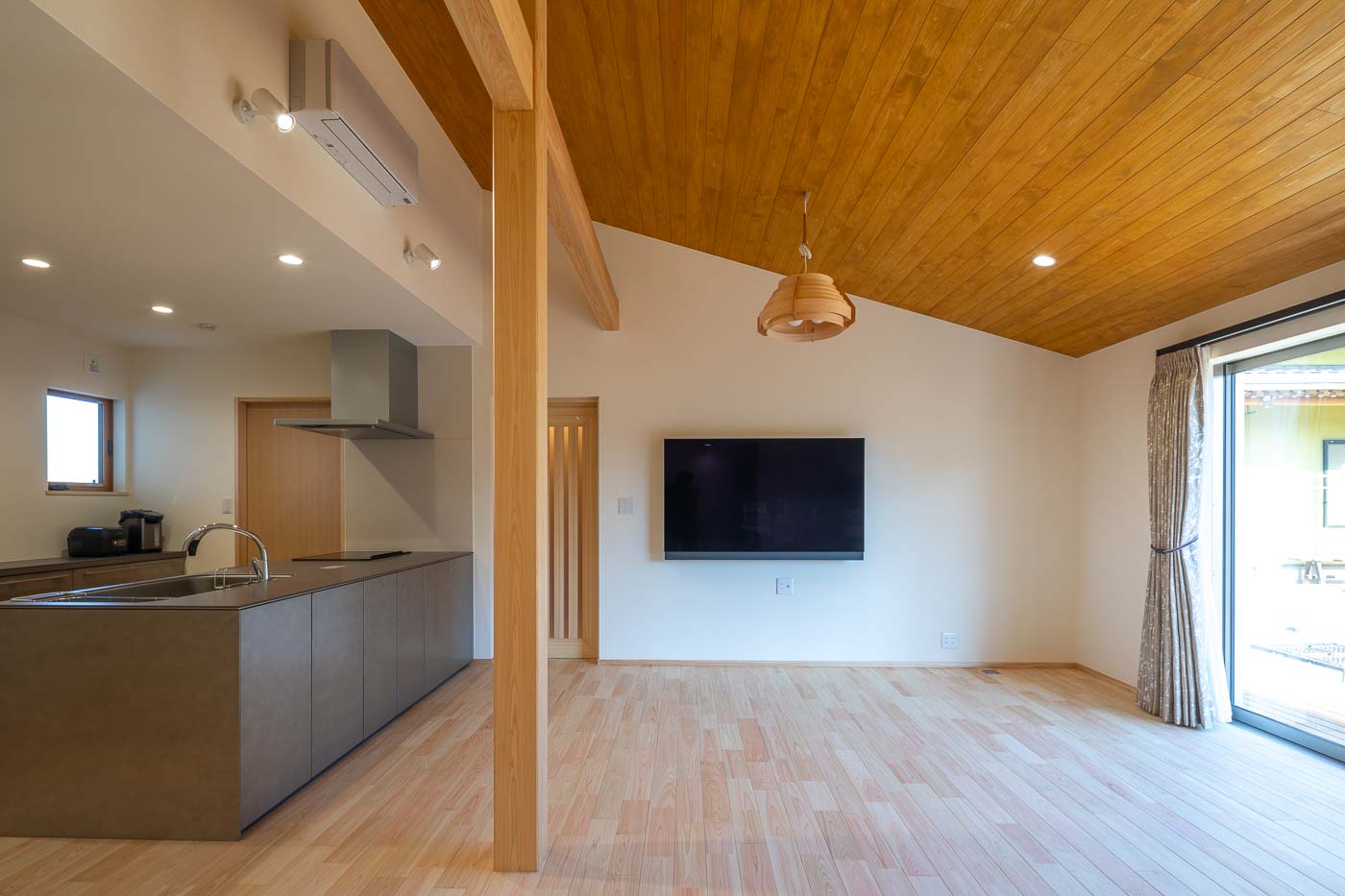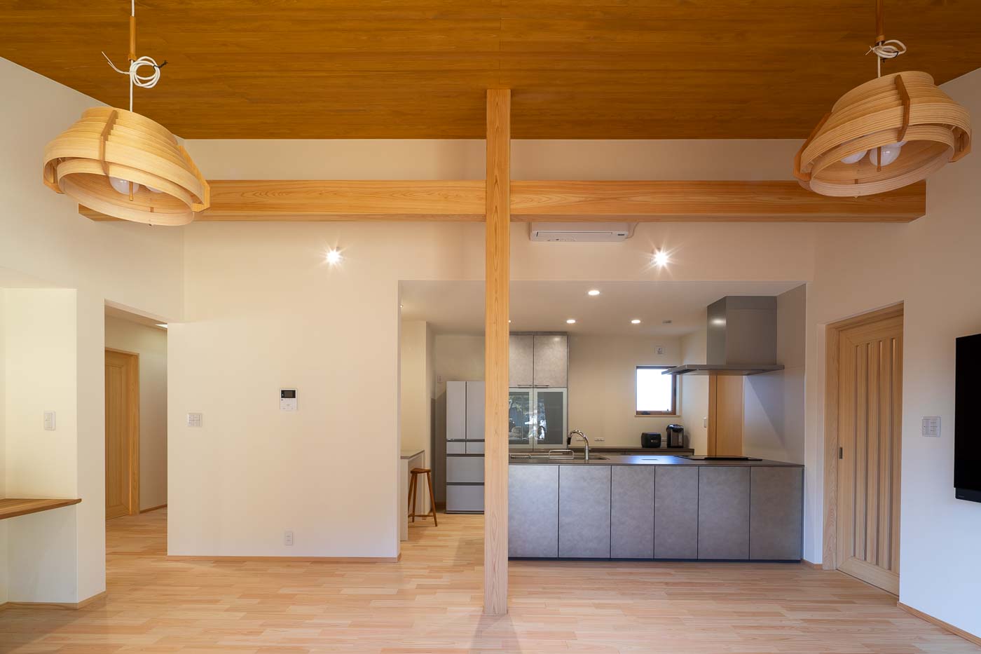 建物中央には大きなワンルームのLDKを配置し、廊下を設けず移動負担を軽減。視線が抜け、家族の気配が感じられる開放的な平面としました。