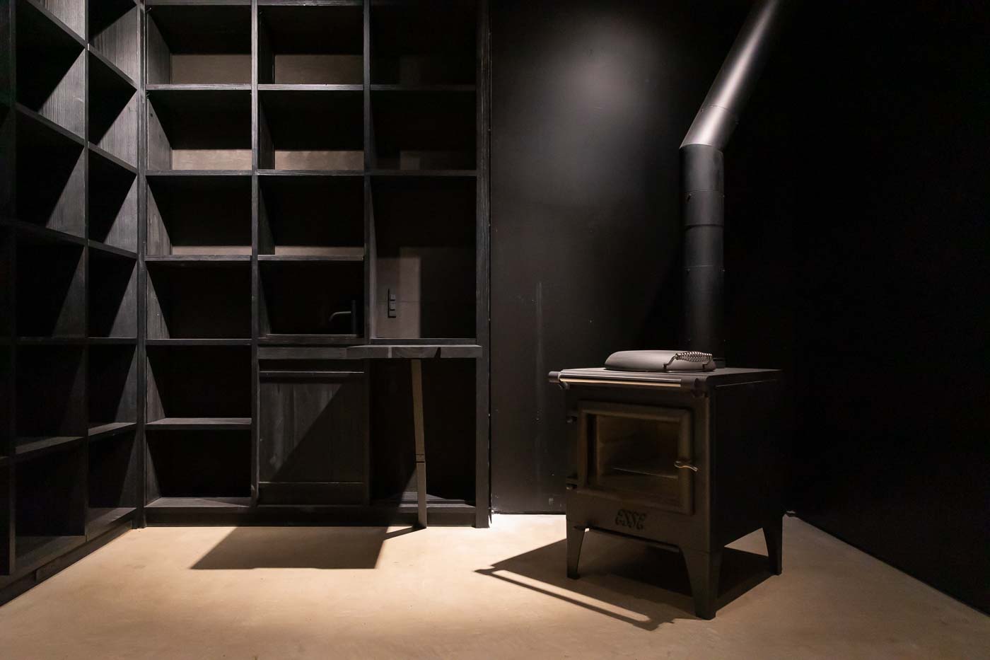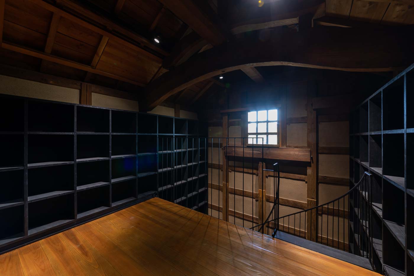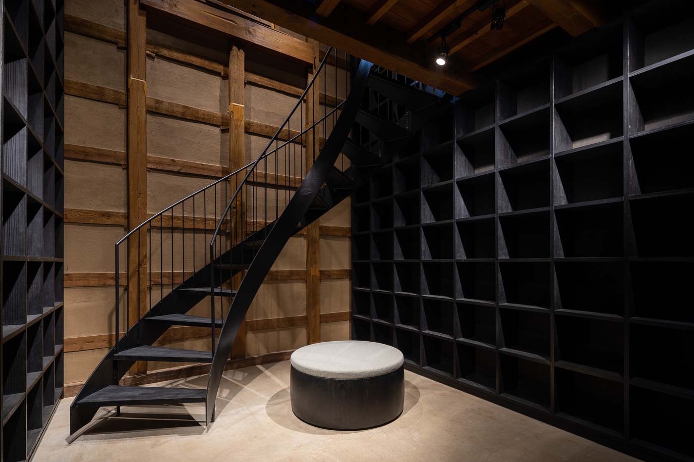 重厚な扉を開けて中に入ると、杉板を黒く塗装した本棚(最大約4000冊の蔵書)が床から天井、そして2階まで整然と連続しています。その中で吹抜けに面した一面だけは既存の土壁や力強い柱と貫の格子を現しにしています。その存在は軽やかに吹抜けを上昇する螺旋階段との対比によって強調され、蔵の時代性を感じさせる象徴的な場面を生み出しています。このようにして、蔵特有の構造を新しい機能である図書館の空間として昇華させました。1階にはミニマルな水廻りと薪ストーブ、特製の丸椅子を設えており、お茶を飲みながら自由に読書を楽しむことが可能です。
