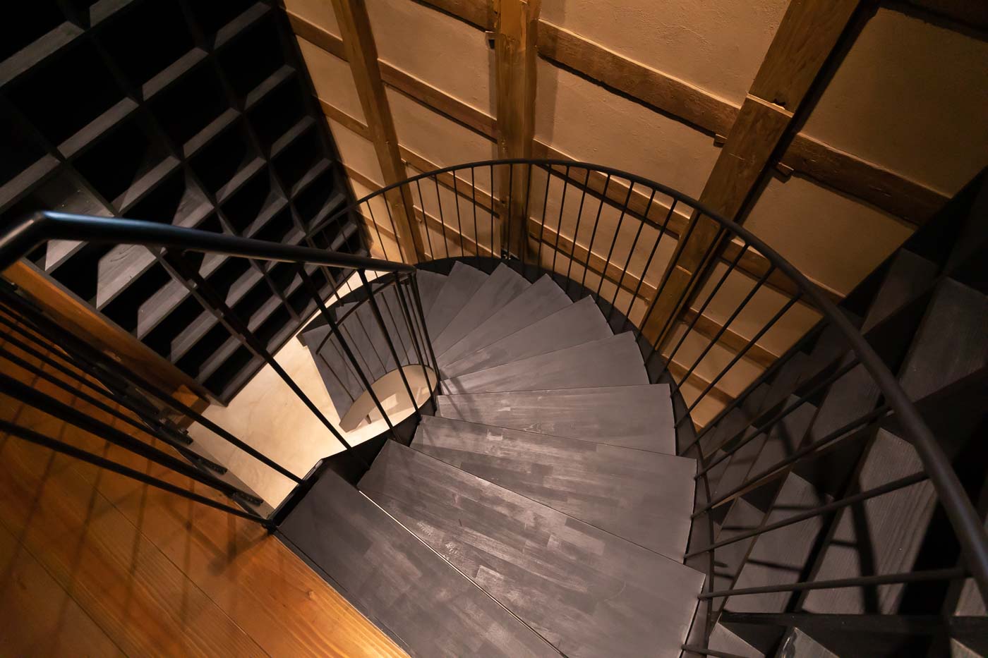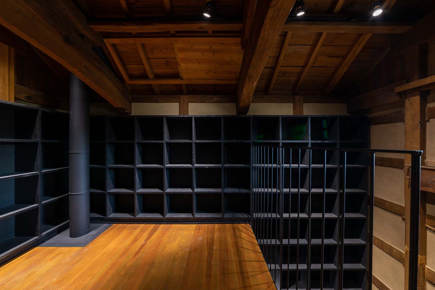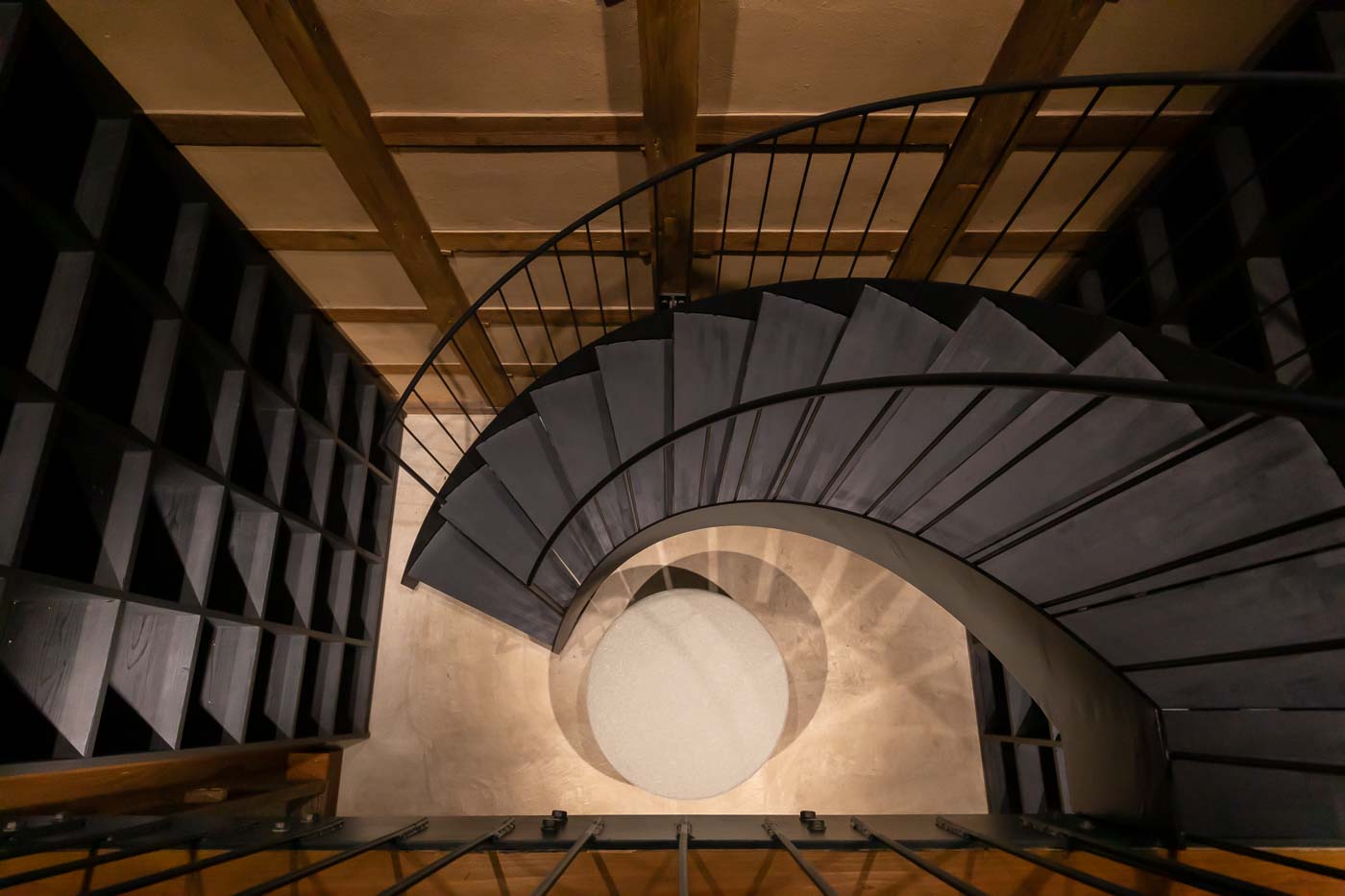 重厚な扉を開けて中に入ると、杉板を黒く塗装した本棚(最大約4000冊の蔵書)が床から天井、そして2階まで整然と連続しています。その中で吹抜けに面した一面だけは既存の土壁や力強い柱と貫の格子を現しにしています。その存在は軽やかに吹抜けを上昇する螺旋階段との対比によって強調され、蔵の時代性を感じさせる象徴的な場面を生み出しています。このようにして、蔵特有の構造を新しい機能である図書館の空間として昇華させました。1階にはミニマルな水廻りと薪ストーブ、特製の丸椅子を設えており、お茶を飲みながら自由に読書を楽しむことが可能です。
