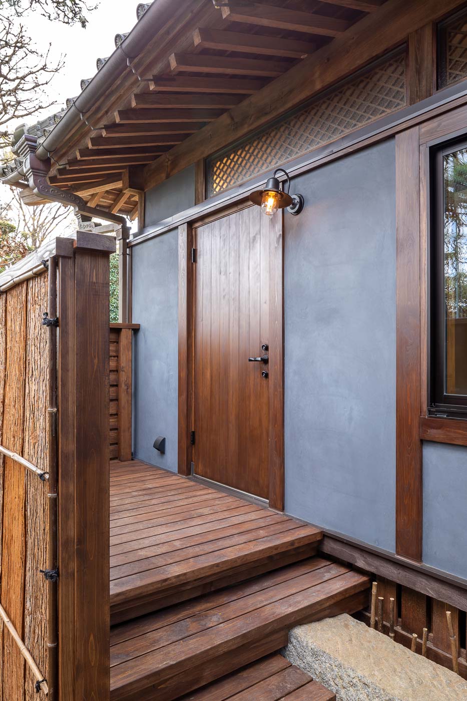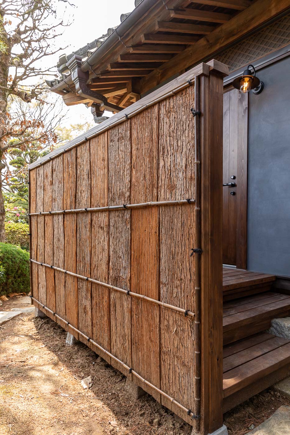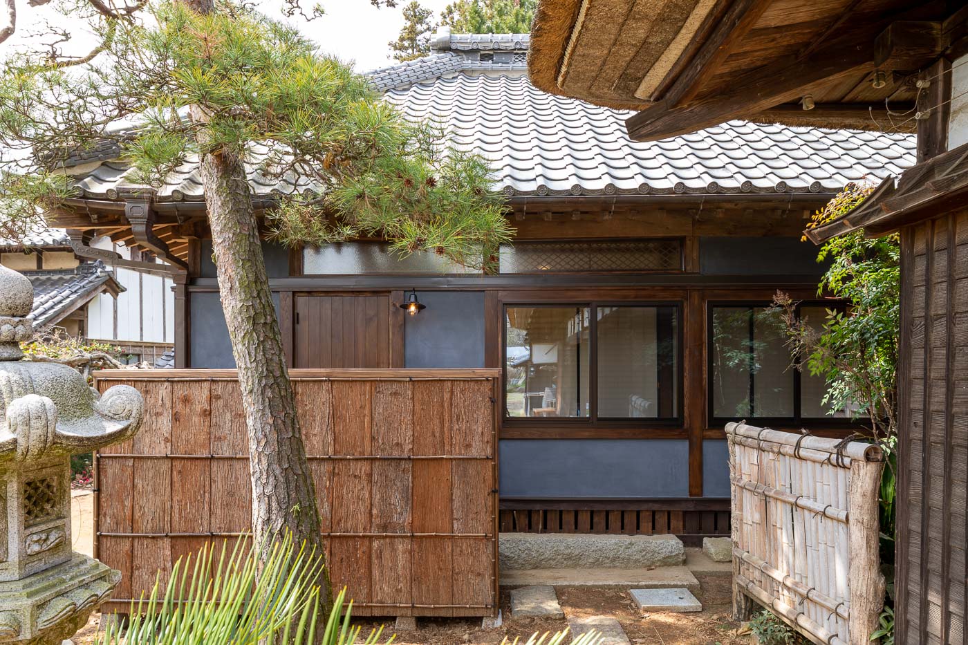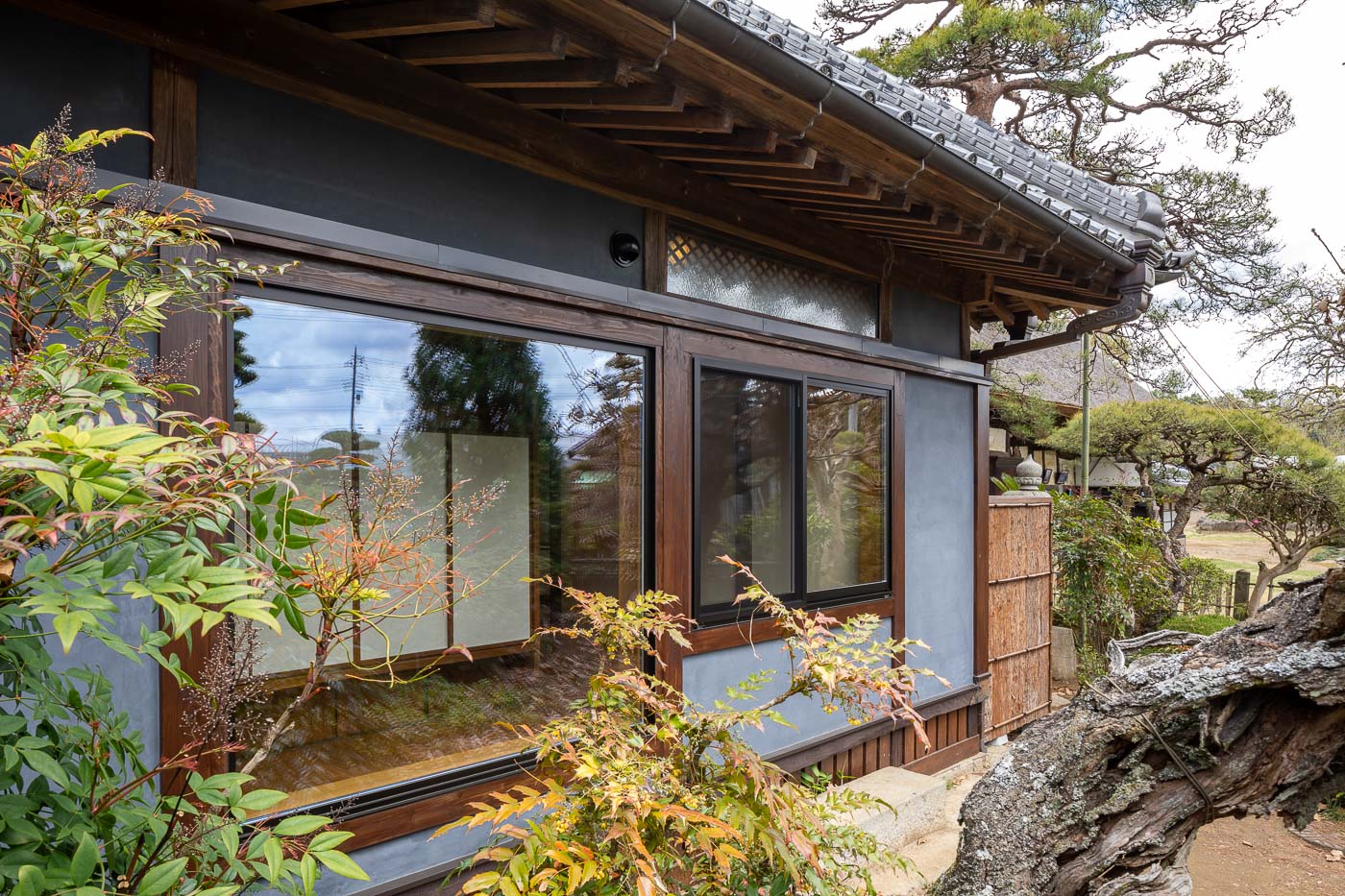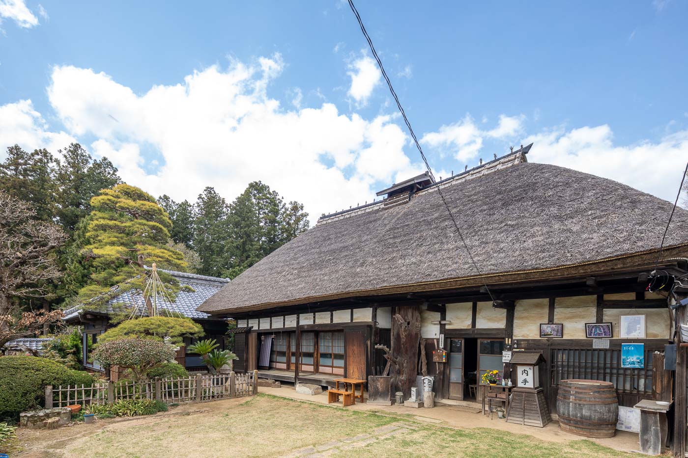 渡り廊下で繋がる主屋は、江戸末期に建てられた茅葺民家で、現在もきちんと手入れされており、施主のご両親がお住まいになられています。