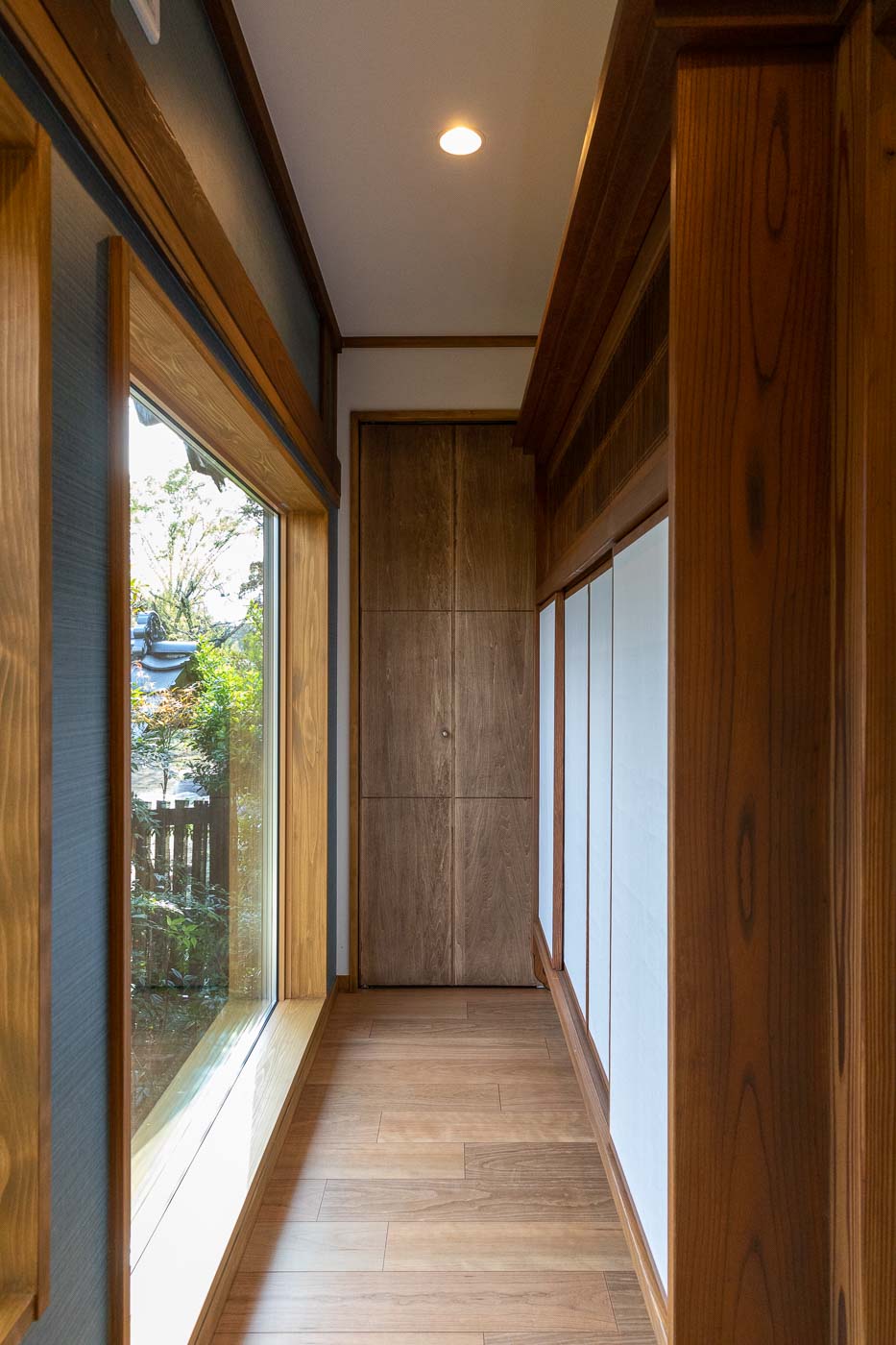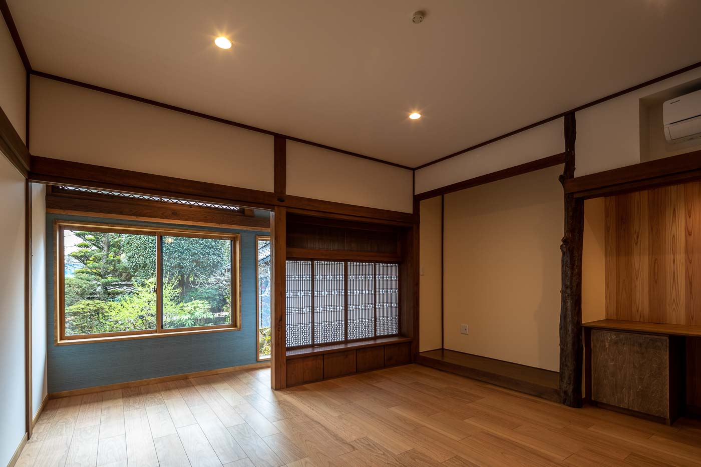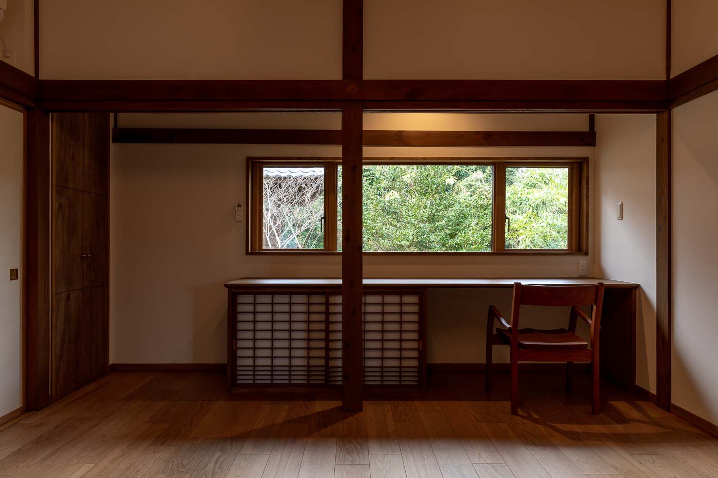 かつての廊下と和室8畳は、フローリング張りのリビングとし、広々とした居間兼ワークスペースとしました。仕事をしながら窓越しに日本庭園を眺めながめられるなど、ワーケーションスタイルの和モダンな住まいへとリノベーションしました。