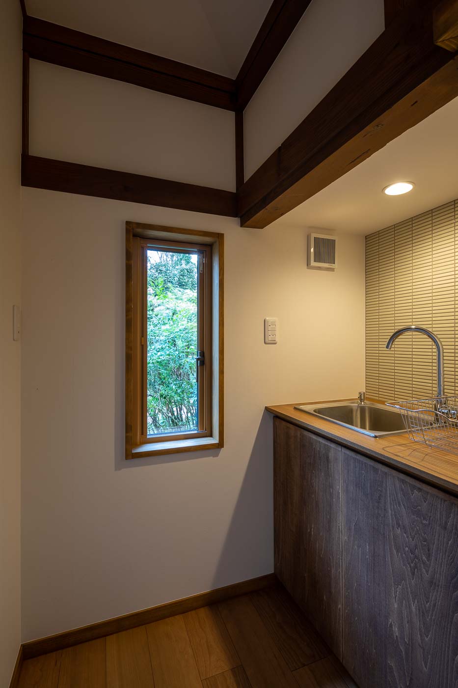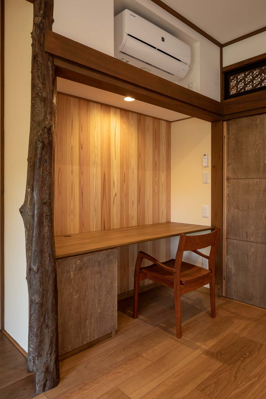 間取りは、玄関を新設し床の間脇の違い棚は広めのデスクへ、廊下の一角にミニキッチン、押入れはクロ-ゼットへ改修しました。施主のお父様がお気に入りの床の間や手の込んだ造りの古建具は再利用しました。