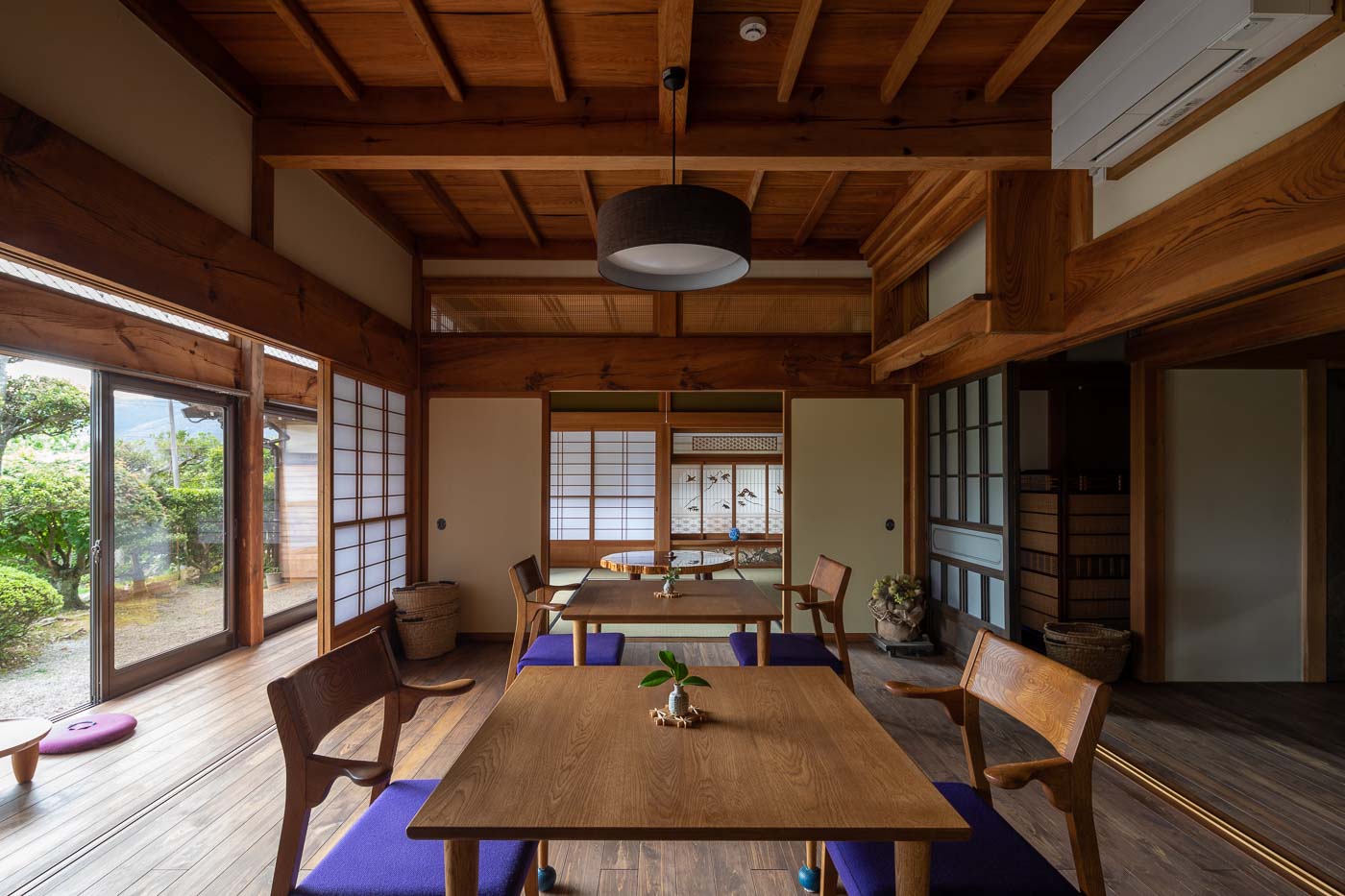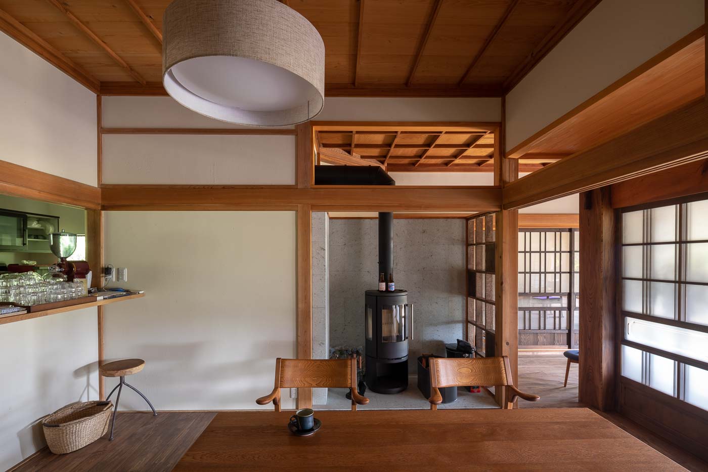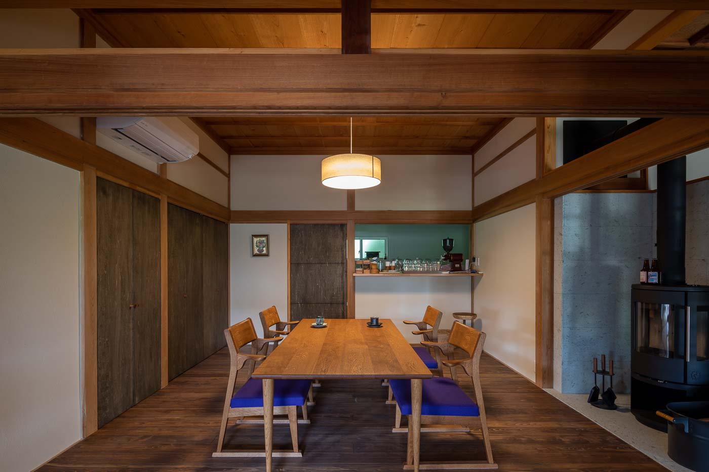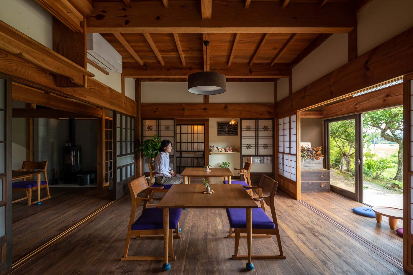 年月を重ね大切に使われてきた大黒柱や差し鴨居など古材・古建具の趣を残し、土間、続き間、縁側の開放感を活かした農村ならではの個性ある空間に、地元の家具作家によるポップなデザインの家具や薪ストーブを用いました。農村風景と古き良き建築の伝統美に、モダンデザインを包含した多様性のある空間とし、世代を超えた人たちが集い農家ならではの食と建築を通したコミュニティーづくりを訴求しました。