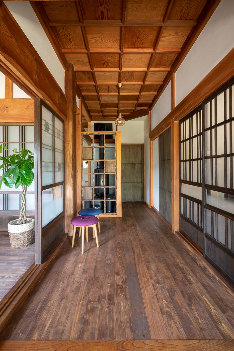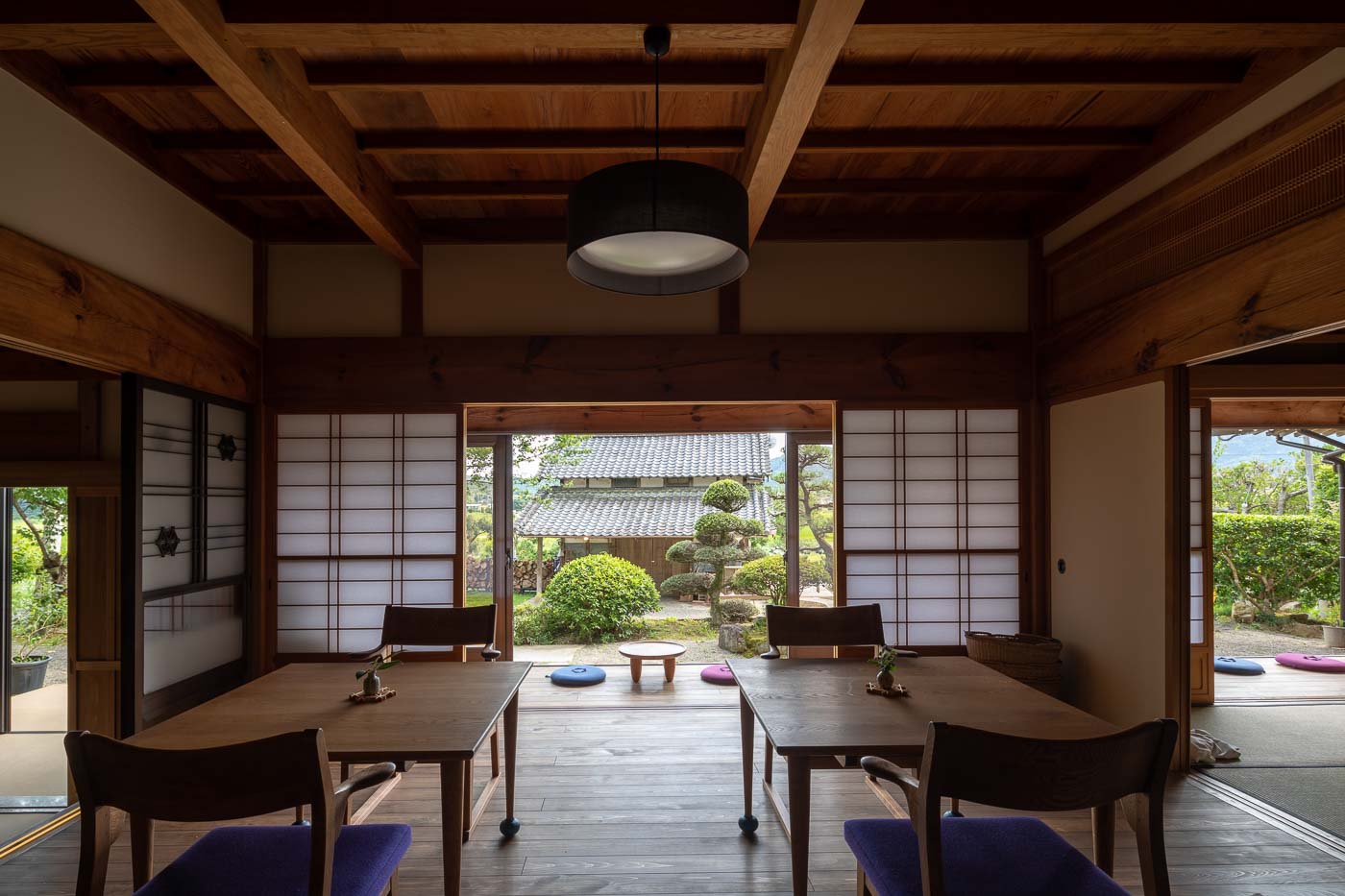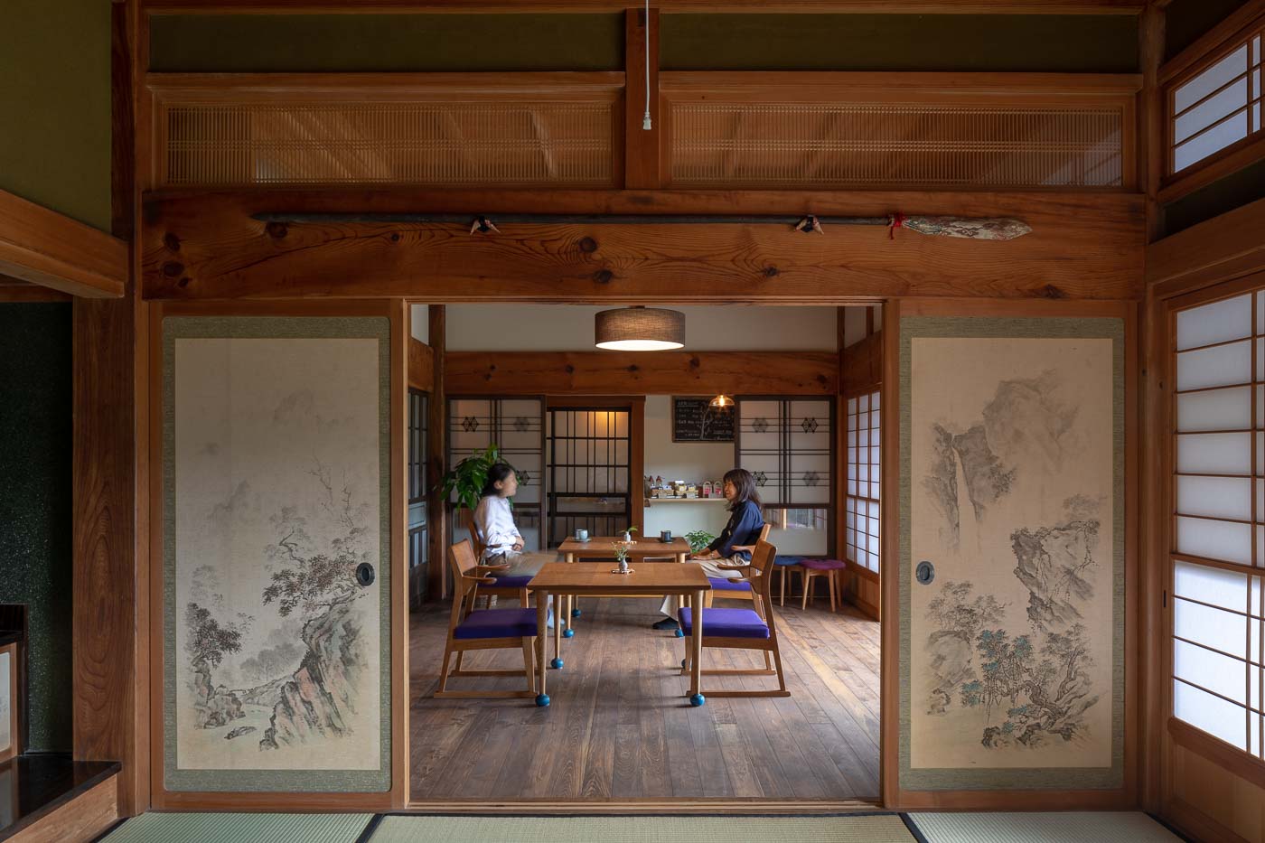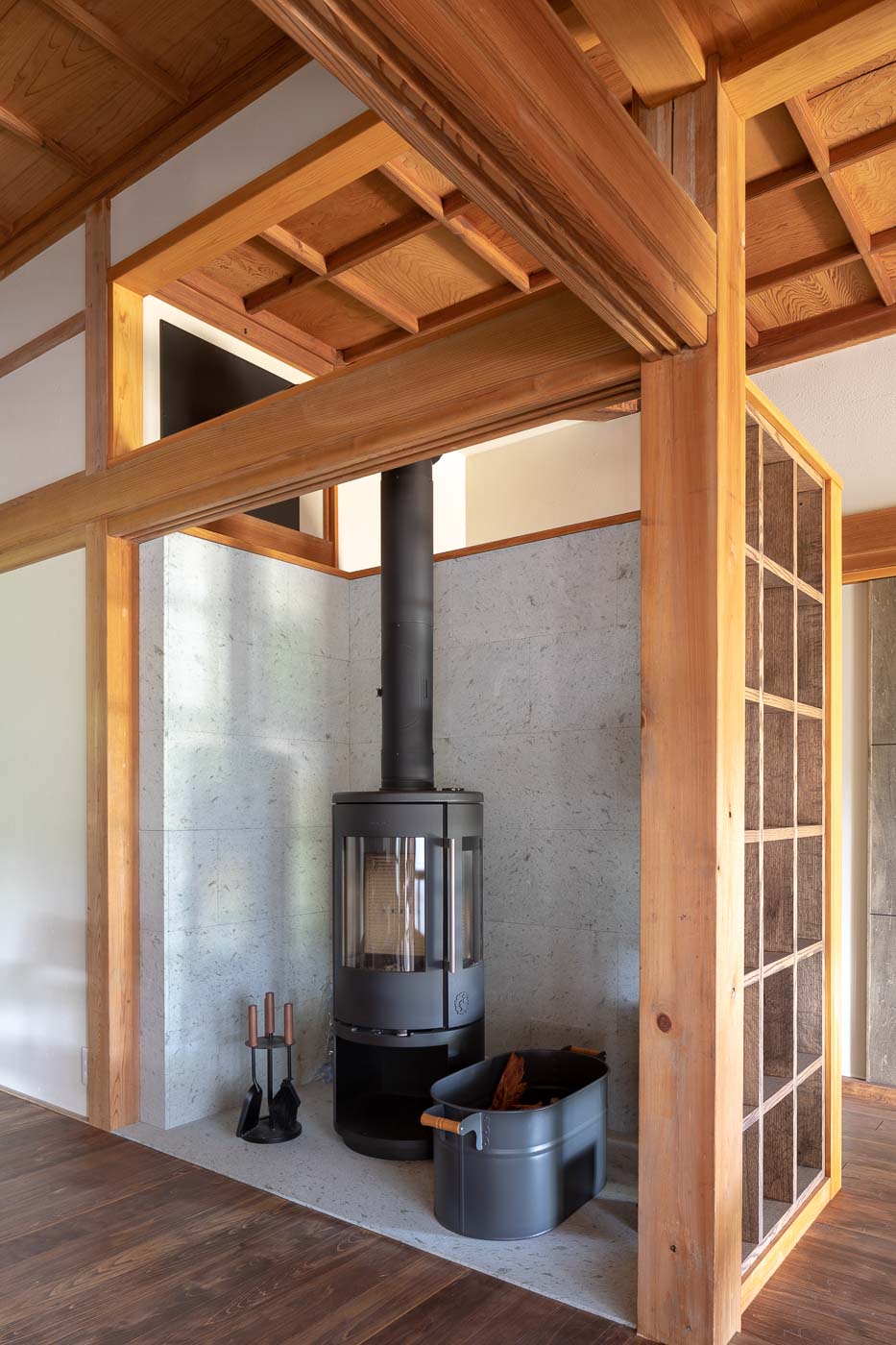 年月を重ね大切に使われてきた大黒柱や差し鴨居など古材・古建具の趣を残し、土間、続き間、縁側の開放感を活かした農村ならではの個性ある空間に、地元の家具作家によるポップなデザインの家具や薪ストーブを用いました。農村風景と古き良き建築の伝統美に、モダンデザインを包含した多様性のある空間とし、世代を超えた人たちが集い農家ならではの食と建築を通したコミュニティーづくりを訴求しました。