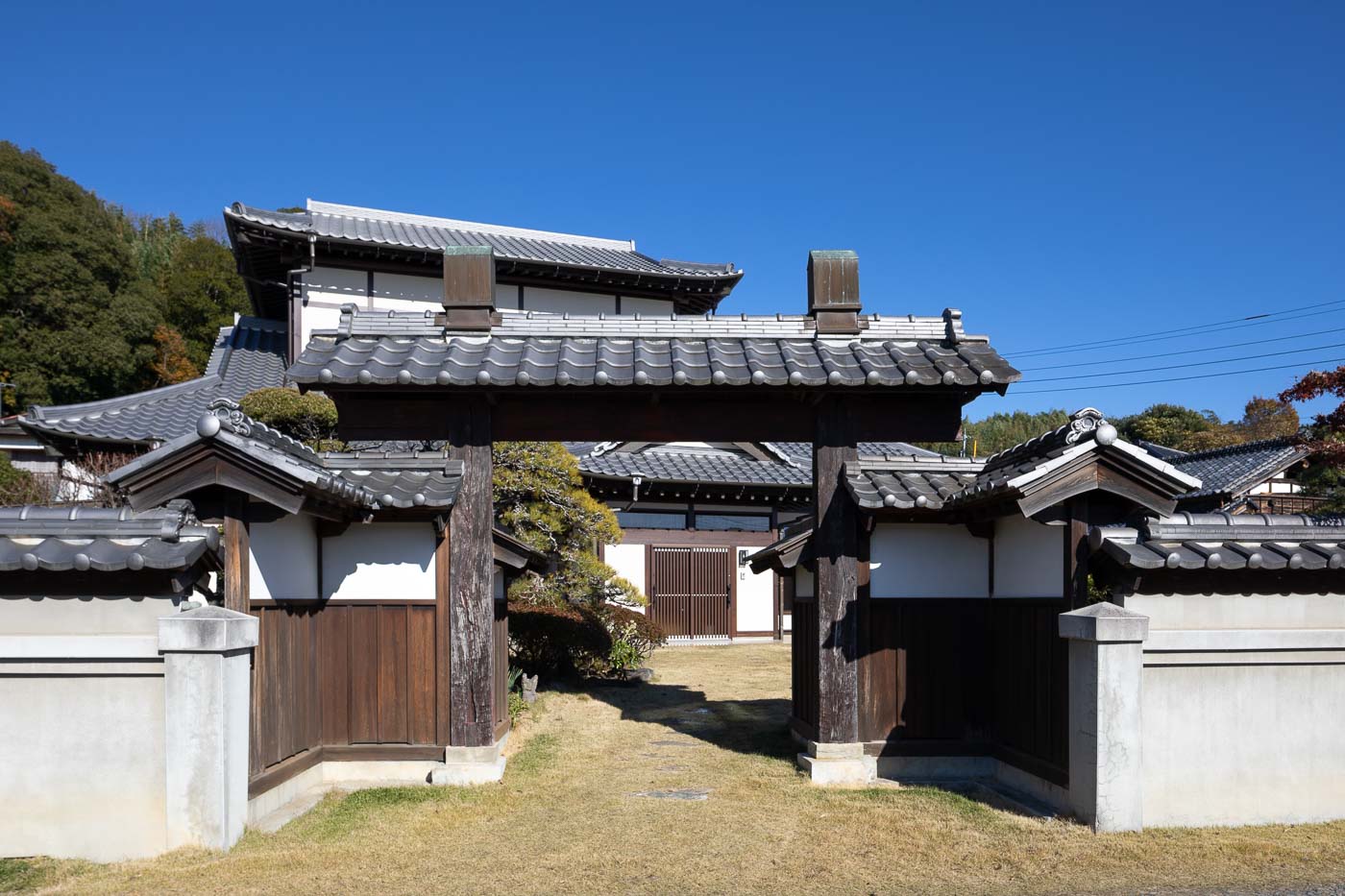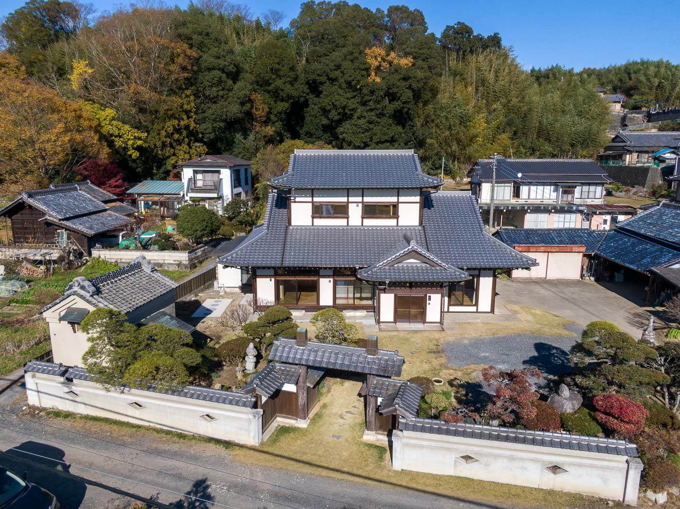 茨城県常陸太田市の幹線道路沿いにある集落内に位置し、敷地入り口には冠木門、続いて土蔵、その奥にお母屋が建っています。