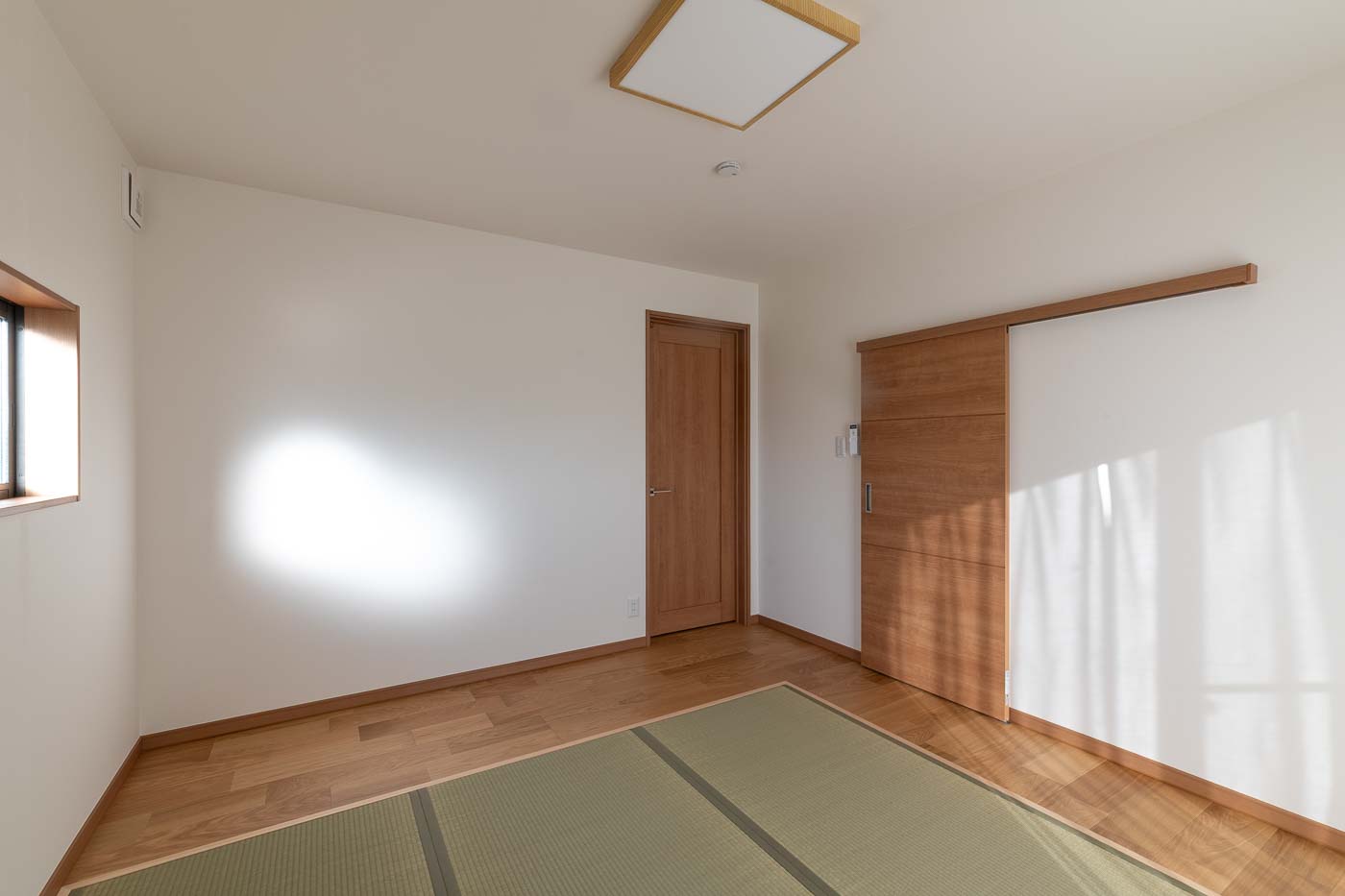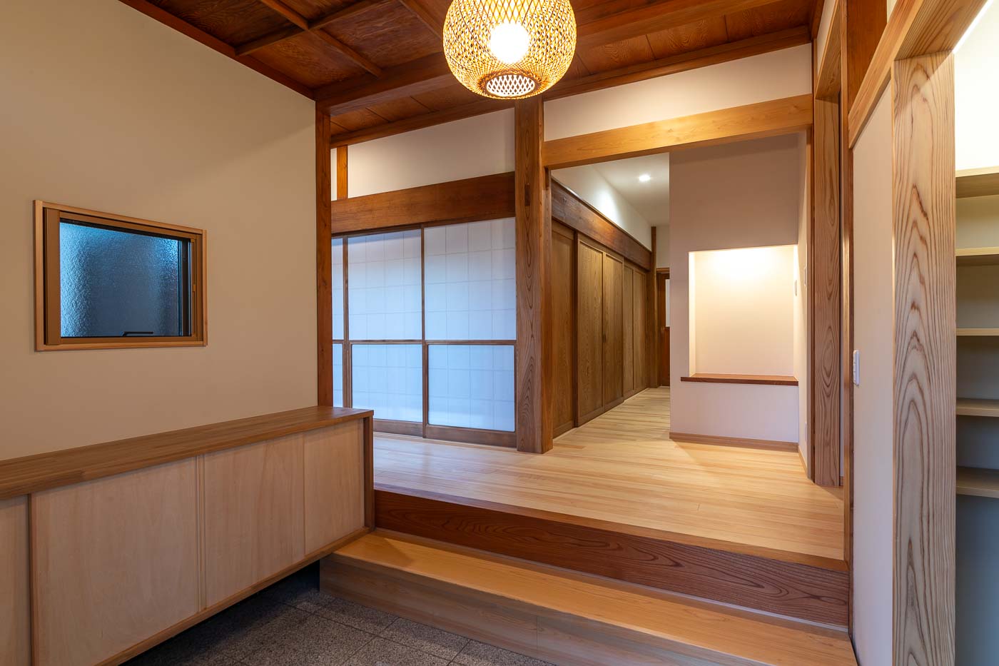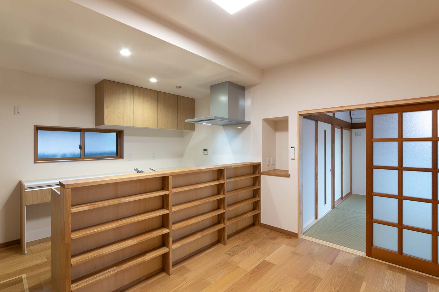 床は桧材、壁は珪藻土塗の自然素材とし、天井の竿縁天井及び、差し鴨居は再利用。かつての客間の書院は玄関ホールへ移設しました。リノベーションにより、和の素材を活かした洋の生活スタイルが可能となり、新旧の木材が混じりあった一体感のある新たな空間へと変化しました。