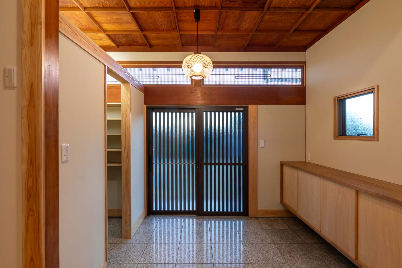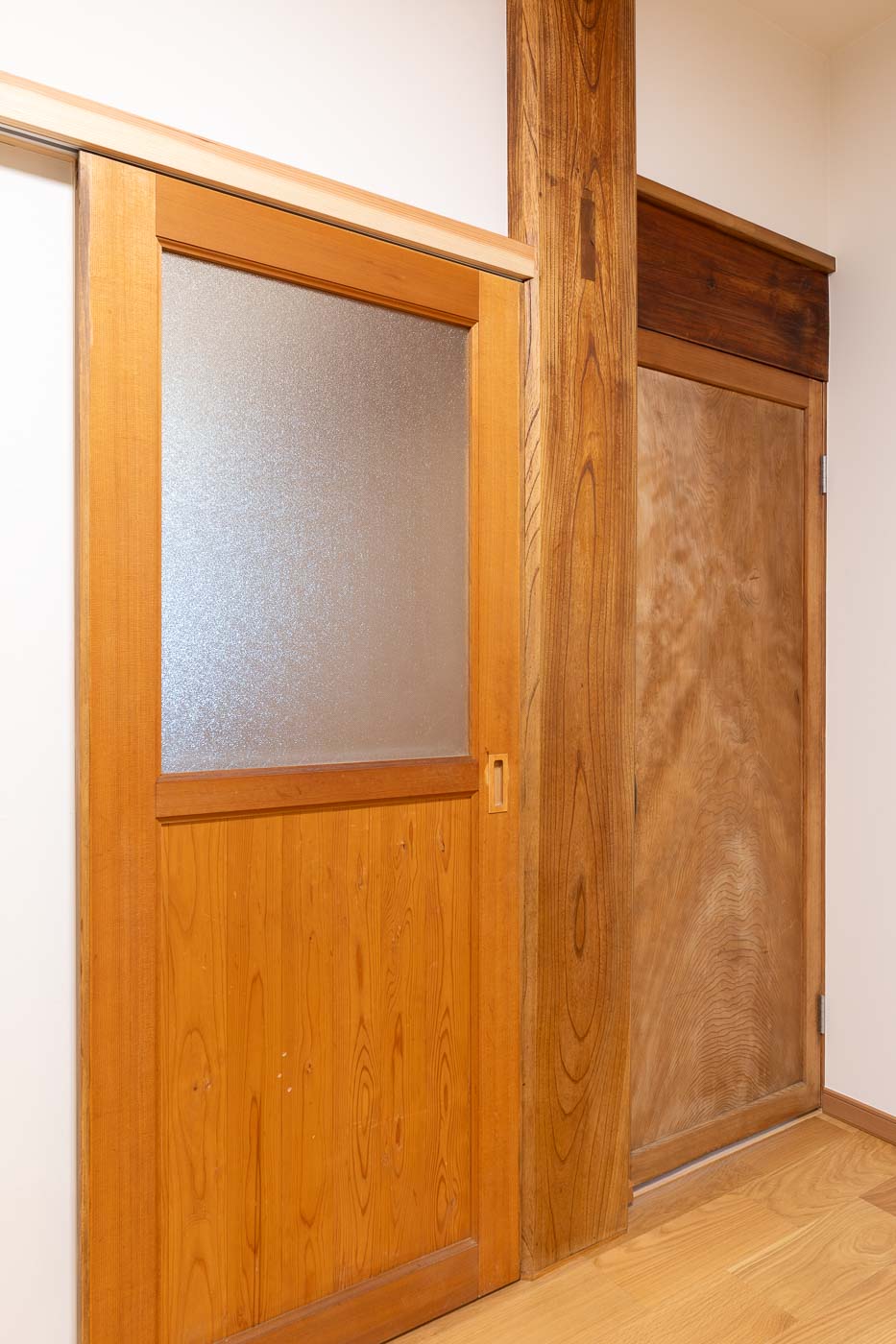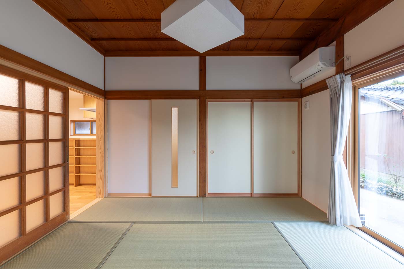 母屋は、昭和56年に施主の祖父(故人)が建てられ、築41年(令和4年時点)をむかえます。木造2階建・入母屋屋根の重厚な日本家屋で、室内は大きな玄関を入ると南側に八帖二間(客間空間)と和室の前面には4尺幅の廊下が鍵の手に廻り、大黒柱や差し鴨居が存在感を示します。そして家族の生活の場は、玄関の北側及び東側にレイアウトされた典型的な日本家屋の間取りです。