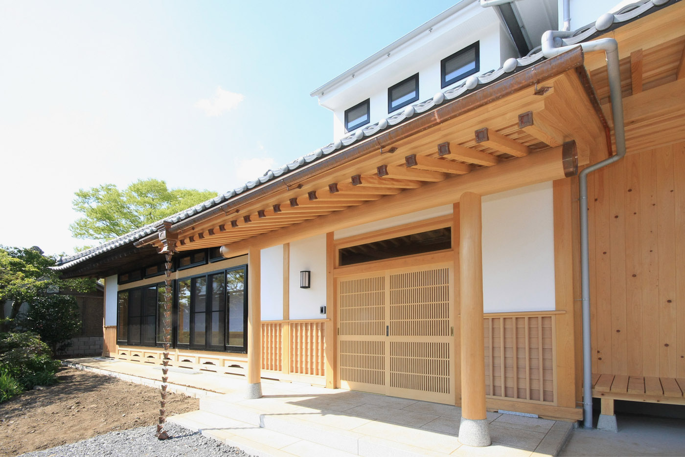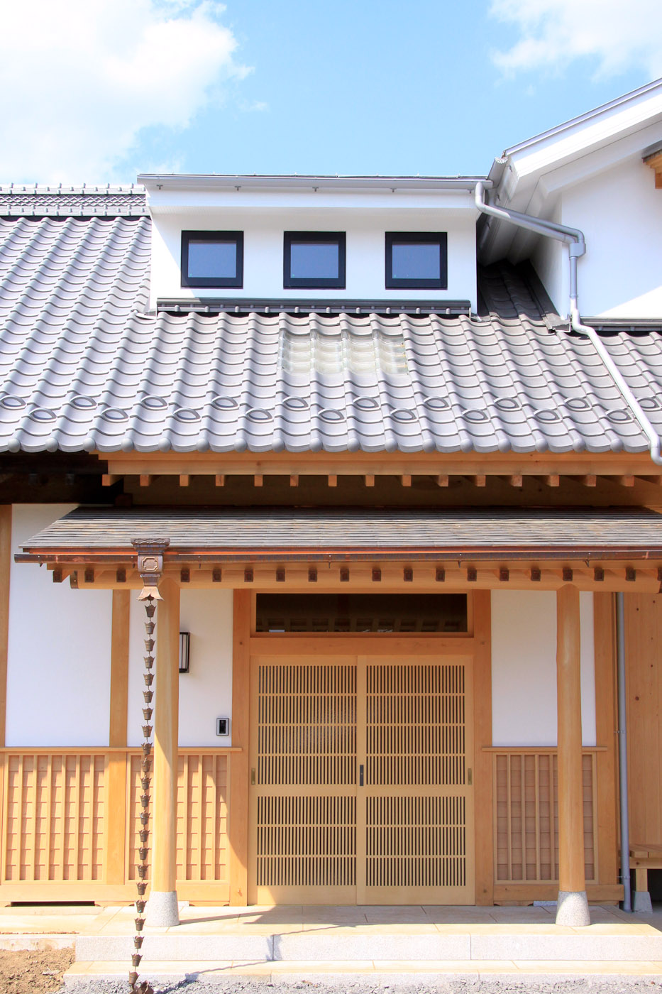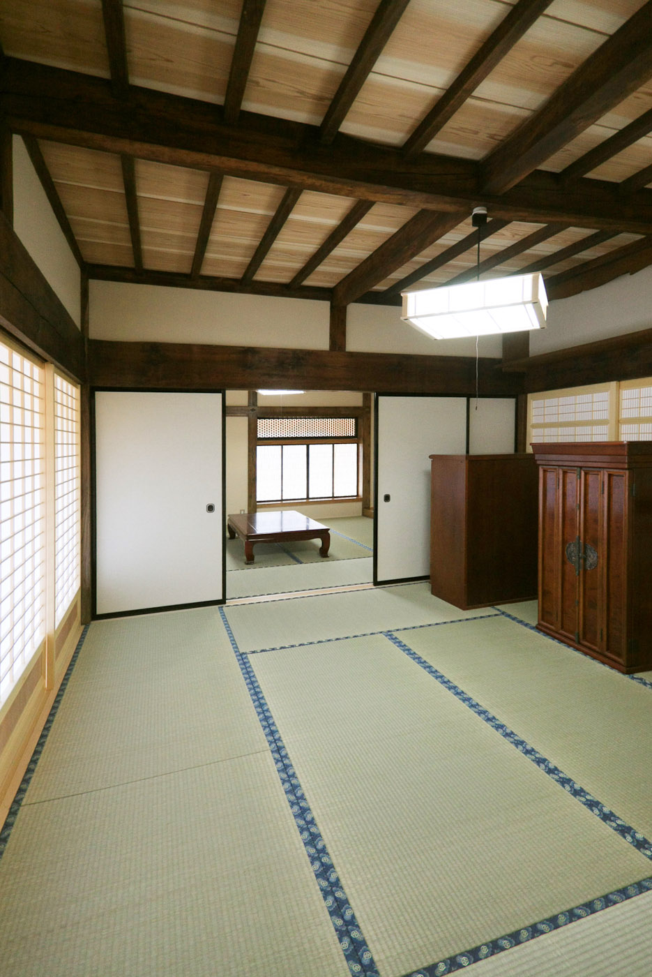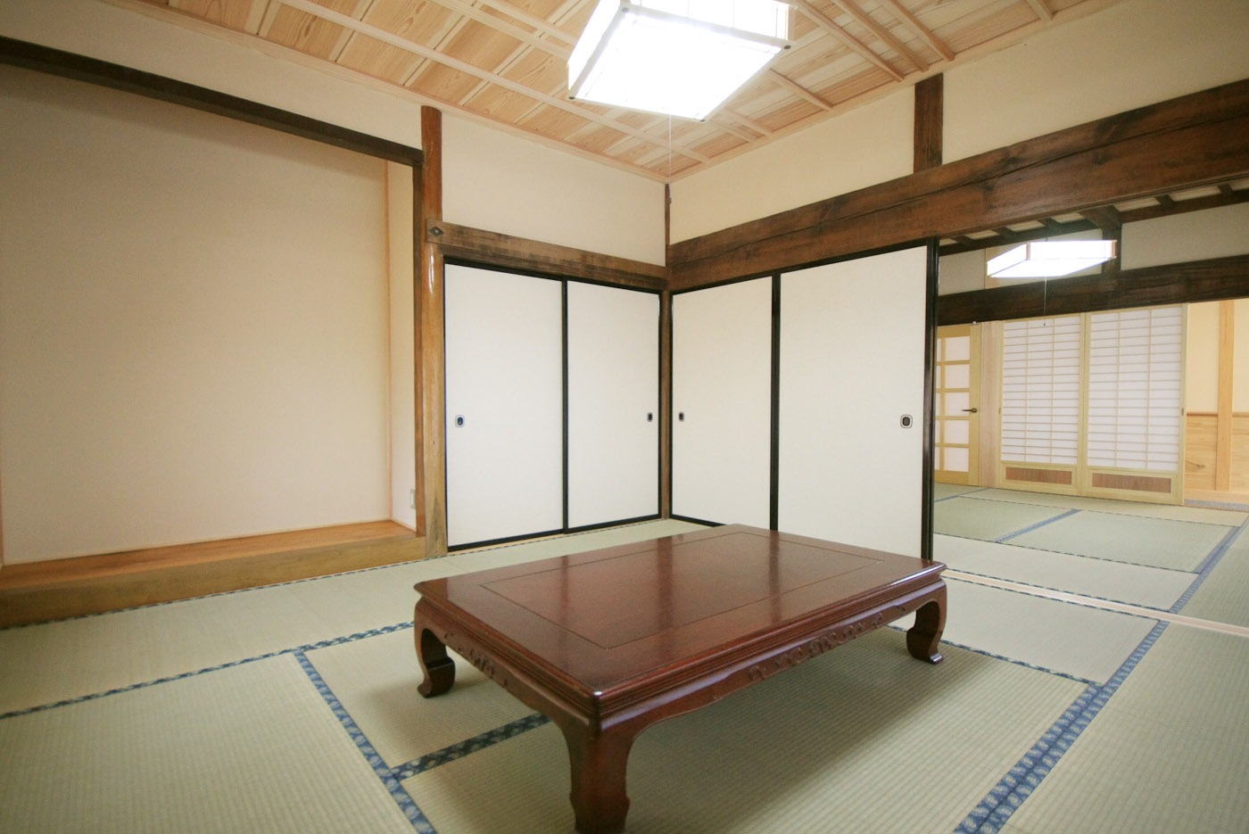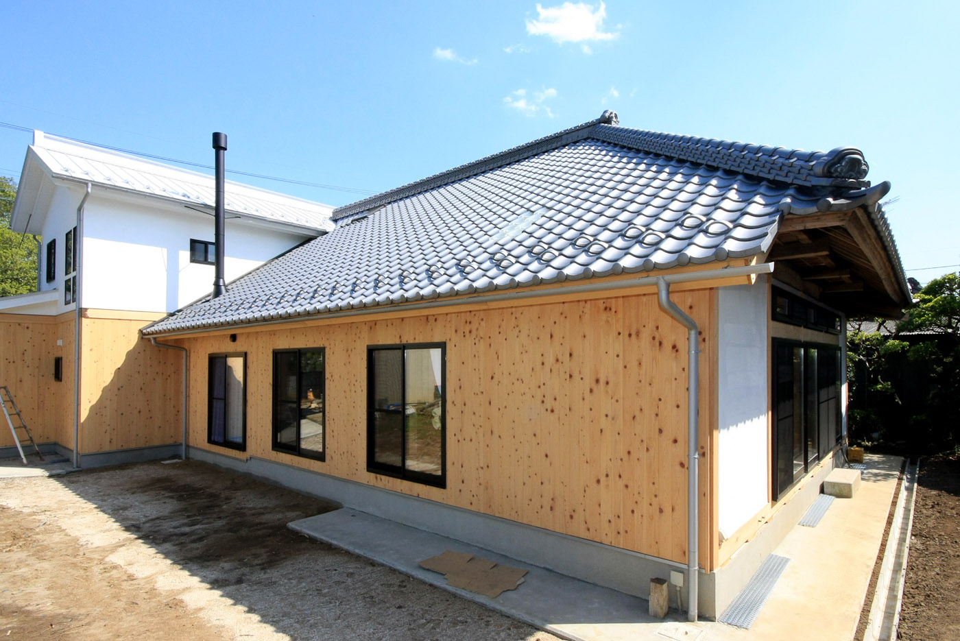 伝統工法を残して(一部耐力壁を増設)新たに軸組み工法と融合させる試みはこの建物の特徴的なところです。室内のデザインは既存部分については創建時の通りに復元し、増築した2階建て部分は生活動線を重視した機能的なプランとしました。外観は土蔵のイメージとし、民家の大屋根の意匠と土蔵造りが一体となる外観としました。工事が始まり、先に既存部分を揚屋して、増築部分と一体の基礎を作り、土台を設置後に下ろしました。そのあと増築部分の建て方を行いました。暗かった中央部の部屋には屋根にガラス瓦を用いて自然光が差し込む明るい部屋になりました。また、建物全体の断熱性能を上げたため、薪ストーブでの暖房が可能になりました。