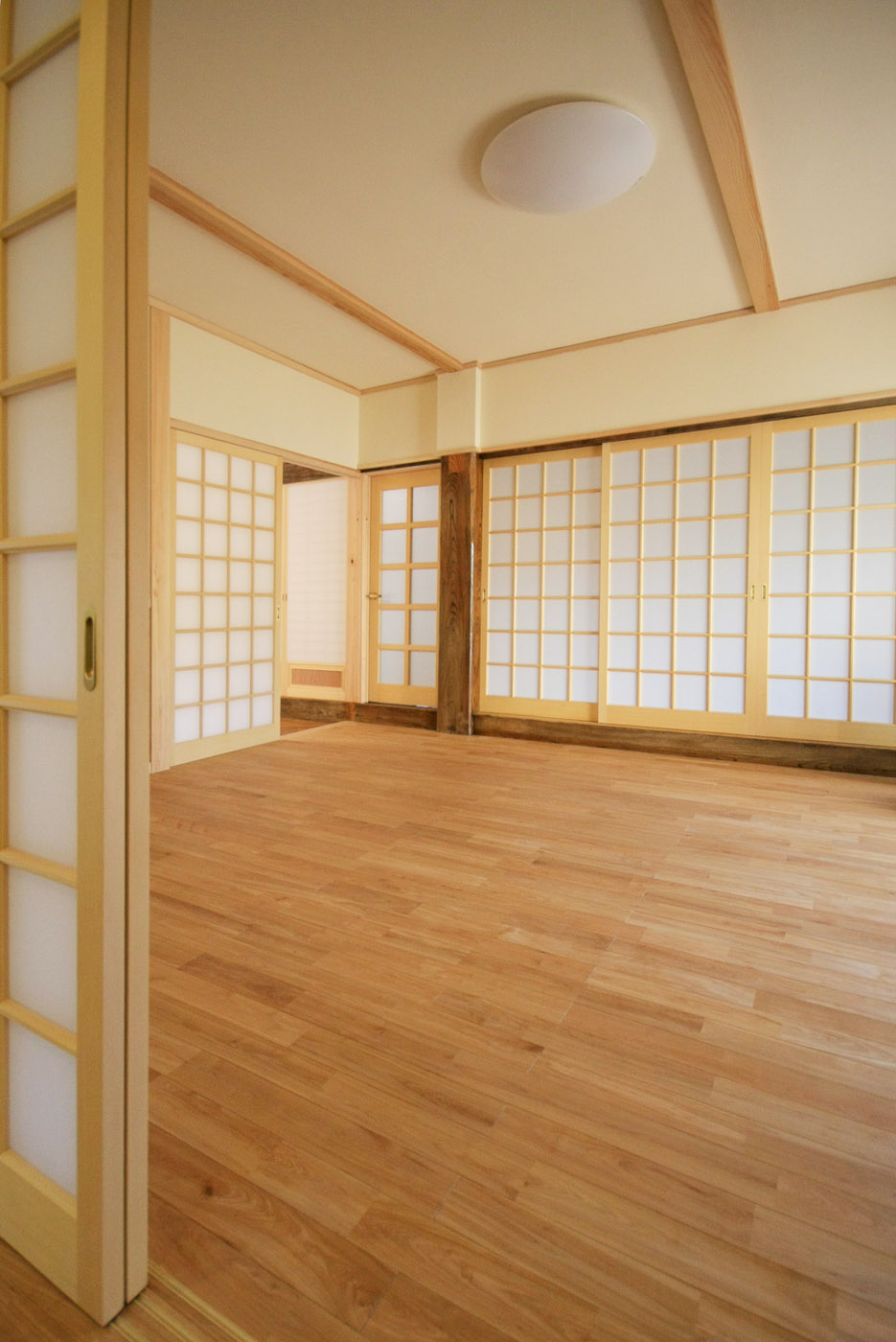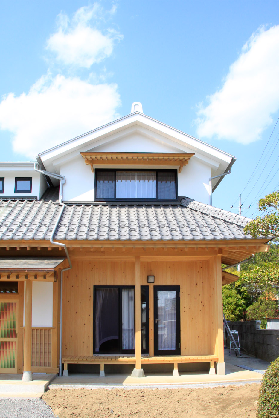 明治40年に石岡市内(八郷地区)に創建された平屋建寄棟造りの民家。築105年の民家を三世代6人の家族が暮らす2階建ての住宅として再生(建築基準法上は新築)しました。施主からの希望は、一部2階建てとする、明るい室内、地震に耐えられる構造、冬暖かい家、薪ストーブの設置等でした。