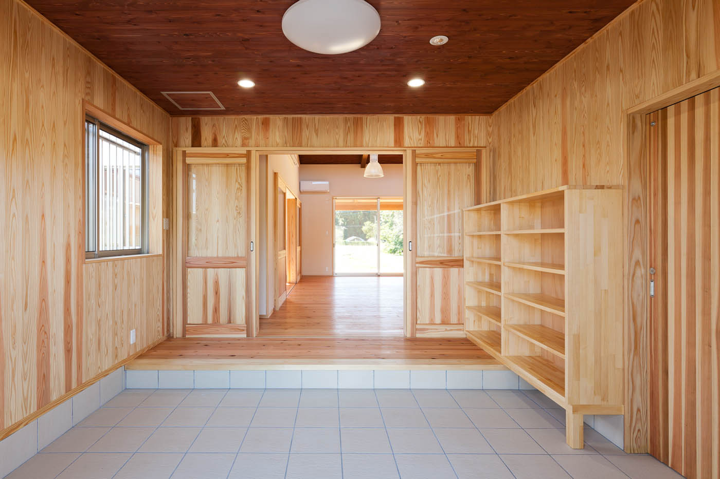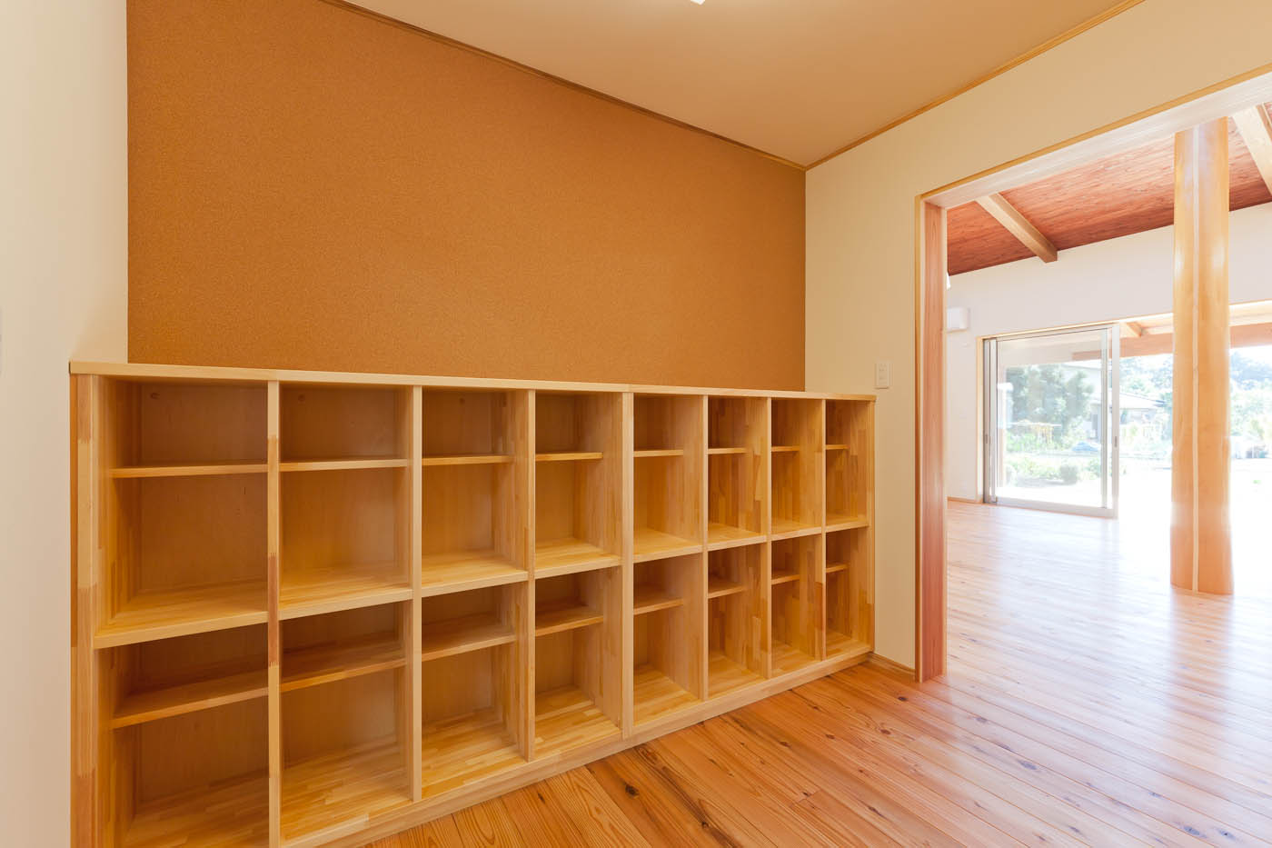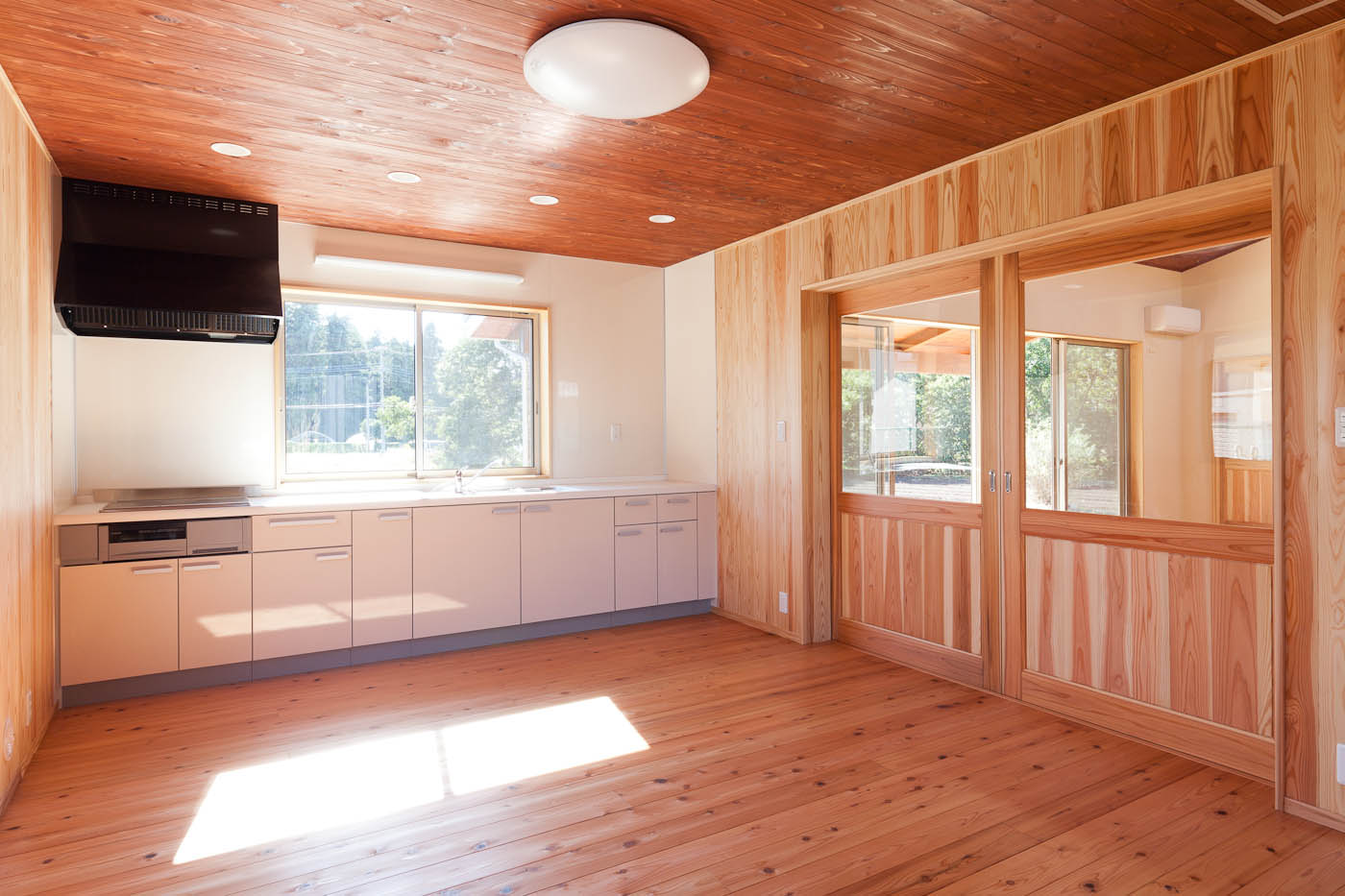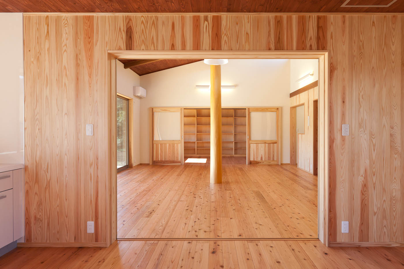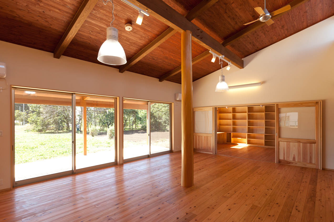 大きな大黒柱のあるホールを中心に、図書館と調理室の3つのゾーンから構成し、正面には畑が一望できる大きなデッキテラスへ繋がります。集団生活の中にも、個人の居場所がきちんとあることを大切に設計しました。
