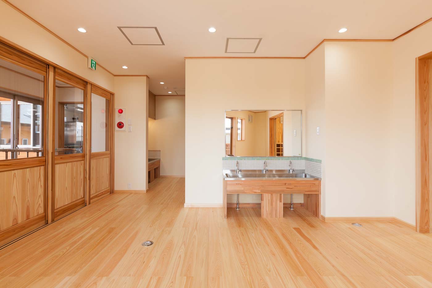 一階は保育室ゾーンと厨房部分にわかれ、二階は先生方の休憩室や理事長室など管理ゾーンとしました。既存園舎とはウッドデッキで結び、裸足で行き来ができます。