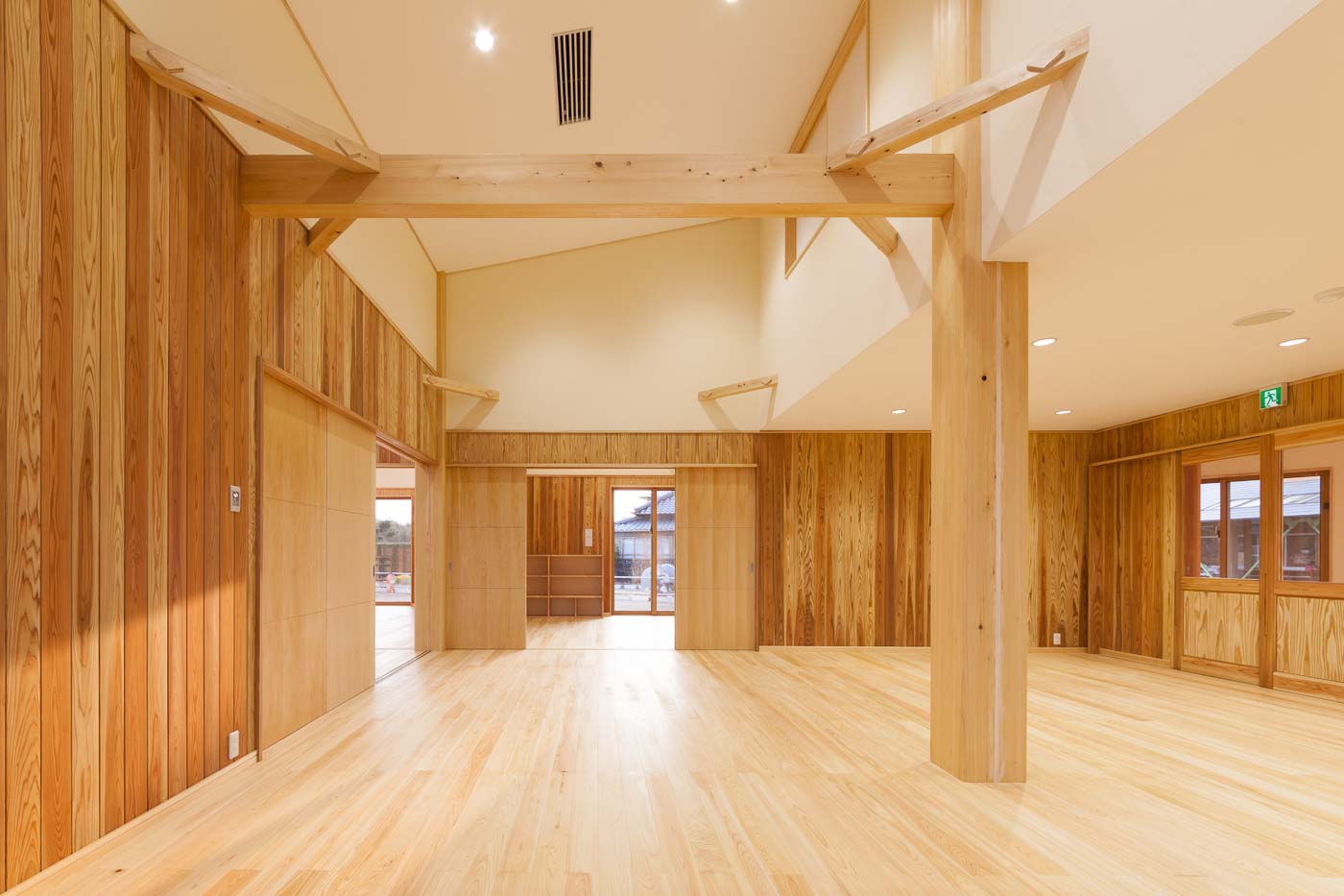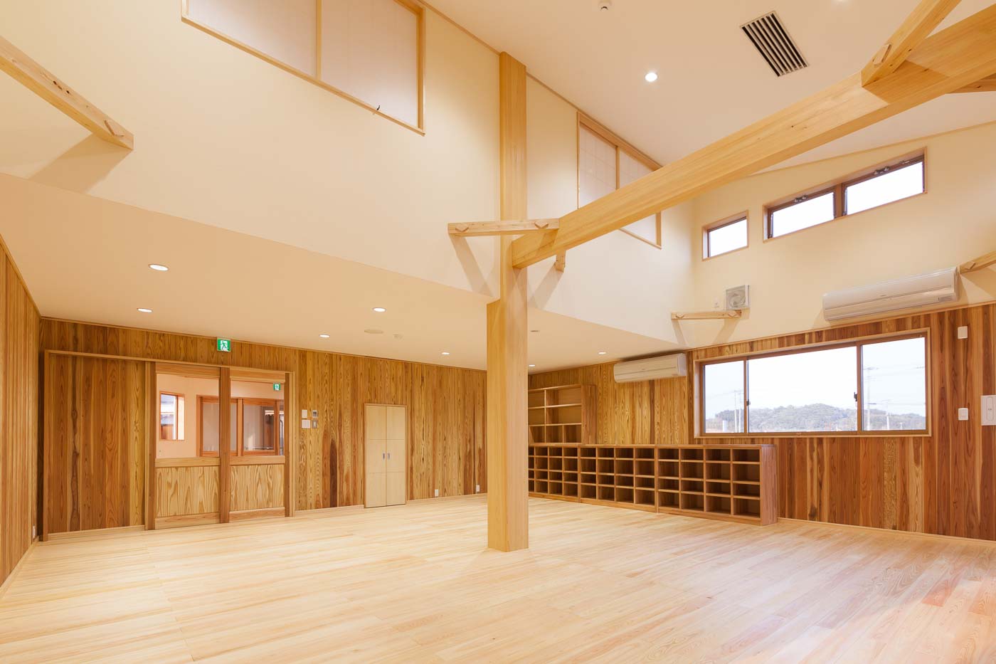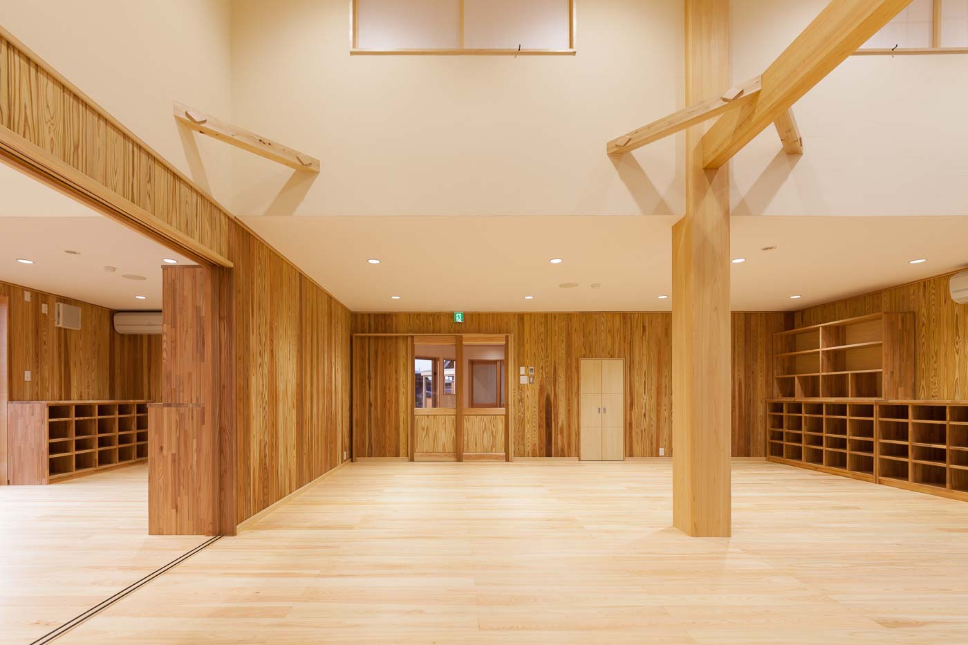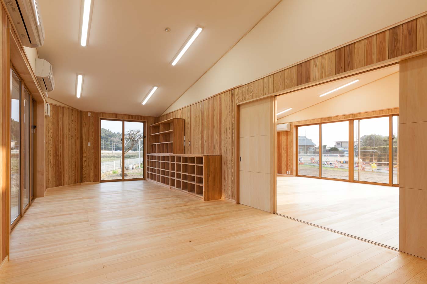 四室ある保育室は大黒柱を中心として建具で間仕切られています。建具を外せば大空間としても使うことができます。二階部分の障子をあけると、南側からのぼる勾配天井でつながれた保育室を見渡すことができ、子供たちの様子がわかります。子供たちの手で触れる部分は自然素材を使用しました。二本の大黒柱は無垢の木曽檜、床も無垢の桧のフローリングです。天井は珪藻土、壁には八溝杉の腰壁と珪藻土を用いました。