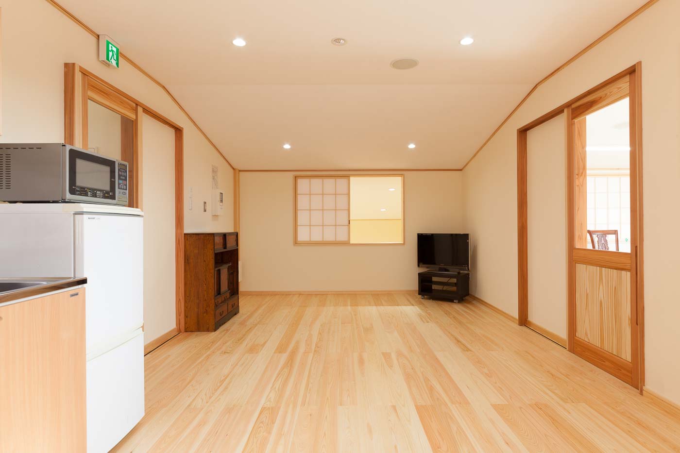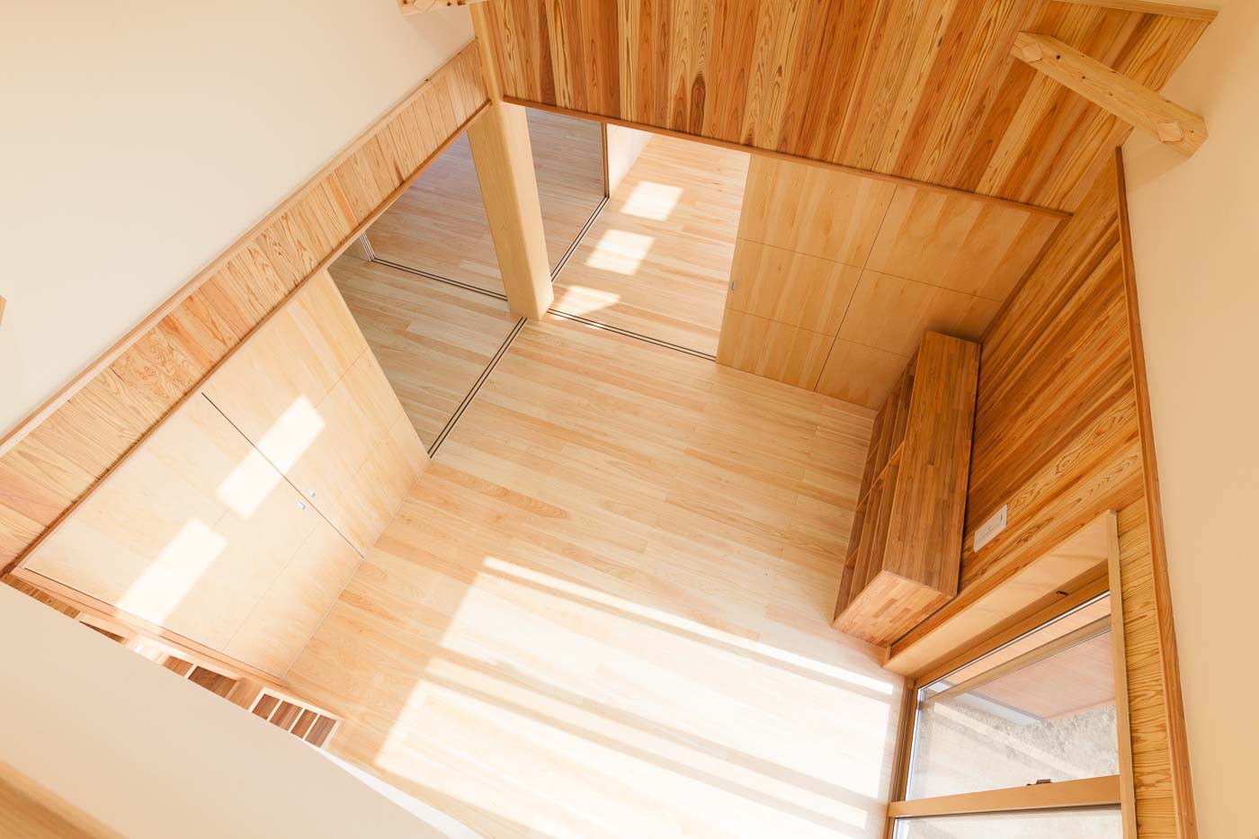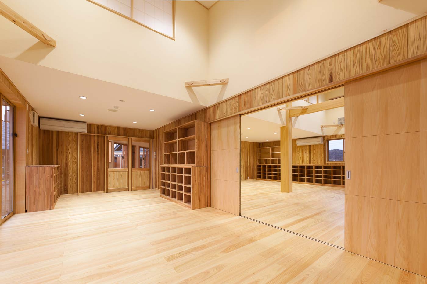 四室ある保育室は大黒柱を中心として建具で間仕切られています。建具を外せば大空間としても使うことができます。二階部分の障子をあけると、南側からのぼる勾配天井でつながれた保育室を見渡すことができ、子供たちの様子がわかります。子供たちの手で触れる部分は自然素材を使用しました。二本の大黒柱は無垢の木曽檜、床も無垢の桧のフローリングです。天井は珪藻土、壁には八溝杉の腰壁と珪藻土を用いました。
