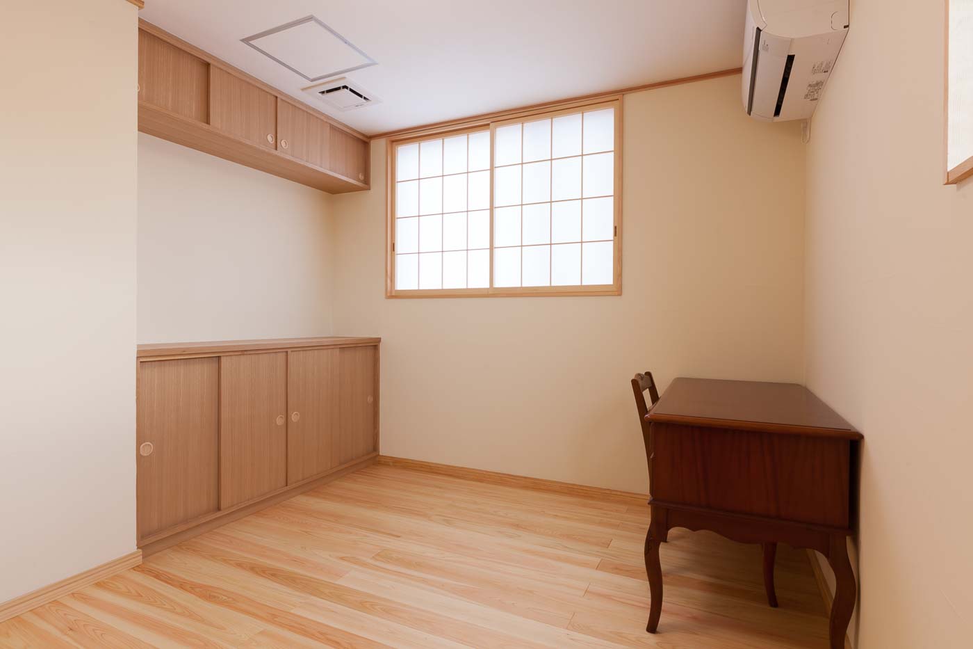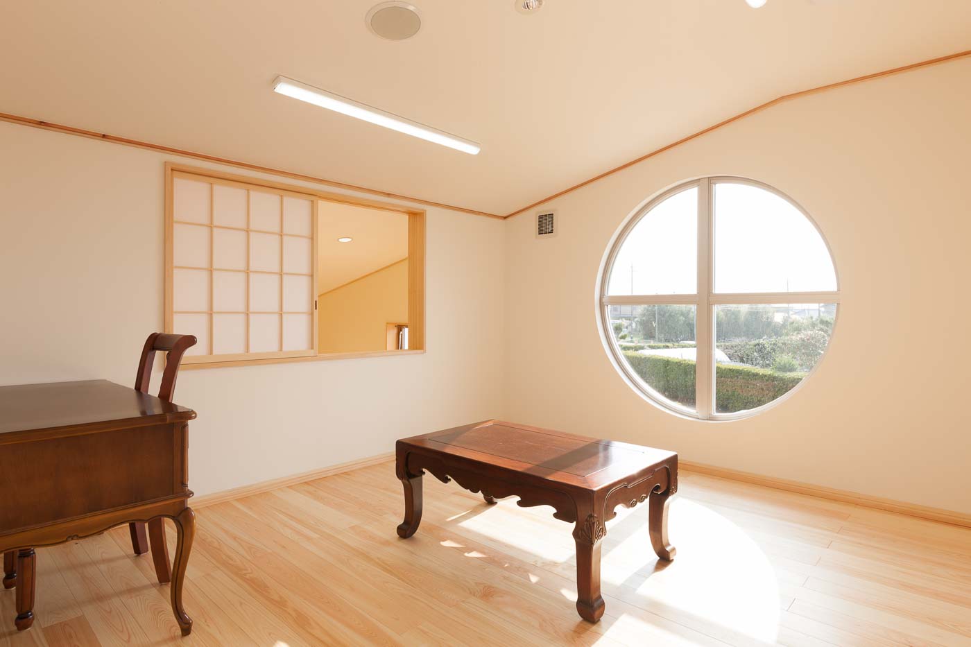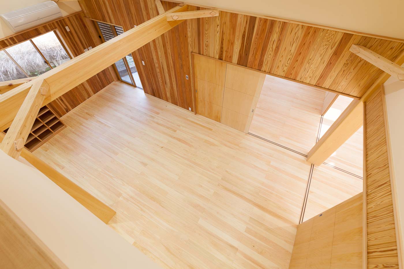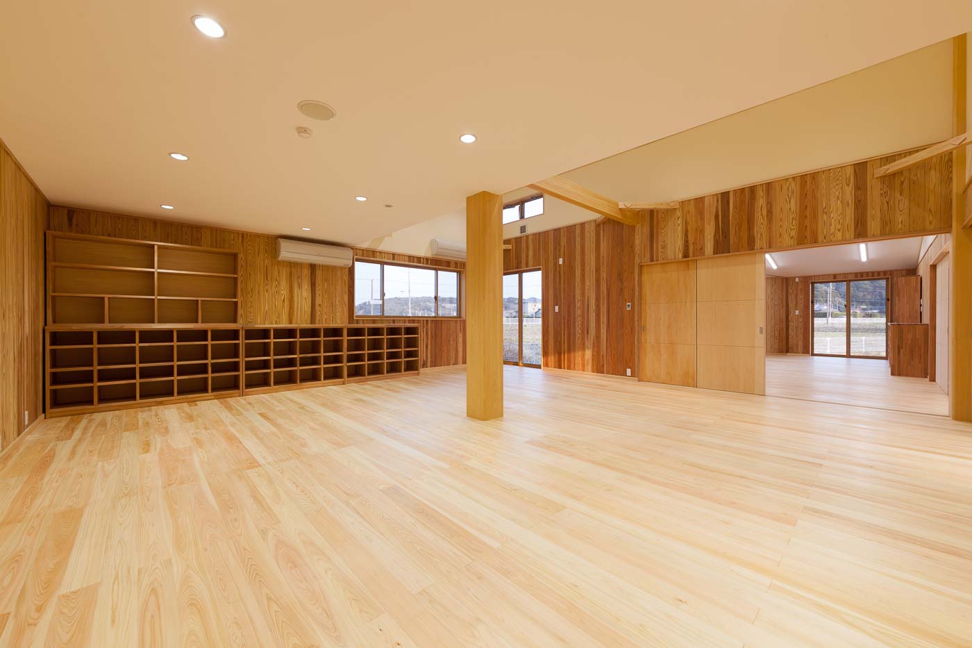 四室ある保育室は大黒柱を中心として建具で間仕切られています。建具を外せば大空間としても使うことができます。二階部分の障子をあけると、南側からのぼる勾配天井でつながれた保育室を見渡すことができ、子供たちの様子がわかります。子供たちの手で触れる部分は自然素材を使用しました。二本の大黒柱は無垢の木曽檜、床も無垢の桧のフローリングです。天井は珪藻土、壁には八溝杉の腰壁と珪藻土を用いました。