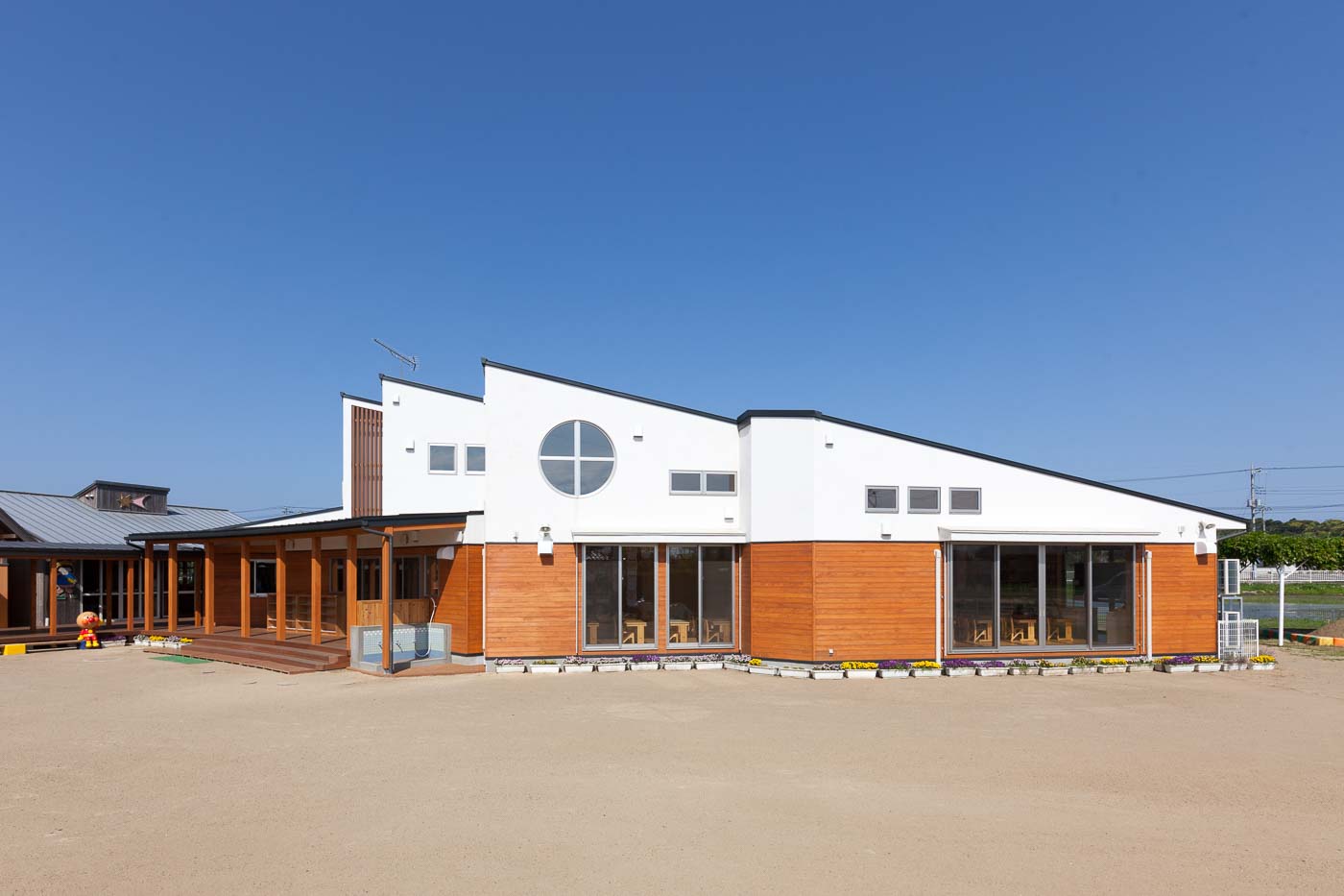 認定こども園大野ひかり保育園は、霞ヶ浦の北浦のほとりにあります。保育所から認定こども園への変更や園児の増員にともない、園舎の増築の設計のご依頼をうけました。現地に伺うと北浦を望むのどかな田園風景の中に、広々とした園庭と大きい屋根が特徴の既存園舎が出迎えてくれました。この広い園庭では秋に大規模な運動会や、園名物の和太鼓の演奏が披露され、多くの人が訪れるということでした。