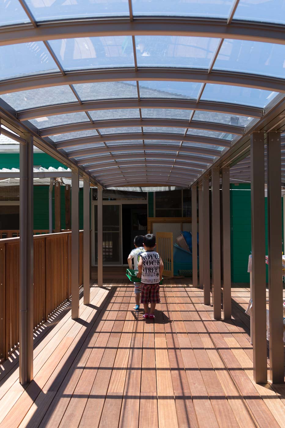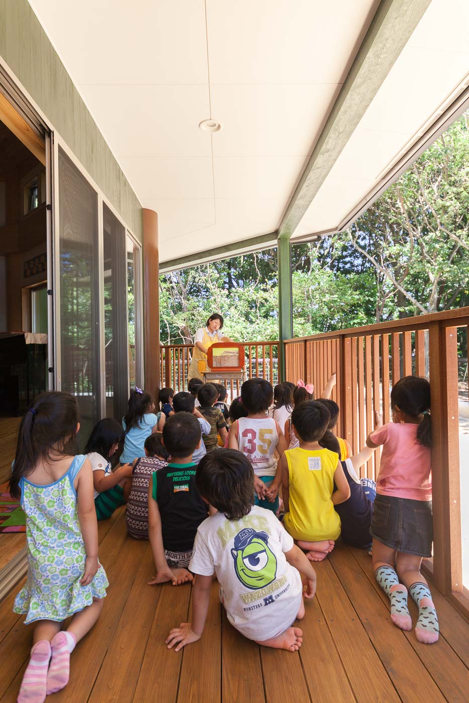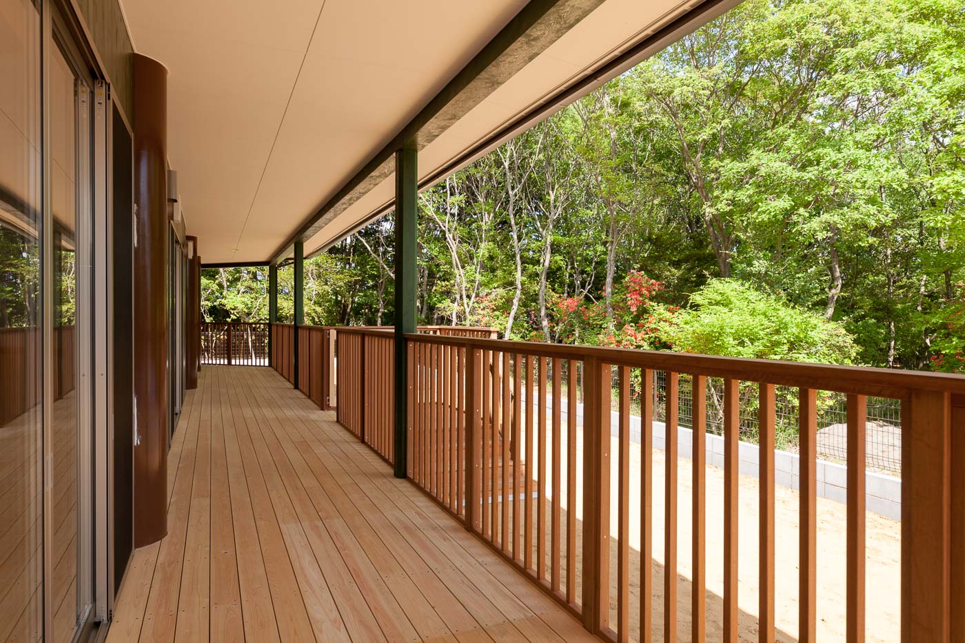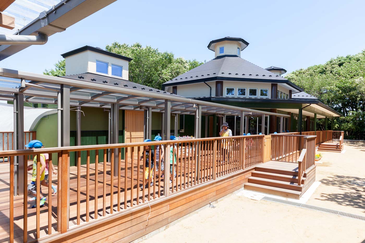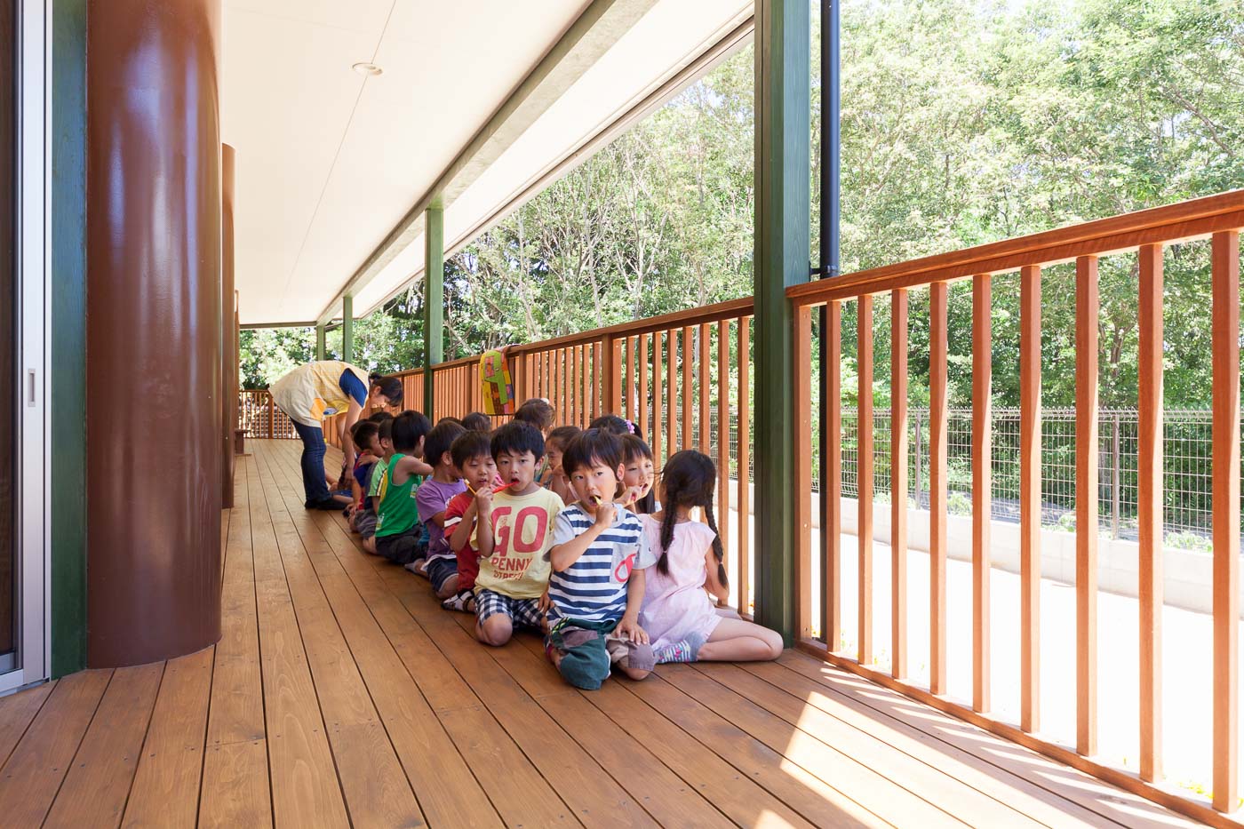 屋根のかかった正面の大きなウッドデッキは、森(自然)との一体感を高め、晴れた日はもちろんのこと、雨の日でも外へ出ることができます。こども達はまるで森の中で生活しているように、より自然を五感で感じることができ、遊びながらにして感性や冒険心を高め、情操豊かに成長することでしょう。また、この大きなデッキテラスは、きのこ棟と既存園舎とをつなぐ外部廊下の機能もあり、大きな船のデッキのような役割を果たしています。