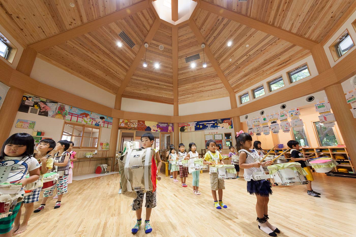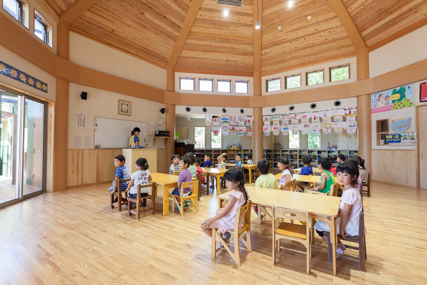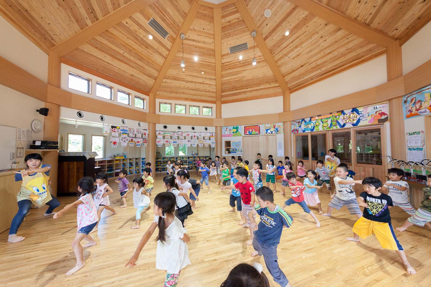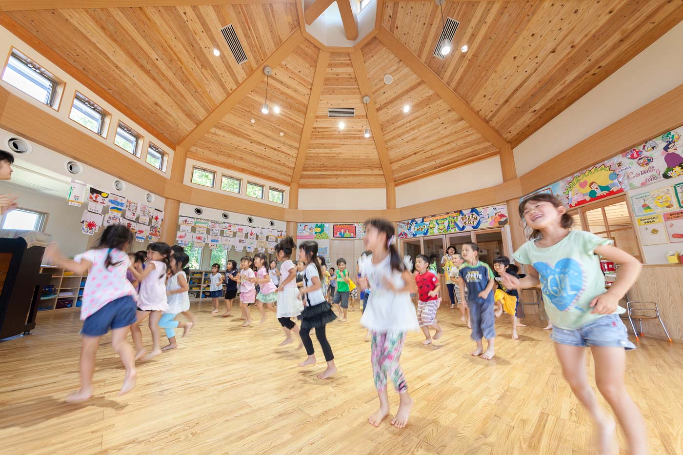 建物の外観は名前の通り、森の中にある大きなきのこをモチーフにデザインしました。建物のてっぺんにある窓からは、太陽の光が保育室の中へさんさんと降りそそぎます。建物の内外には地域産の天然木材(桧、杉等)をふんだんに使いました。木の床は温かく柔らかいので、飛びはねたり寝ころんでも安心です。木の壁は走ってぶつかってもコンクリートの様に硬くないので大丈夫です。木はこども達の心と身体の成長にとても優れた材料なのです。このような自然に溢れた豊かな環境で、子供たちが活き活きと元気に育ってくれることを願っています。