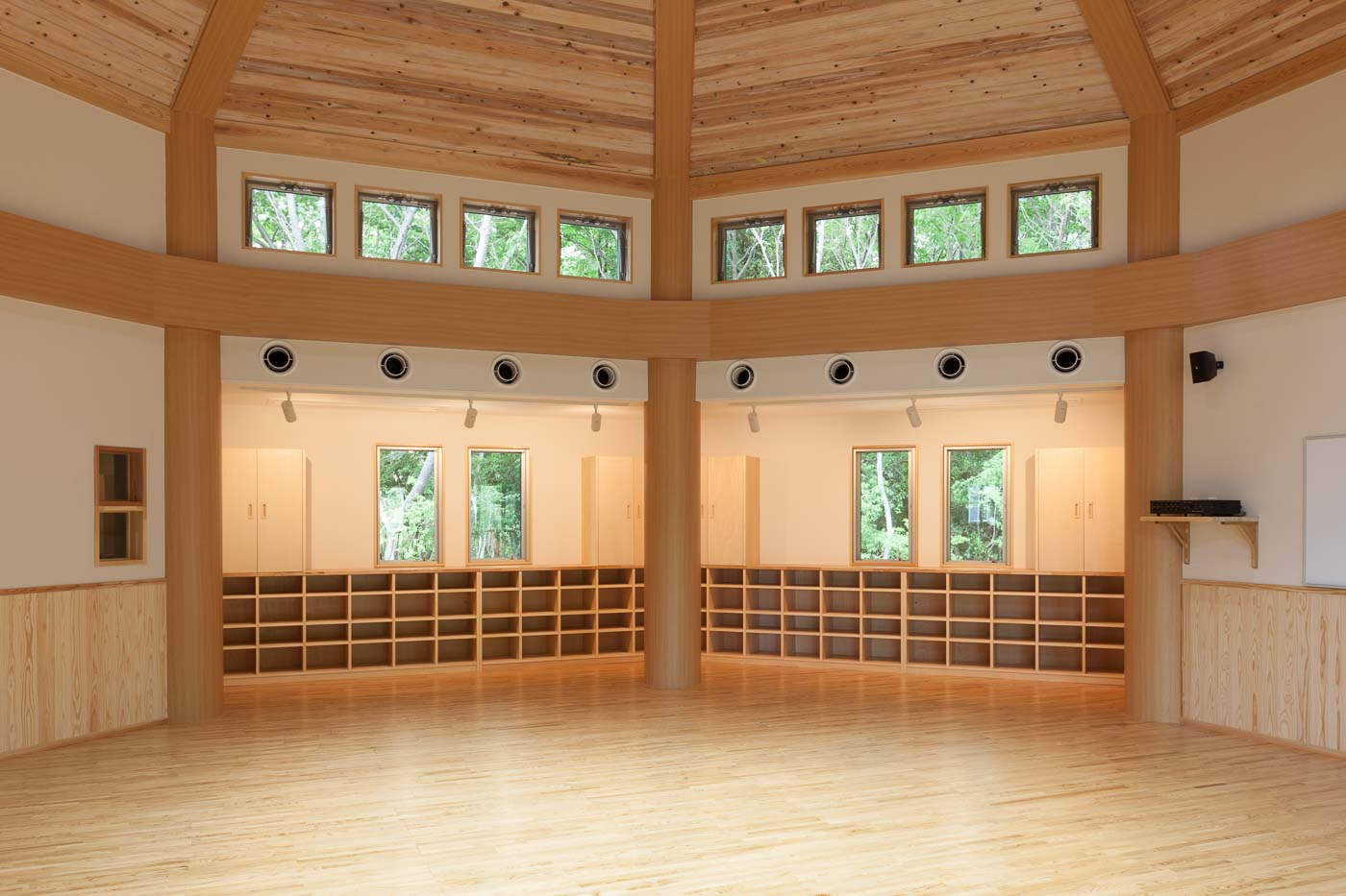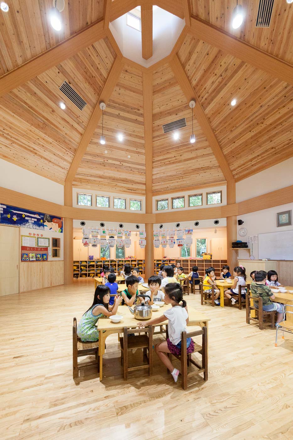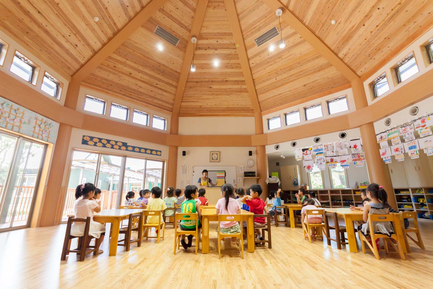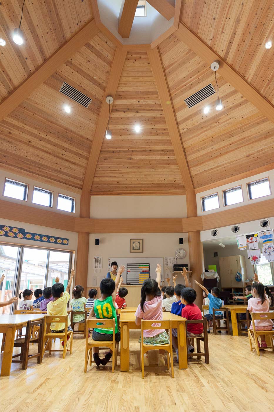 建物の外観は名前の通り、森の中にある大きなきのこをモチーフにデザインしました。建物のてっぺんにある窓からは、太陽の光が保育室の中へさんさんと降りそそぎます。建物の内外には地域産の天然木材(桧、杉等)をふんだんに使いました。木の床は温かく柔らかいので、飛びはねたり寝ころんでも安心です。木の壁は走ってぶつかってもコンクリートの様に硬くないので大丈夫です。木はこども達の心と身体の成長にとても優れた材料なのです。このような自然に溢れた豊かな環境で、子供たちが活き活きと元気に育ってくれることを願っています。