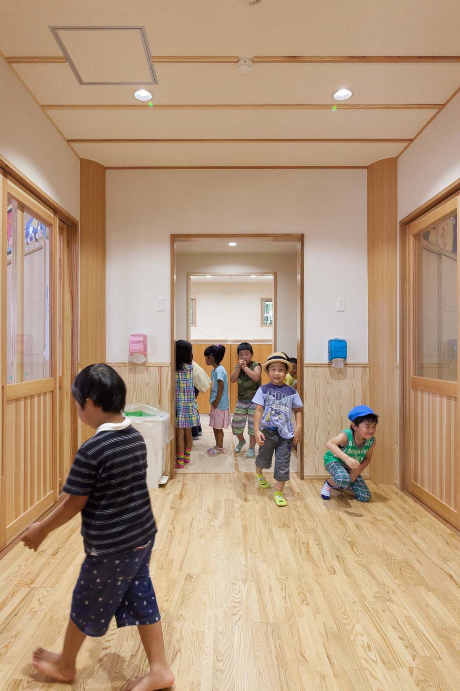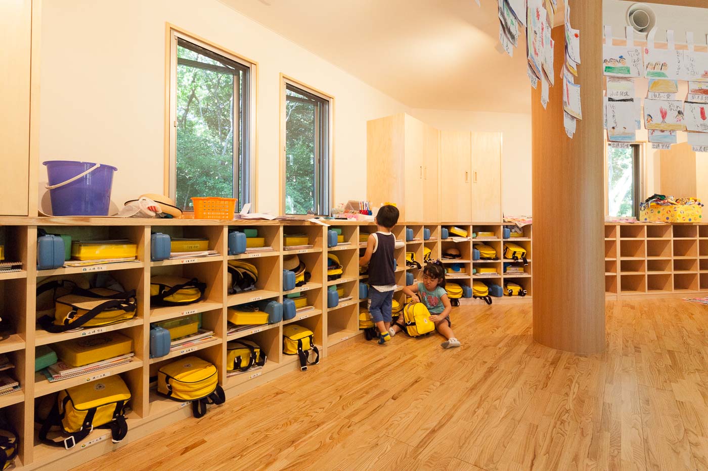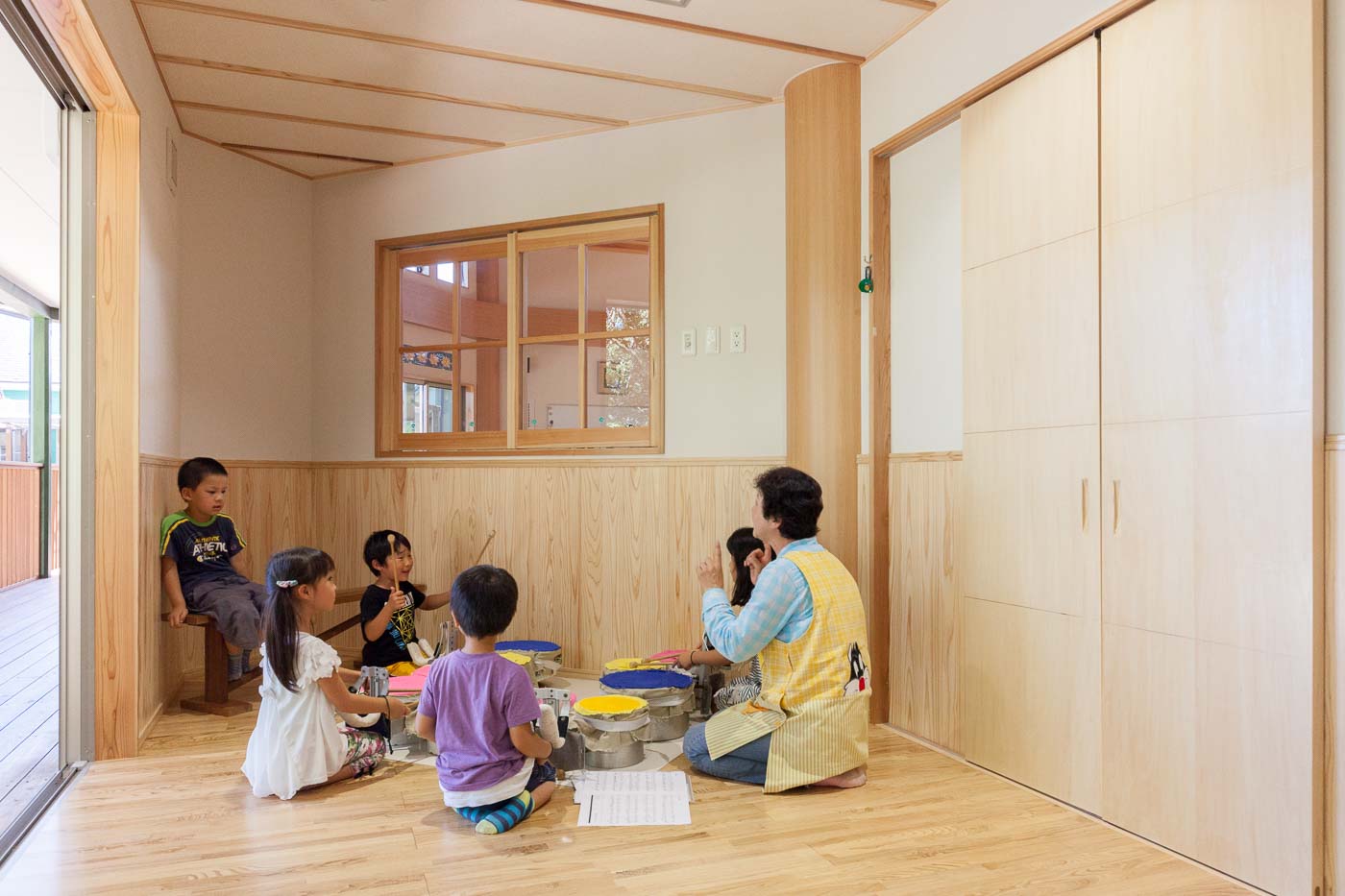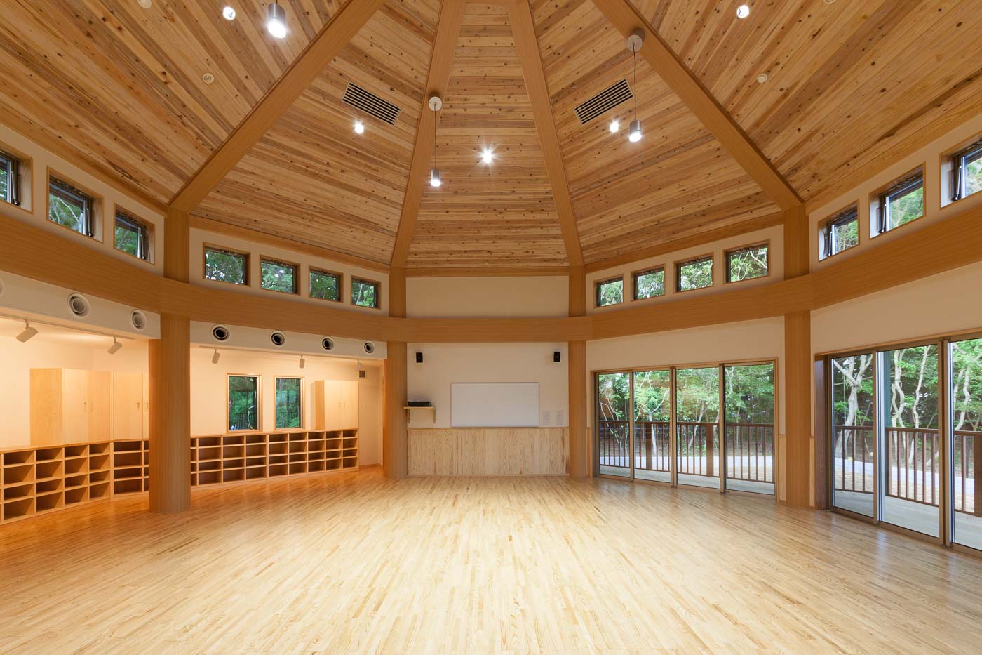 建物の外観は名前の通り、森の中にある大きなきのこをモチーフにデザインしました。建物のてっぺんにある窓からは、太陽の光が保育室の中へさんさんと降りそそぎます。建物の内外には地域産の天然木材(桧、杉等)をふんだんに使いました。木の床は温かく柔らかいので、飛びはねたり寝ころんでも安心です。木の壁は走ってぶつかってもコンクリートの様に硬くないので大丈夫です。木はこども達の心と身体の成長にとても優れた材料なのです。このような自然に溢れた豊かな環境で、子供たちが活き活きと元気に育ってくれることを願っています。