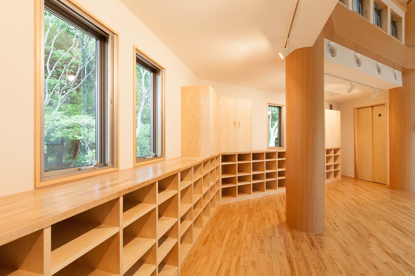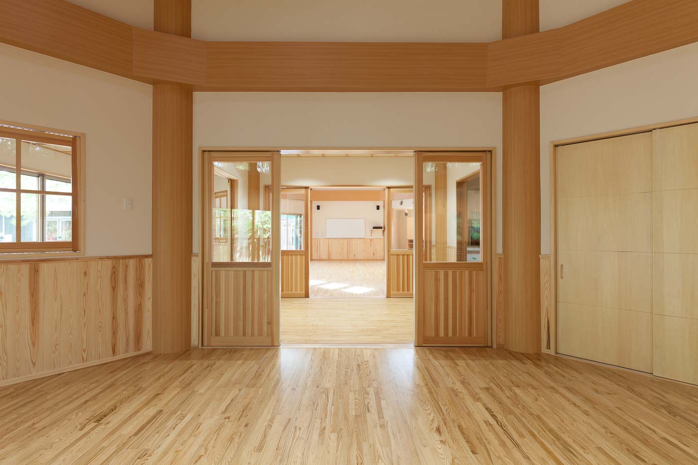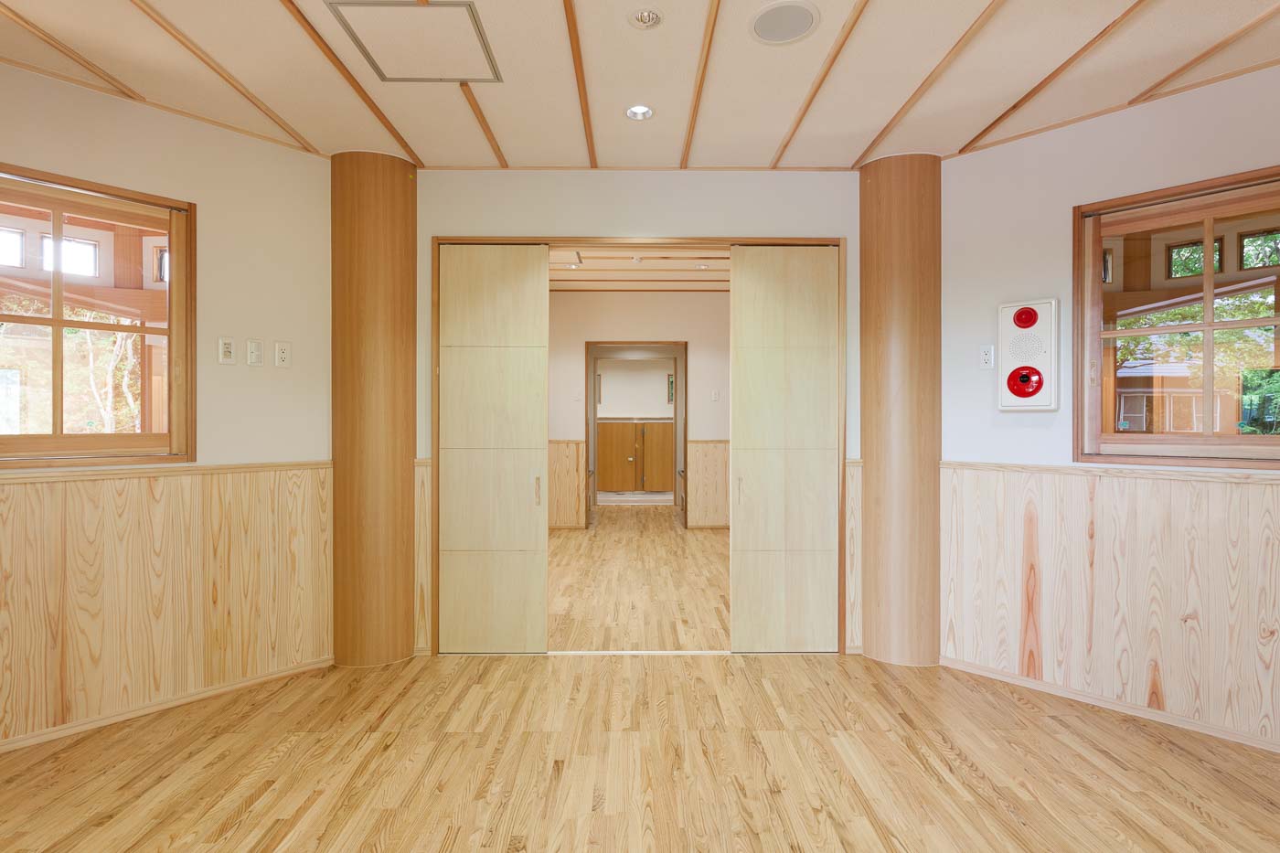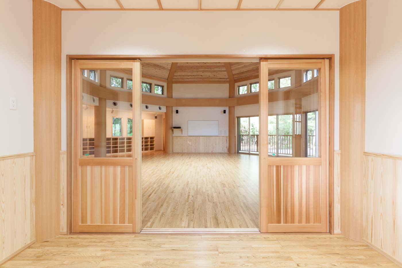 建物の外観は名前の通り、森の中にある大きなきのこをモチーフにデザインしました。建物のてっぺんにある窓からは、太陽の光が保育室の中へさんさんと降りそそぎます。建物の内外には地域産の天然木材(桧、杉等)をふんだんに使いました。木の床は温かく柔らかいので、飛びはねたり寝ころんでも安心です。木の壁は走ってぶつかってもコンクリートの様に硬くないので大丈夫です。木はこども達の心と身体の成長にとても優れた材料なのです。このような自然に溢れた豊かな環境で、子供たちが活き活きと元気に育ってくれることを願っています。