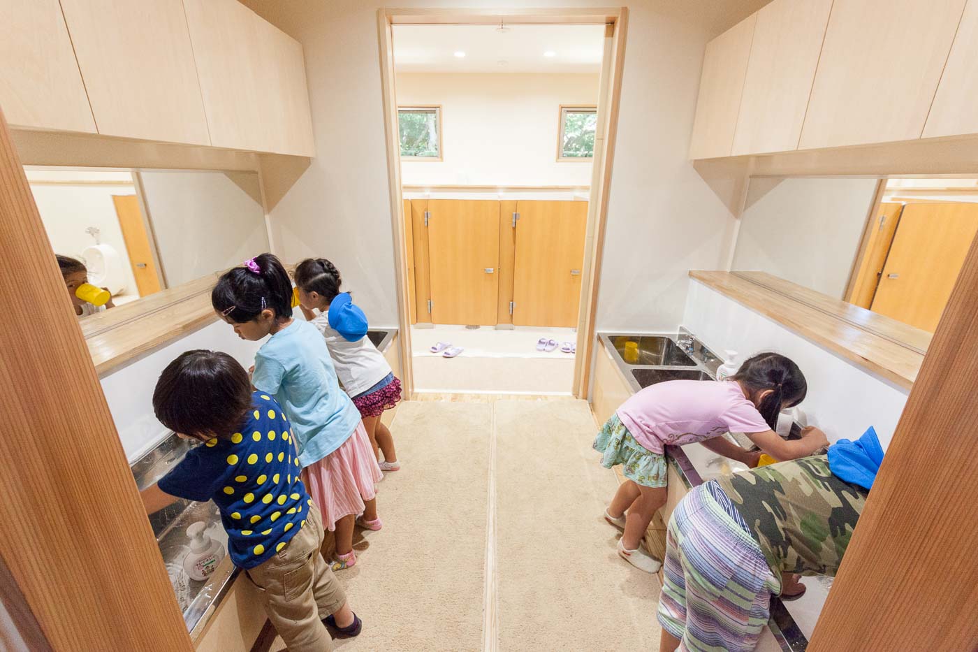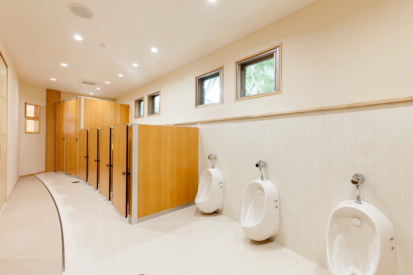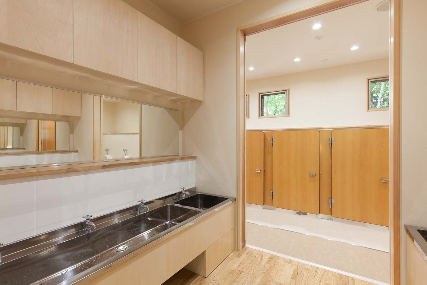 来園してくださる方の為に、大人専用トイレ棟も作りました。大屋根が二つ・子屋根が一つ並び、お父さんお母さん子どものきのこが立っているような外観であった為「きのこ棟」という名称にしました。