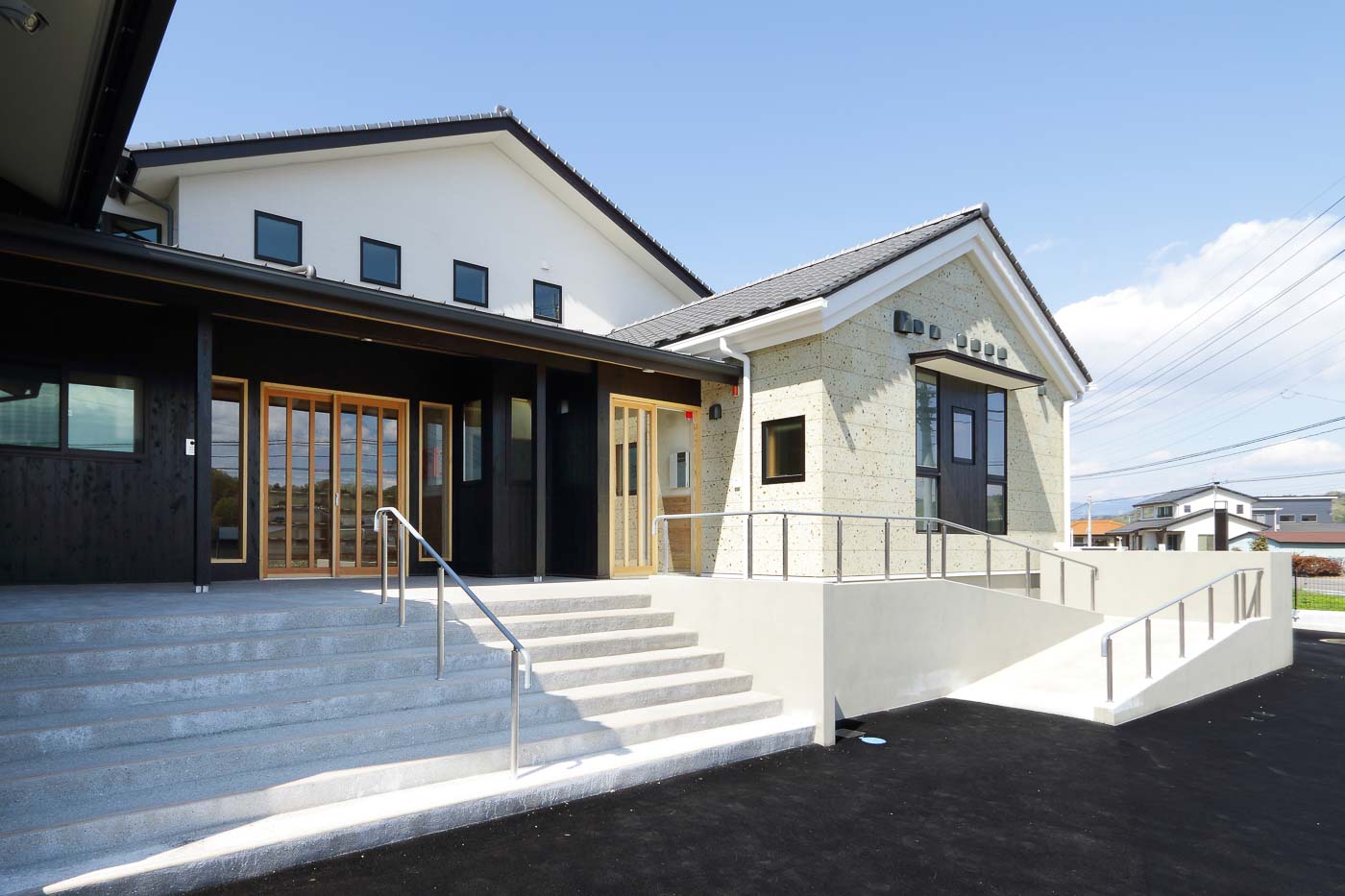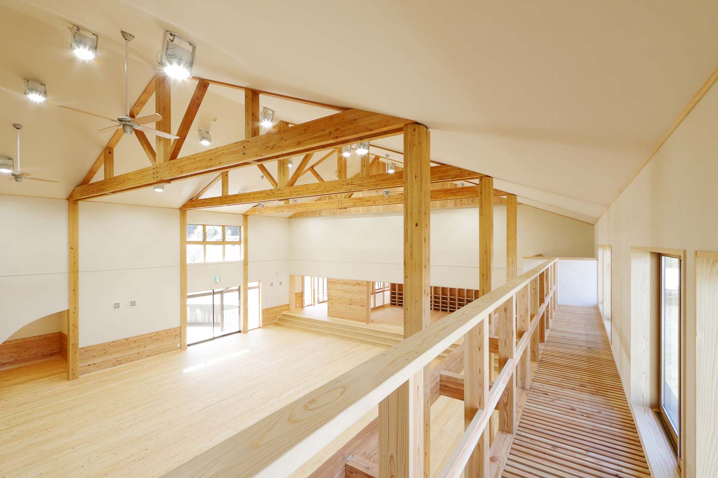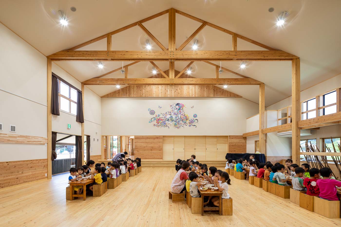 建物形状は、サンプリングした伝統建築をモチーフに大きな切妻屋根とし、屋根瓦には、かつてこの地方で製造されていた十能瓦を復元して使用、壁は焼杉と石蔵を踏襲しました。また世界遺産であり富岡市のシンボルである“富岡製糸場”において、日本で初めて採用された洋トラスを取り入れ、この園舎のデザイン的特徴の一つとしました。