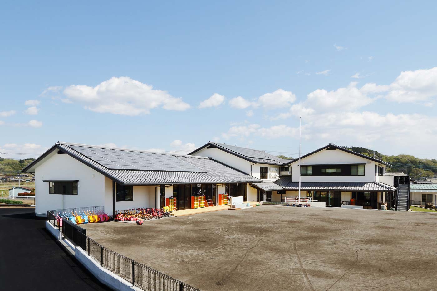 幼保連携型認定こども園“めぶきの森”(旧妙義保育園 1981年創立)は、豊かな自然環境に恵まれた緩やかな丘陵地に計画されました。世界遺産の富岡製糸場から南西へ数キロの場所で、敷地の西側に妙義山を仰ぐ風光明媚な場所で、その麓には今では古民家となった養蚕農家の家々が点在し、独特な建築様式とその情景は、かつての地域の暮らしと歴史を物語っています。こうした素晴らしい環境が子供たちの原風景となる事を創造しながら計画しました。