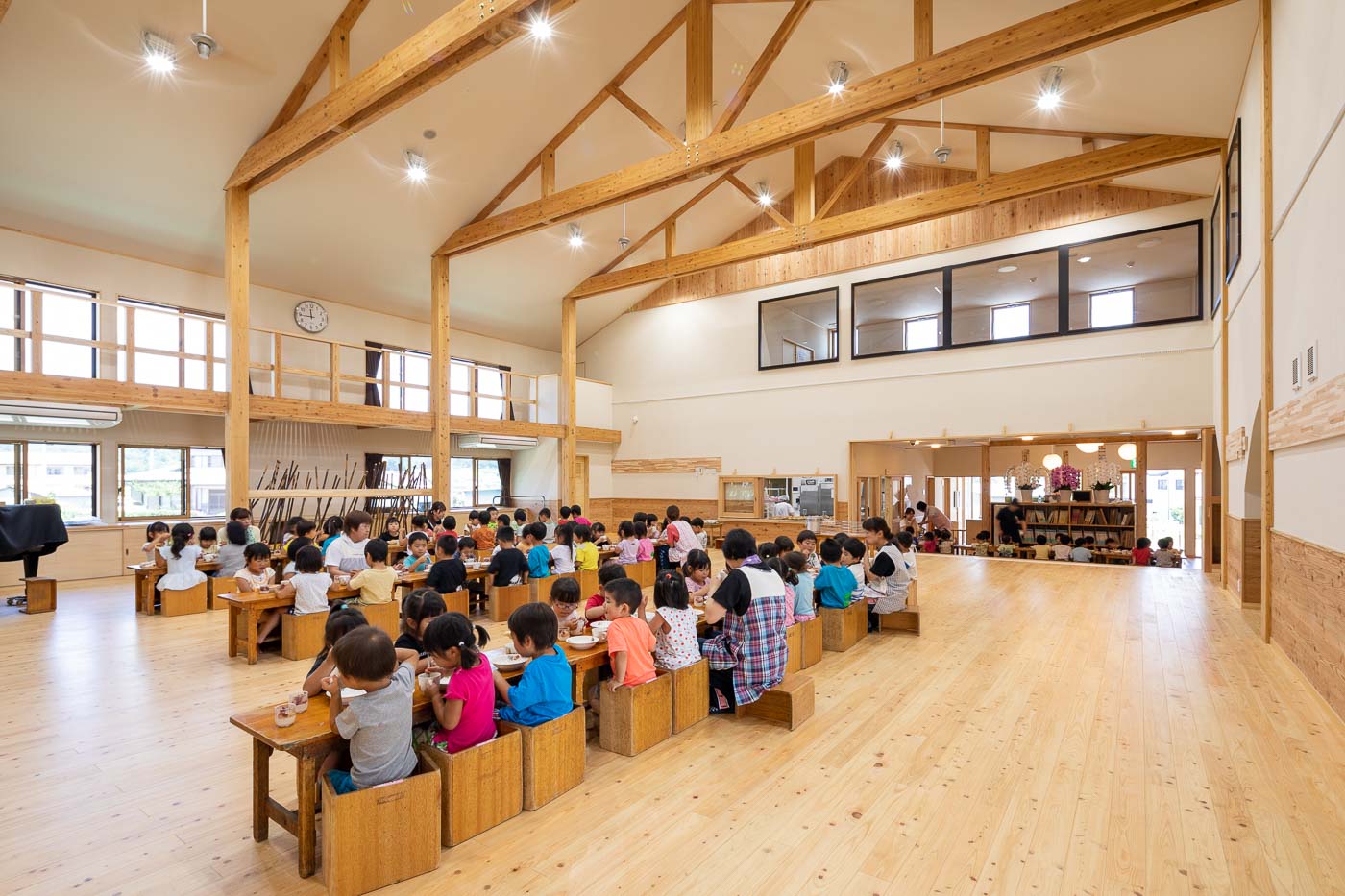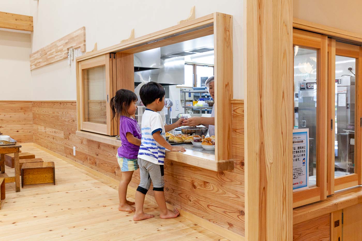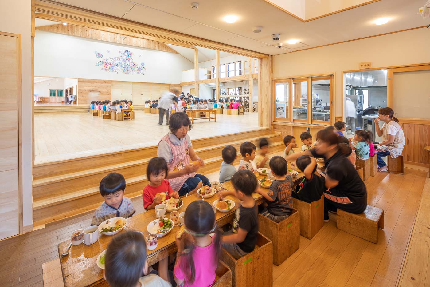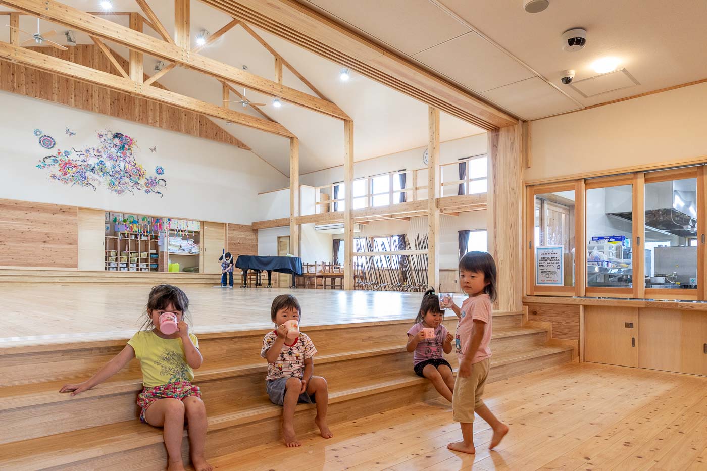 食育の観点から、調理室は玄関入って直ぐの遊戯室に面して設け、子どもたちと調理の先生方がお互い顔の見える配置としました。