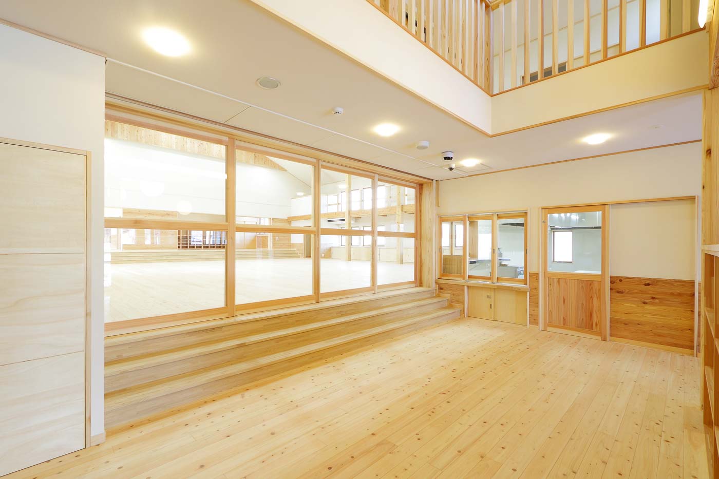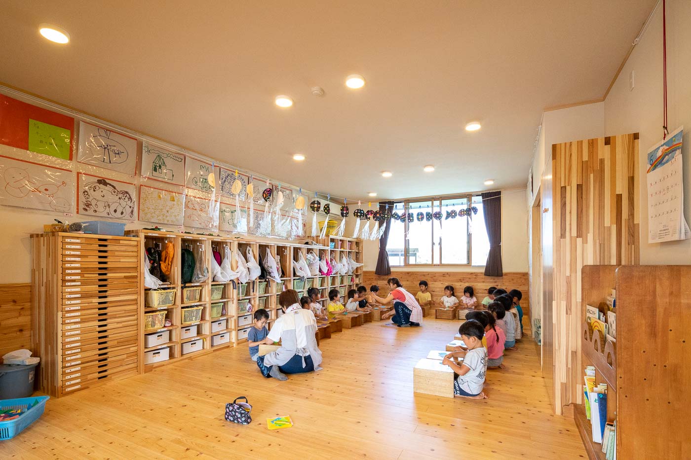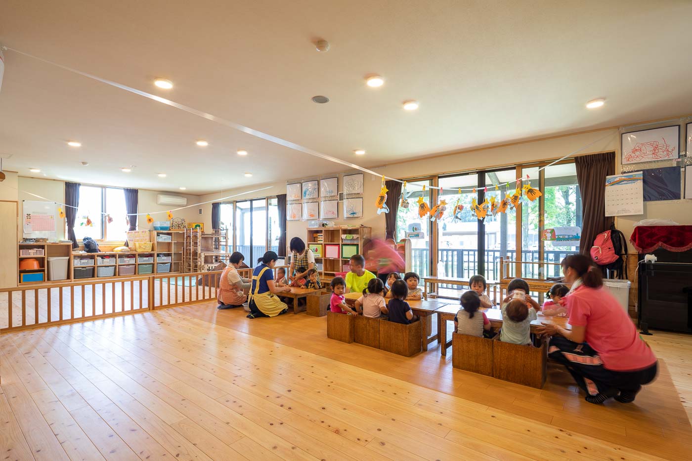 食育の観点から、調理室は玄関入って直ぐの遊戯室に面して設け、子どもたちと調理の先生方がお互い顔の見える配置としました。