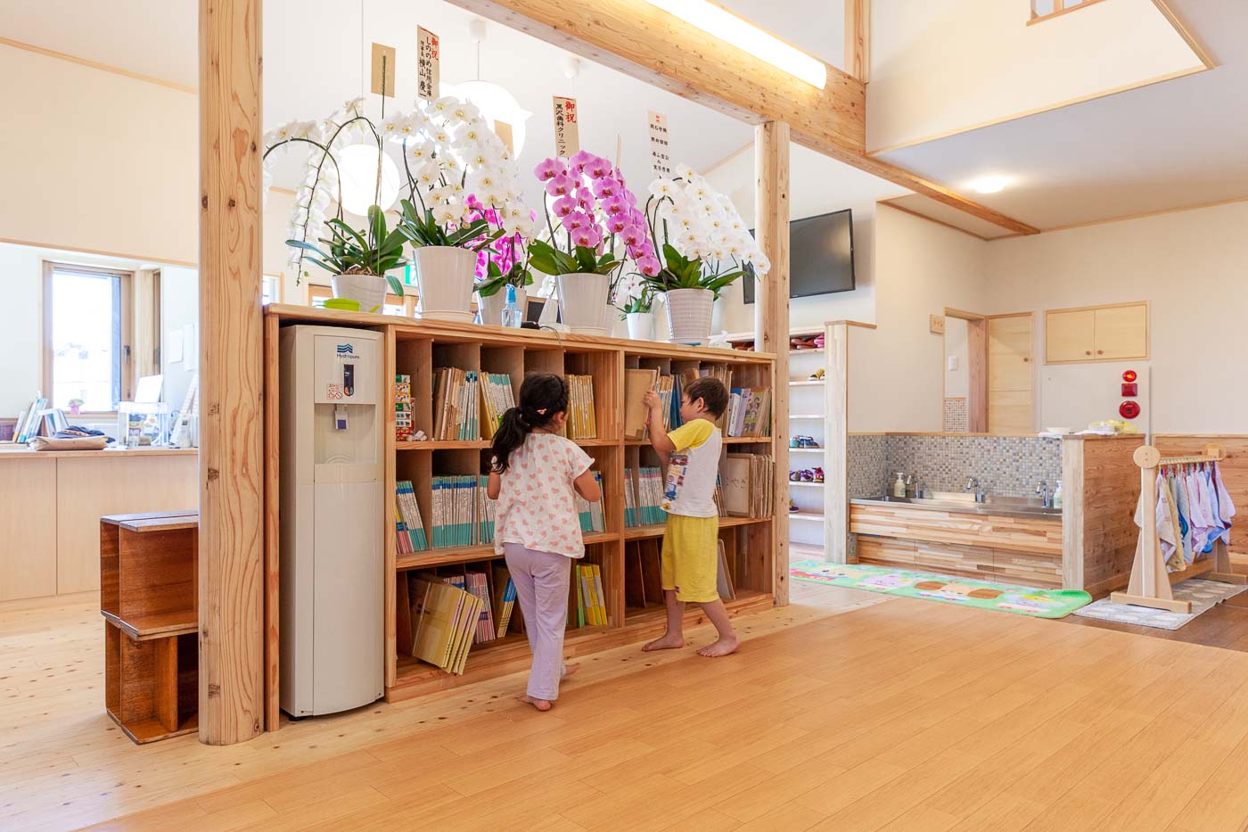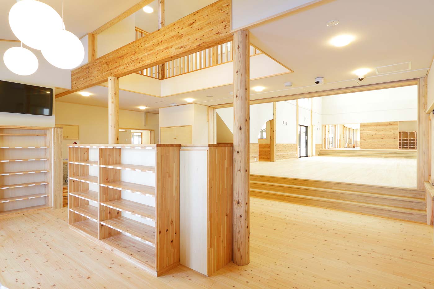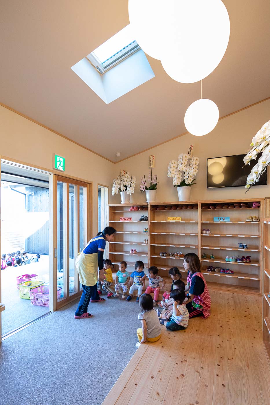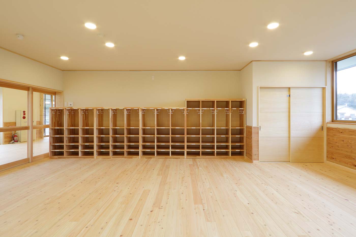 食育の観点から、調理室は玄関入って直ぐの遊戯室に面して設け、子どもたちと調理の先生方がお互い顔の見える配置としました。