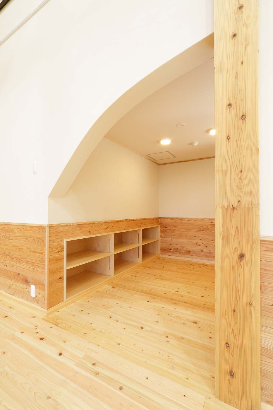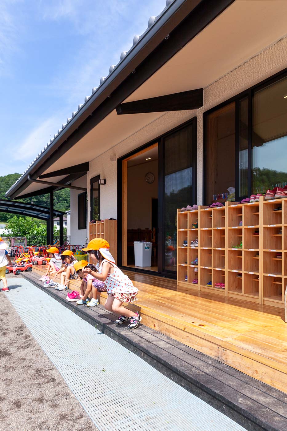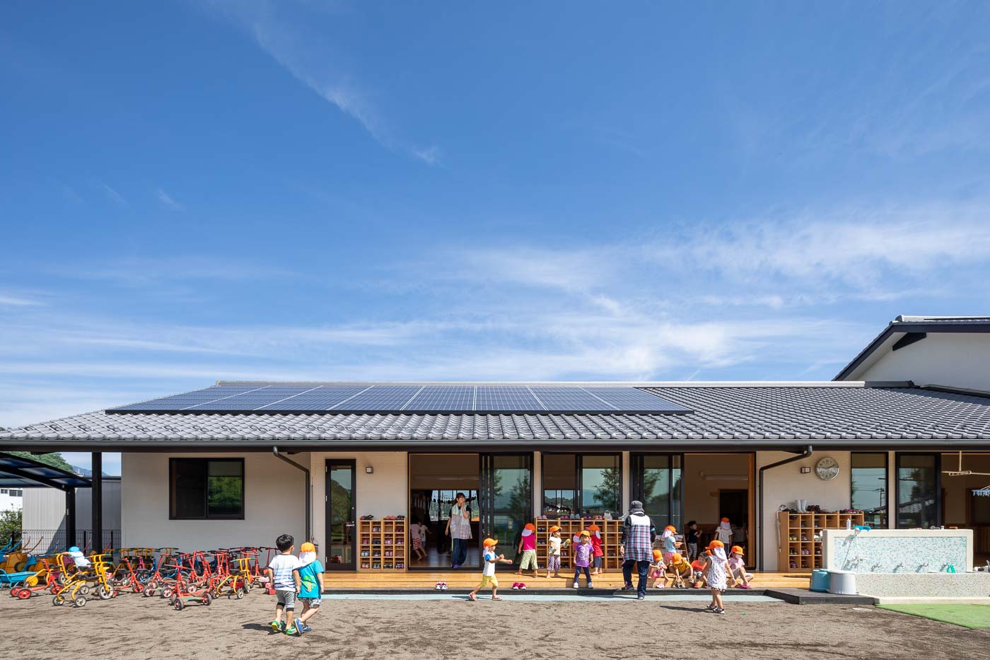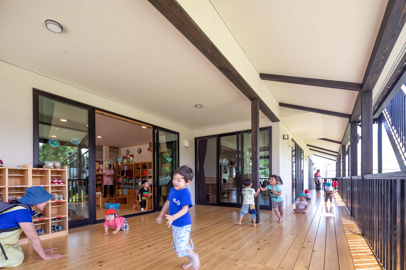 風が通り、陽の温もりを感じる、縁側や土間といった日本民家の空間要素を現代建築として活用しました。縁側(デッキテラス)は平面構成の大きな特徴で、各室間を連続させ、県産材ヒノキの床、珪藻土の壁、杉の建具・家具など子供たちは自然素材の中で生活します。
