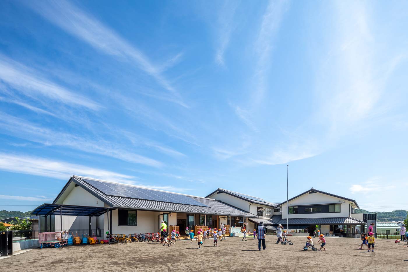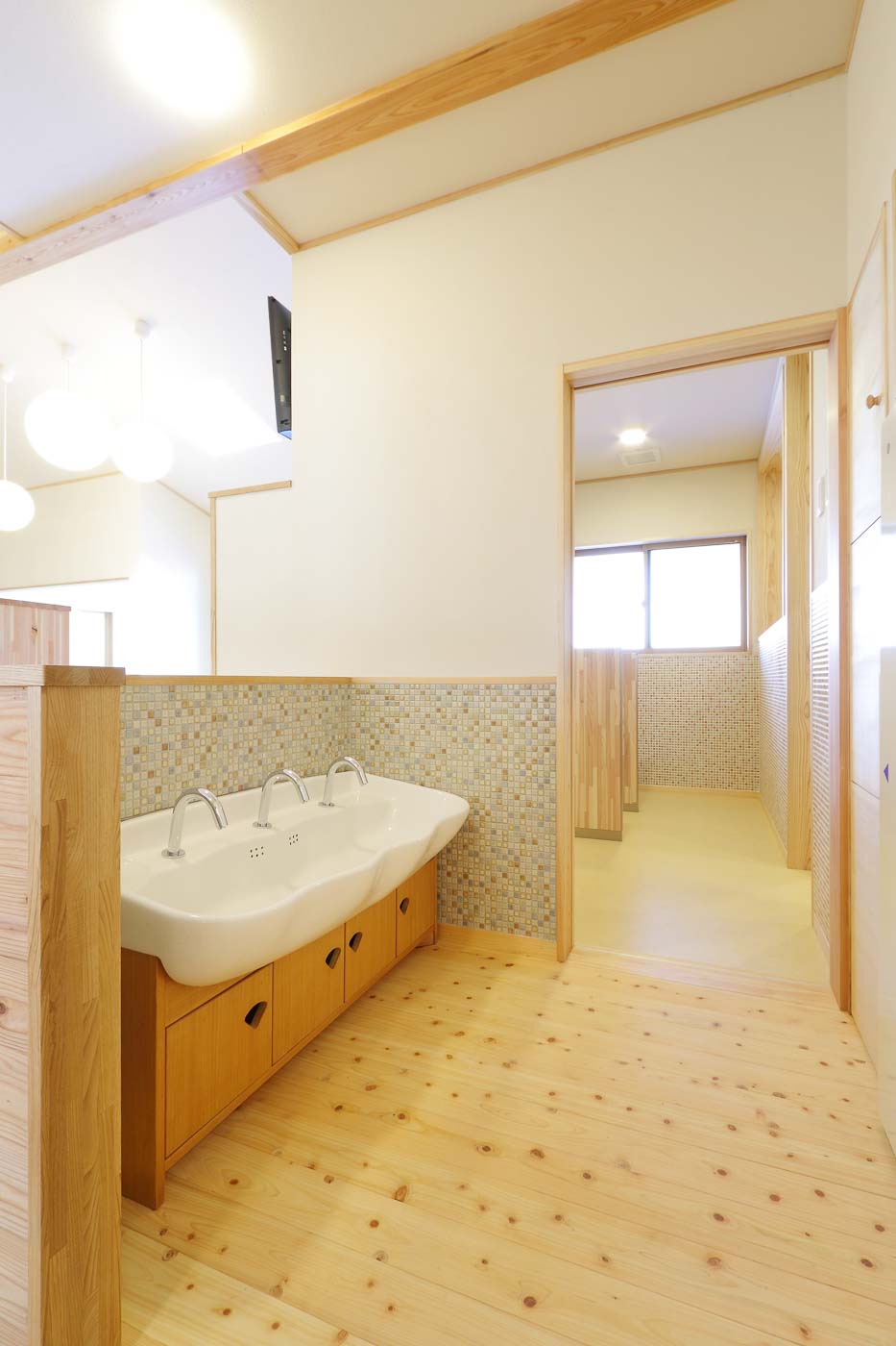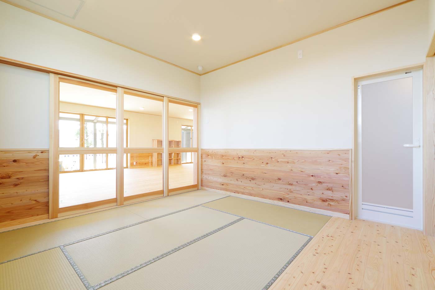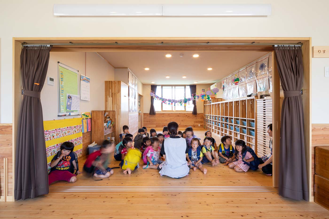 風が通り、陽の温もりを感じる、縁側や土間といった日本民家の空間要素を現代建築として活用しました。縁側(デッキテラス)は平面構成の大きな特徴で、各室間を連続させ、県産材ヒノキの床、珪藻土の壁、杉の建具・家具など子供たちは自然素材の中で生活します。