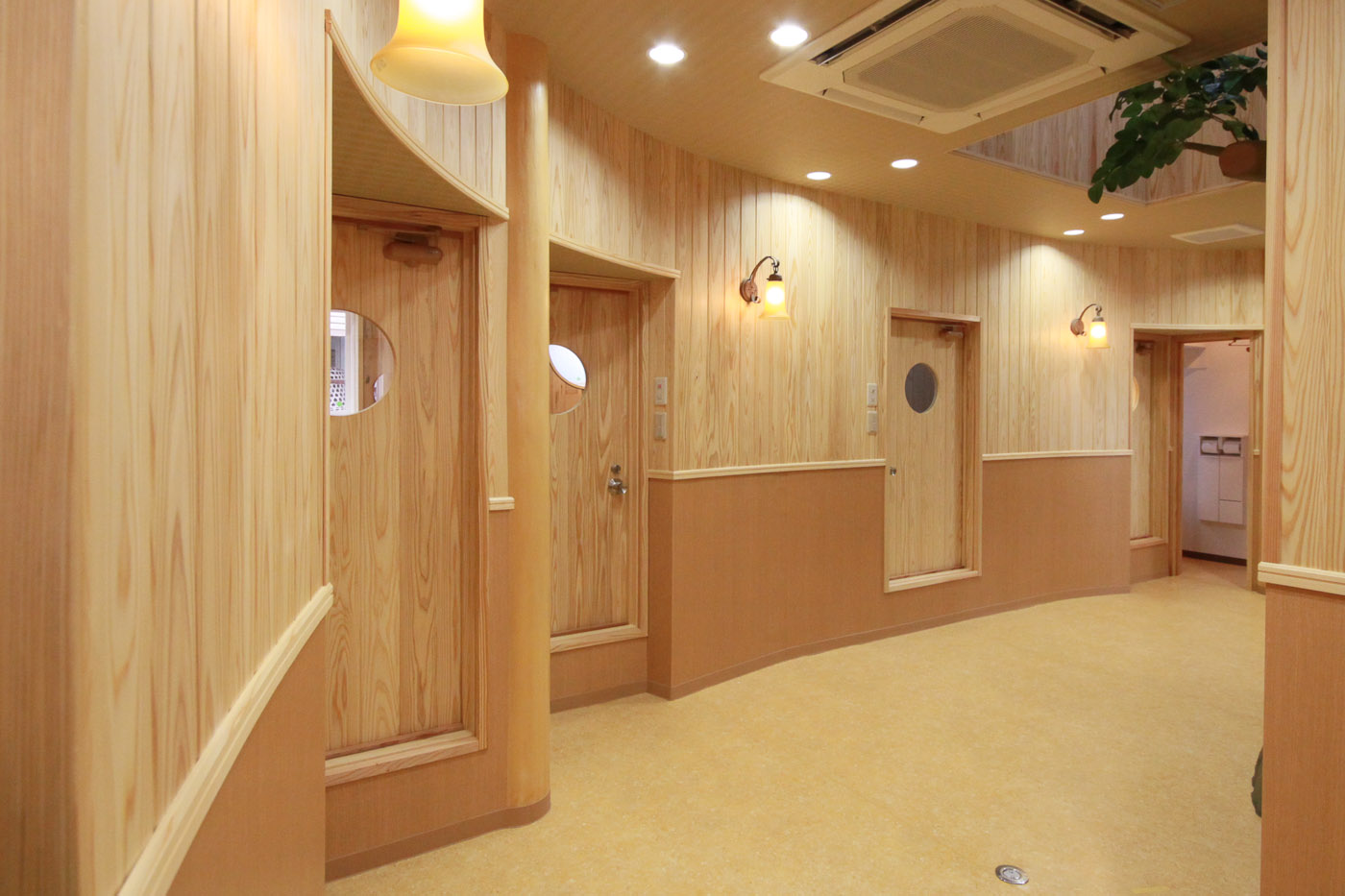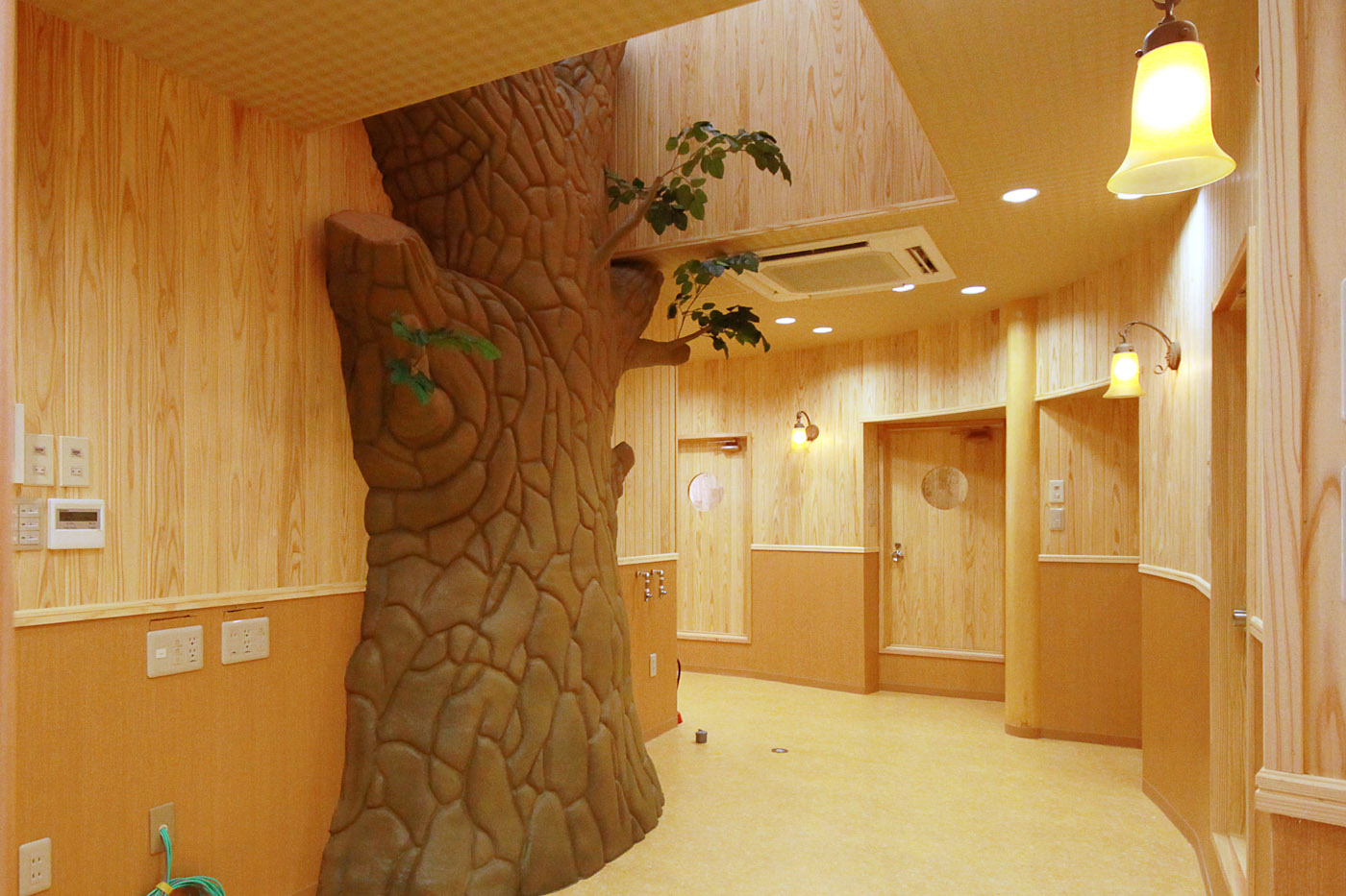 森の中をイメージしたドッグホテルと、海をイメージしたドッグサロン。主役である「ワンちゃん」が楽しく安心して過ごせる事を第一にプランニングしました。巨大な樫の木のホームツリーが「ワンちゃん」たちを出迎えます。室内は、白とナチュラルな木の組合わせで明るく清潔に。