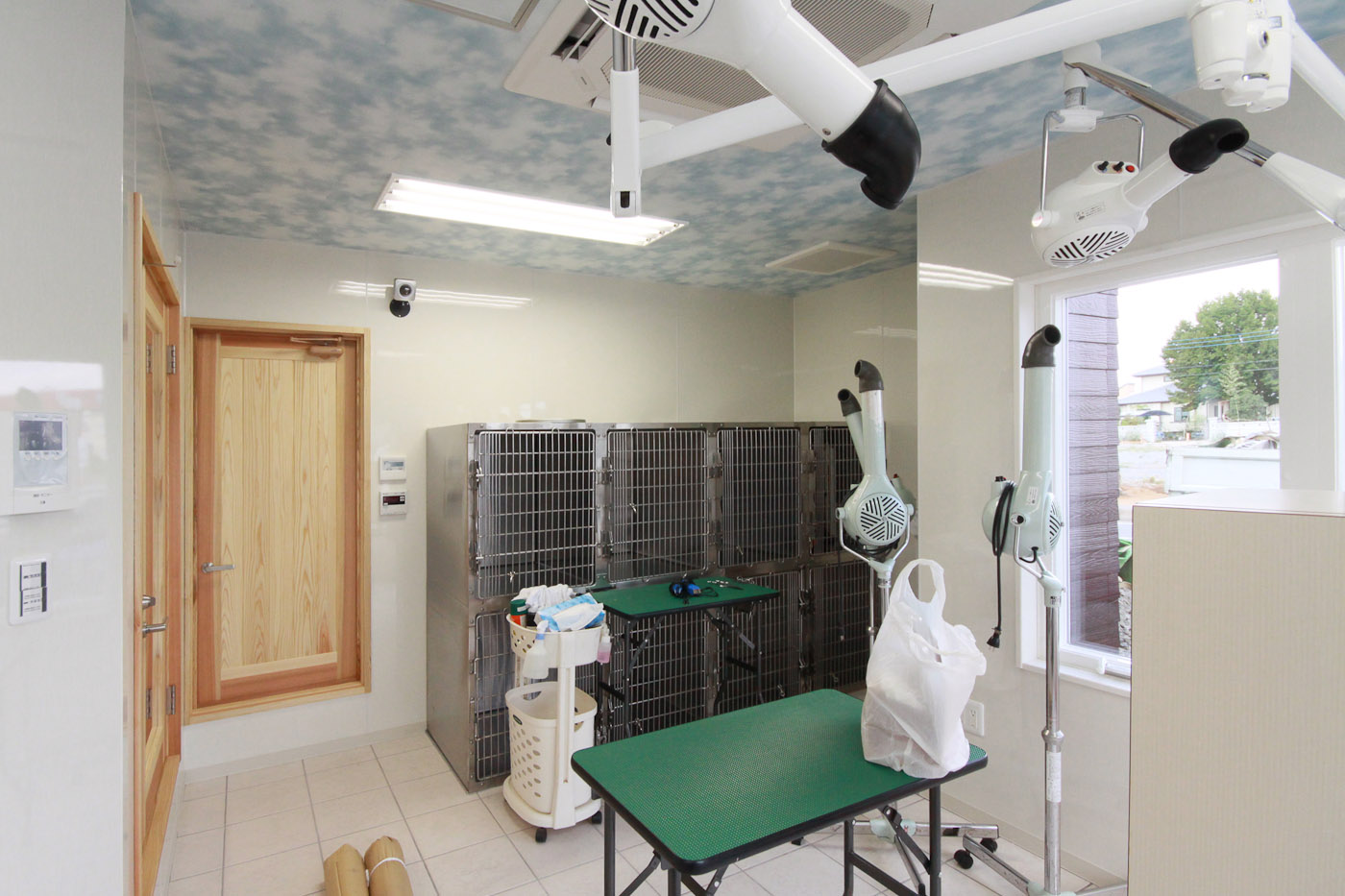 1F | 玄関、処置室、犬宿泊室(1~7)、通路、トイレ、住居用玄関、階段 |