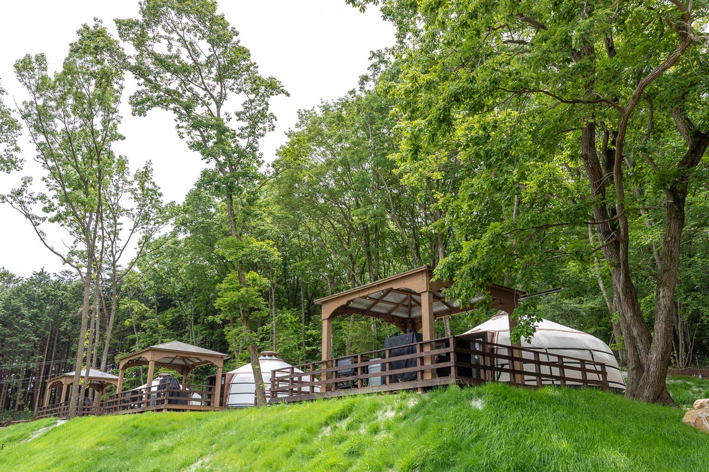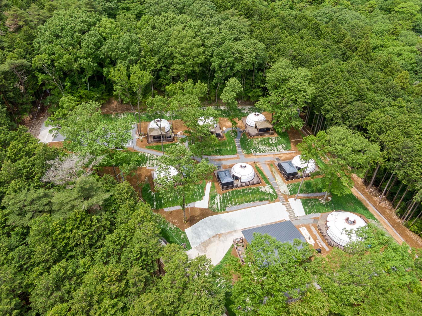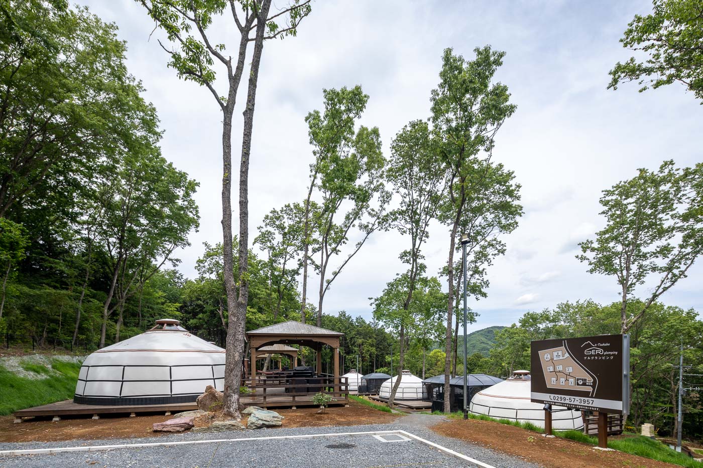筑波山中腹の地形と樹々や植物を活かした、自然環境に溶け込んだランドスケープデザインとする為に、敷地内の大きな広葉樹を一本一本測量して図面に書き入れました。そして、その木々の間をぬってテントを張るよう計画しました。