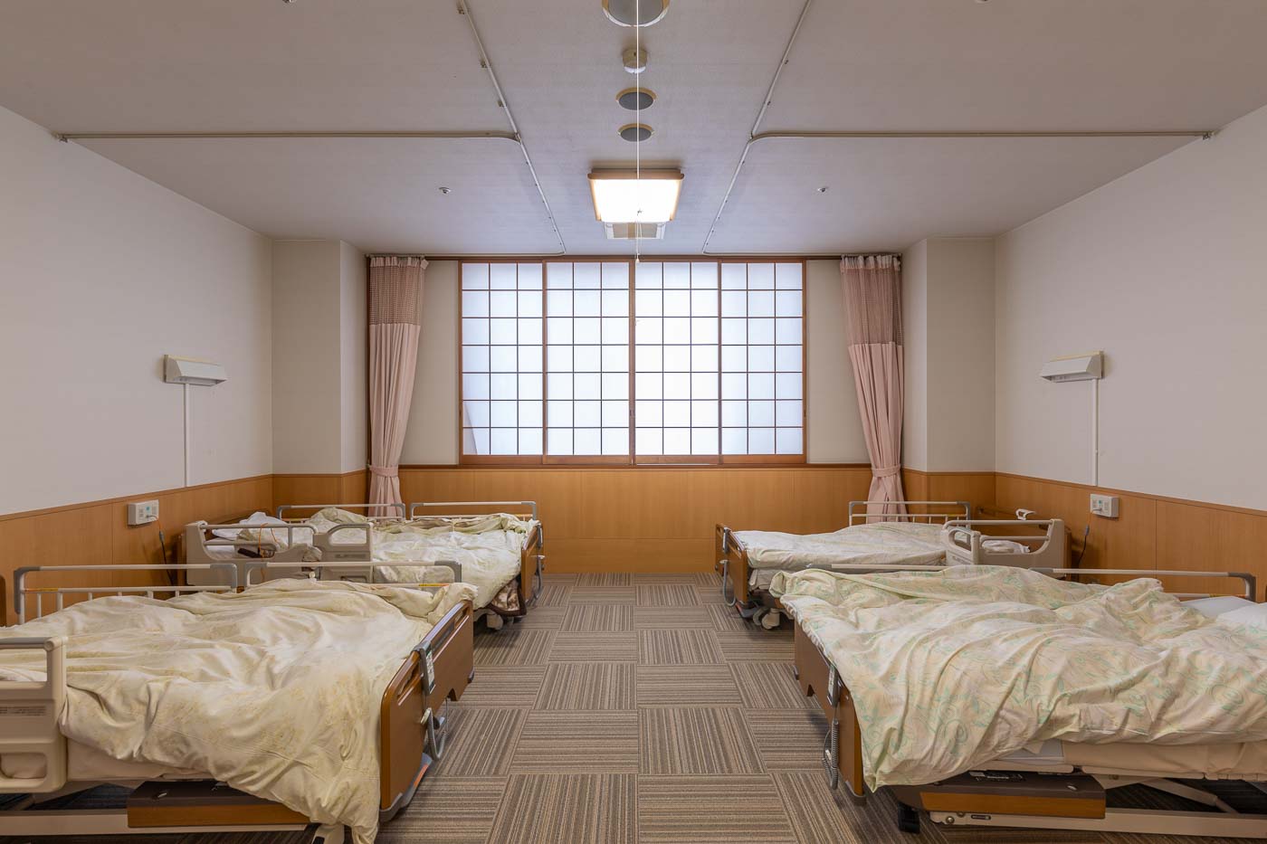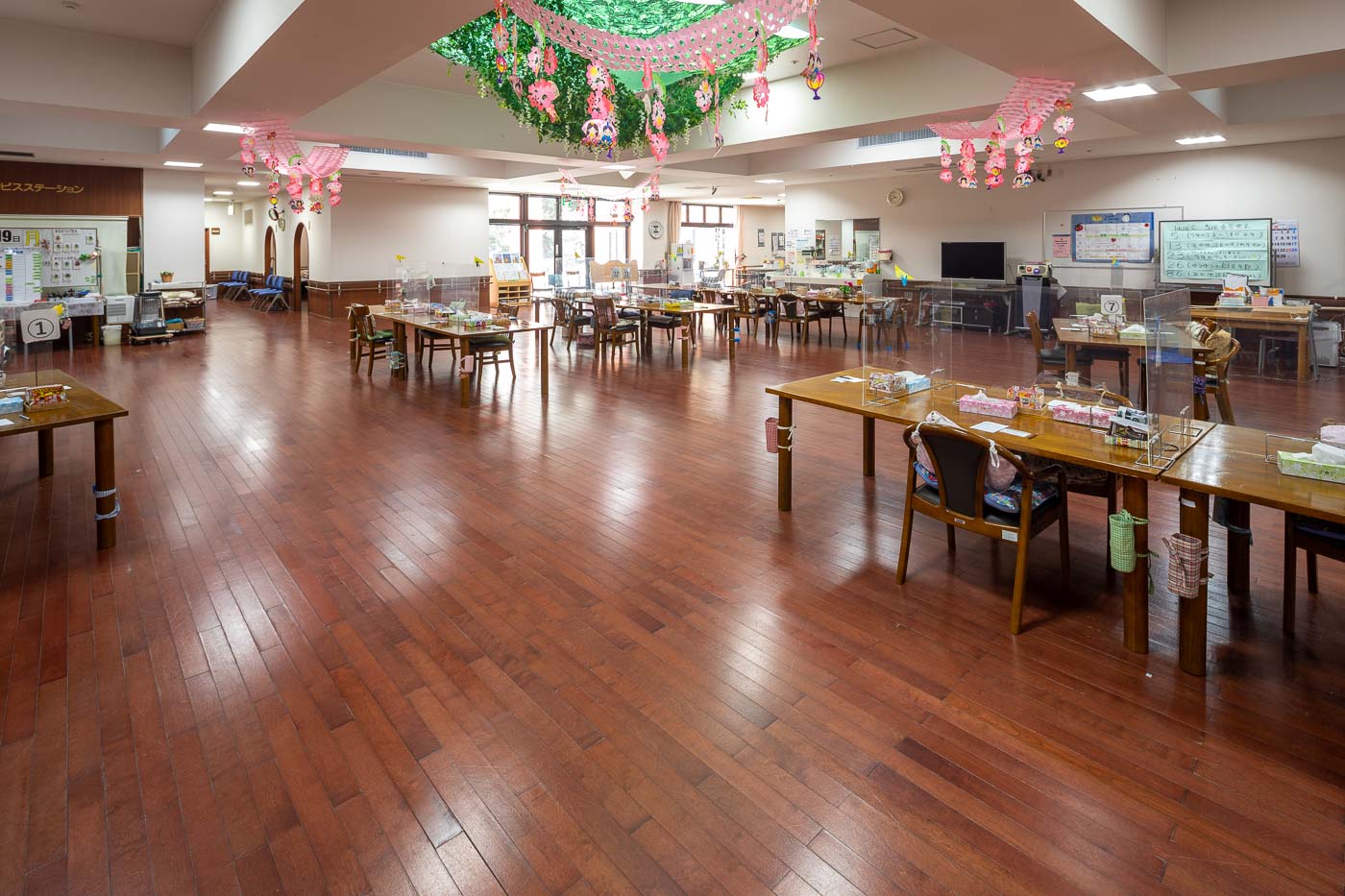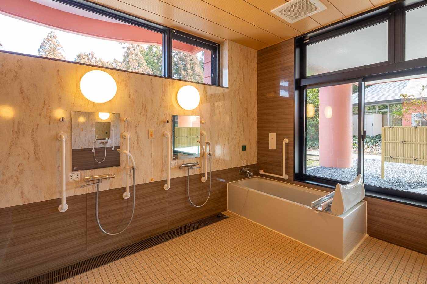 内部は1階のリハビリステーションの床・壁の改修、空調機の交換などを主に行いました。大浴場と脱衣室は、今のニーズに合ったデザイン性と機能性を備えた空間へと一新する事となり、躯体を残して一度内部を解体し、全面的な改修工事となりました。これまでの大浴槽を撤去し、リフト付シャワーキャリーで直接入れる個人用浴槽に入れ替え、床・壁・天井、設備(空調機・換気扇、給排水)、アルミサッシュも新設しました。特別浴室においては、シャワードームを設置しました。