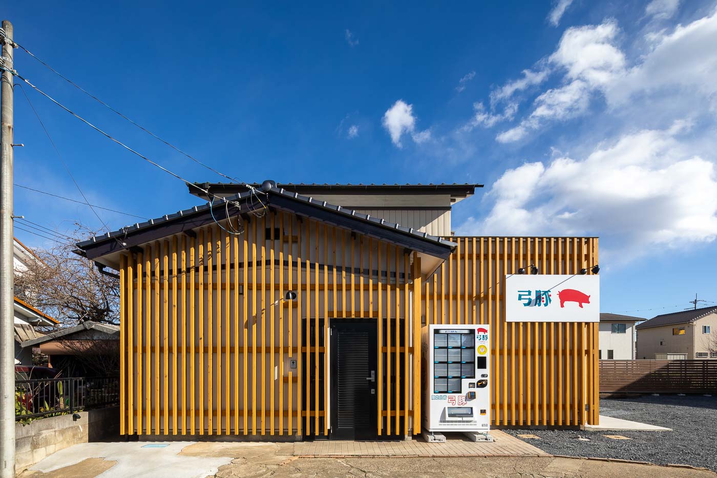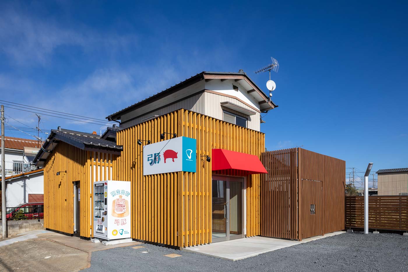 茨城県石岡市東石岡。国道355号線から一歩入った住宅街に佇む、弓野畜産の自社ブランド豚「弓豚」の直売所です。昭和52年築の空き家を再生し、地域に開かれた販売拠点として生まれ変わりました。
